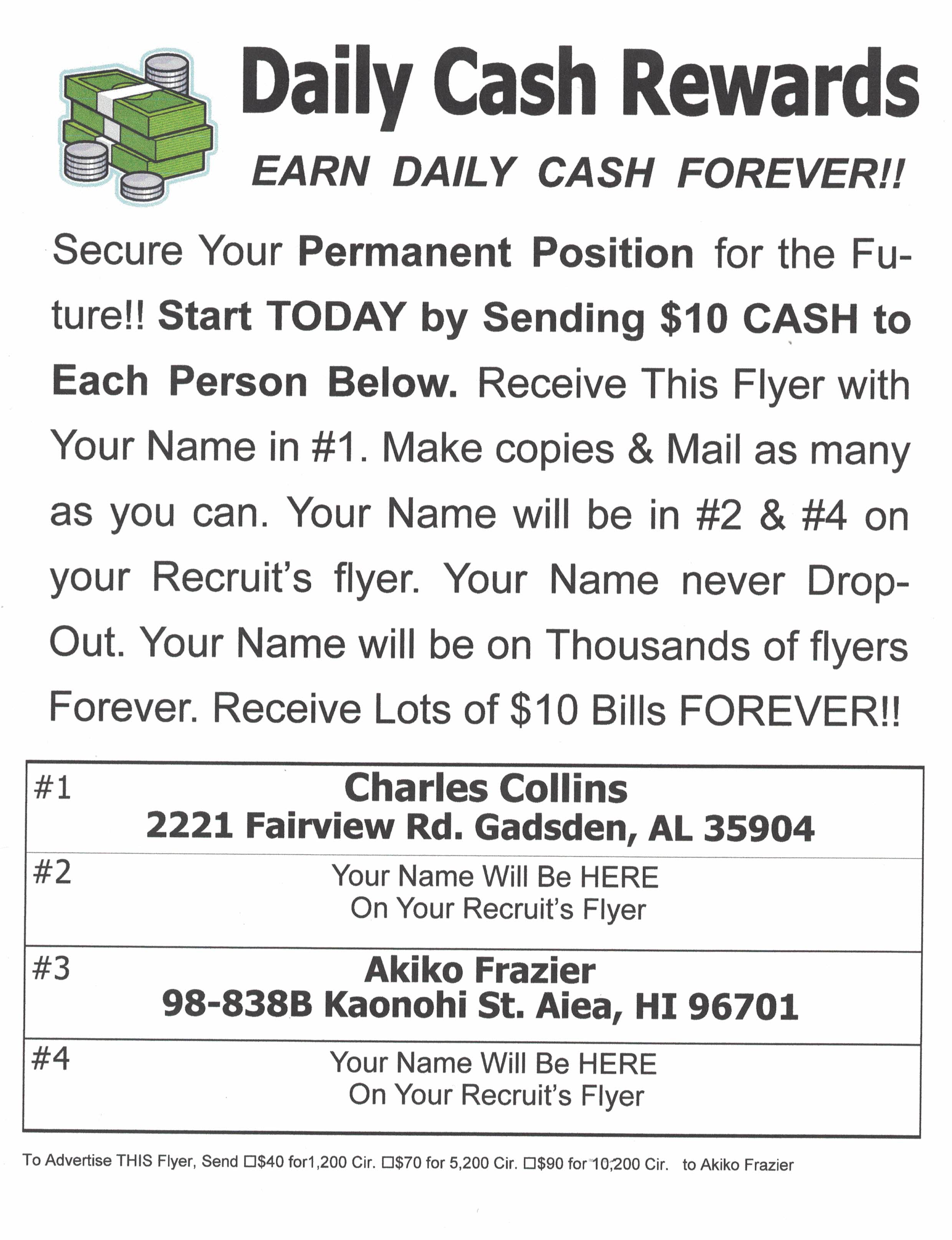 Join this great program that pays a whopping $50 on all people you recruit. Guarantees residual income and play the lotto too! One f/c stamp! Bill Maurer, 2801 Toledo Rd. Apt. 515, Elkhart IN 46516