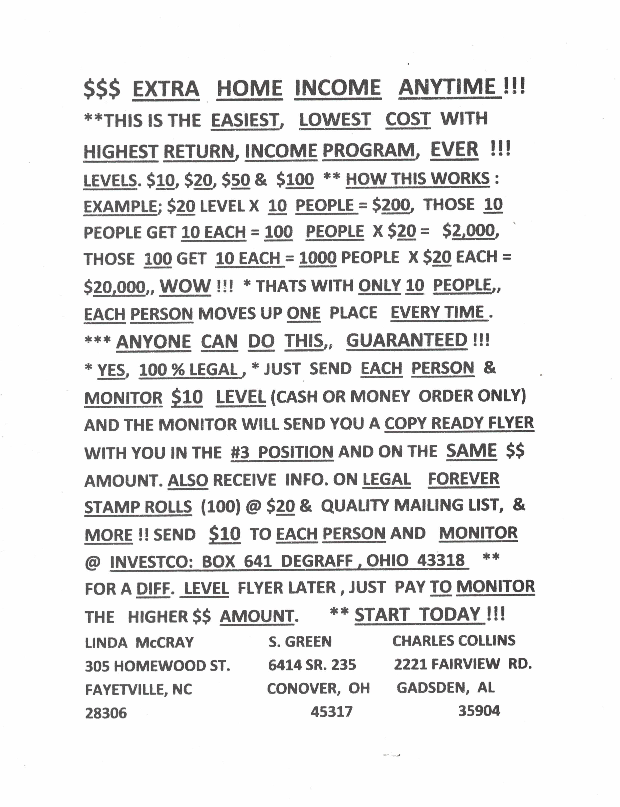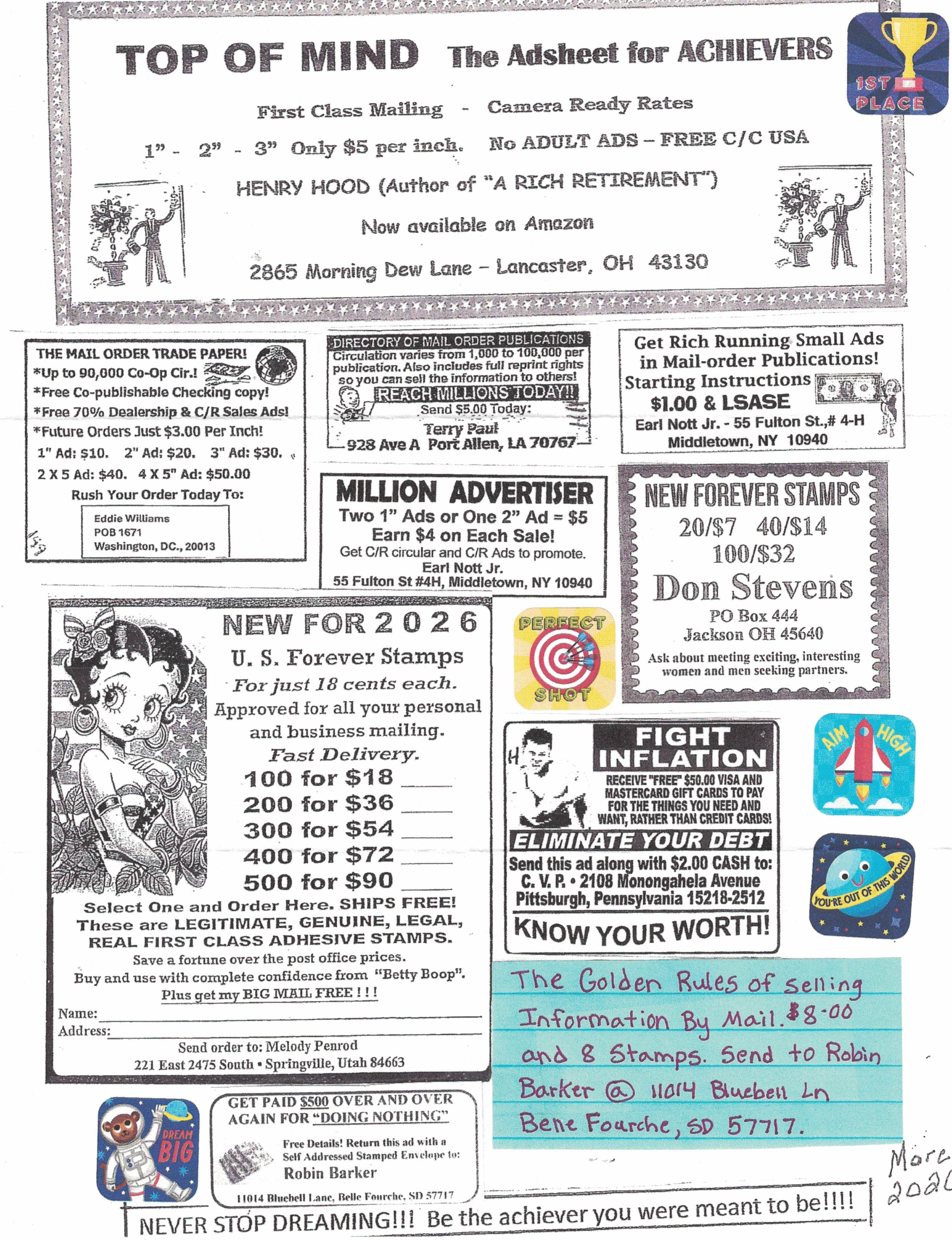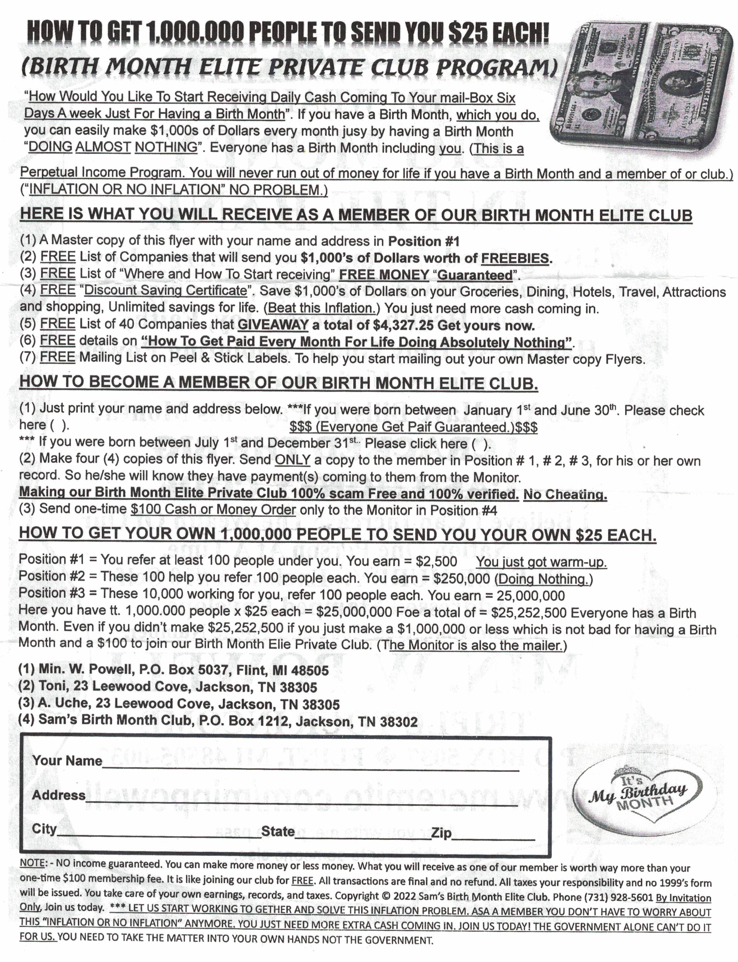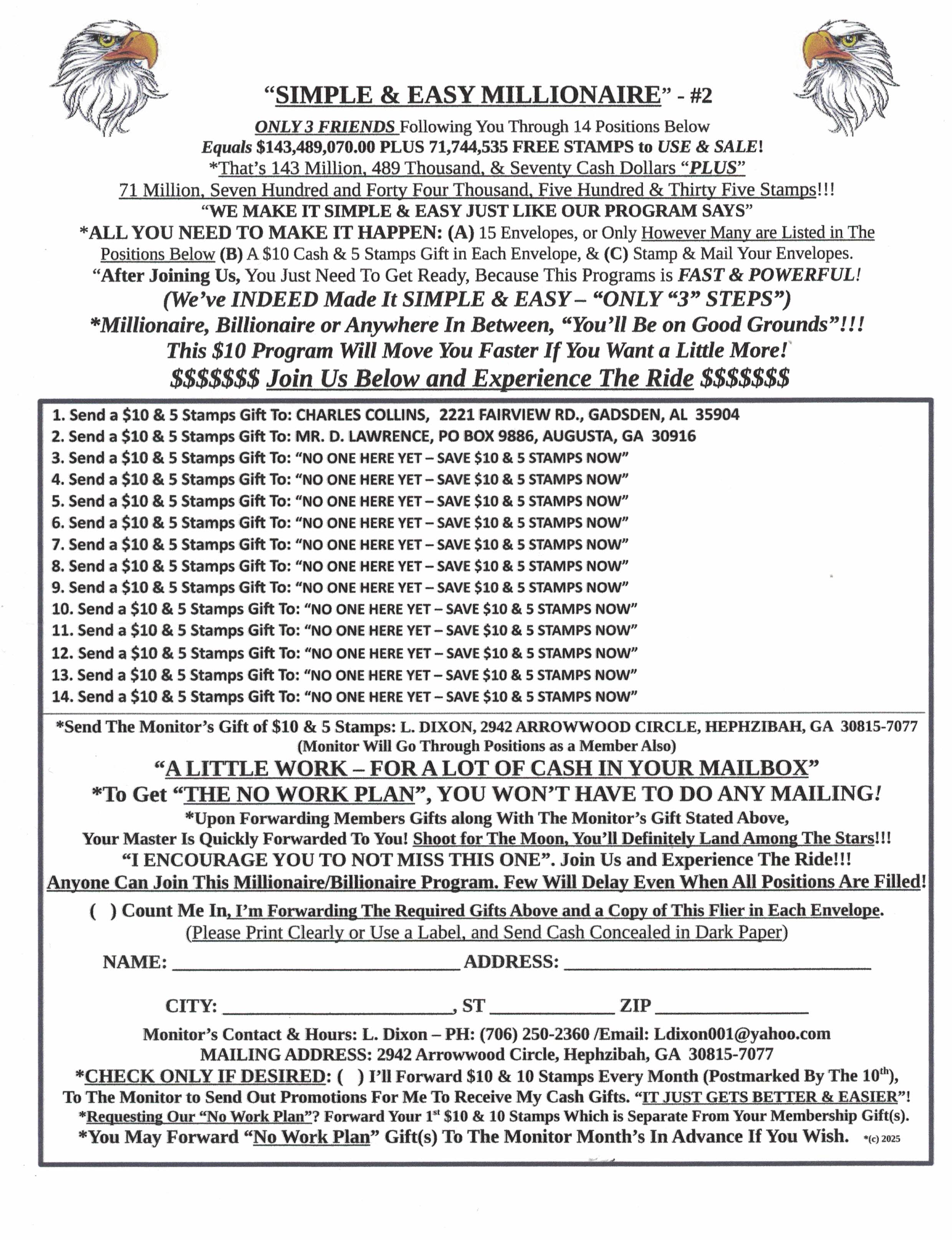 Never be broke again. Join these 20 millionaire programs. Cash will flood your mailbox. Mail $5 + 5 stamps to: Millionaire, PO Box 3084, Memphis TN 38173