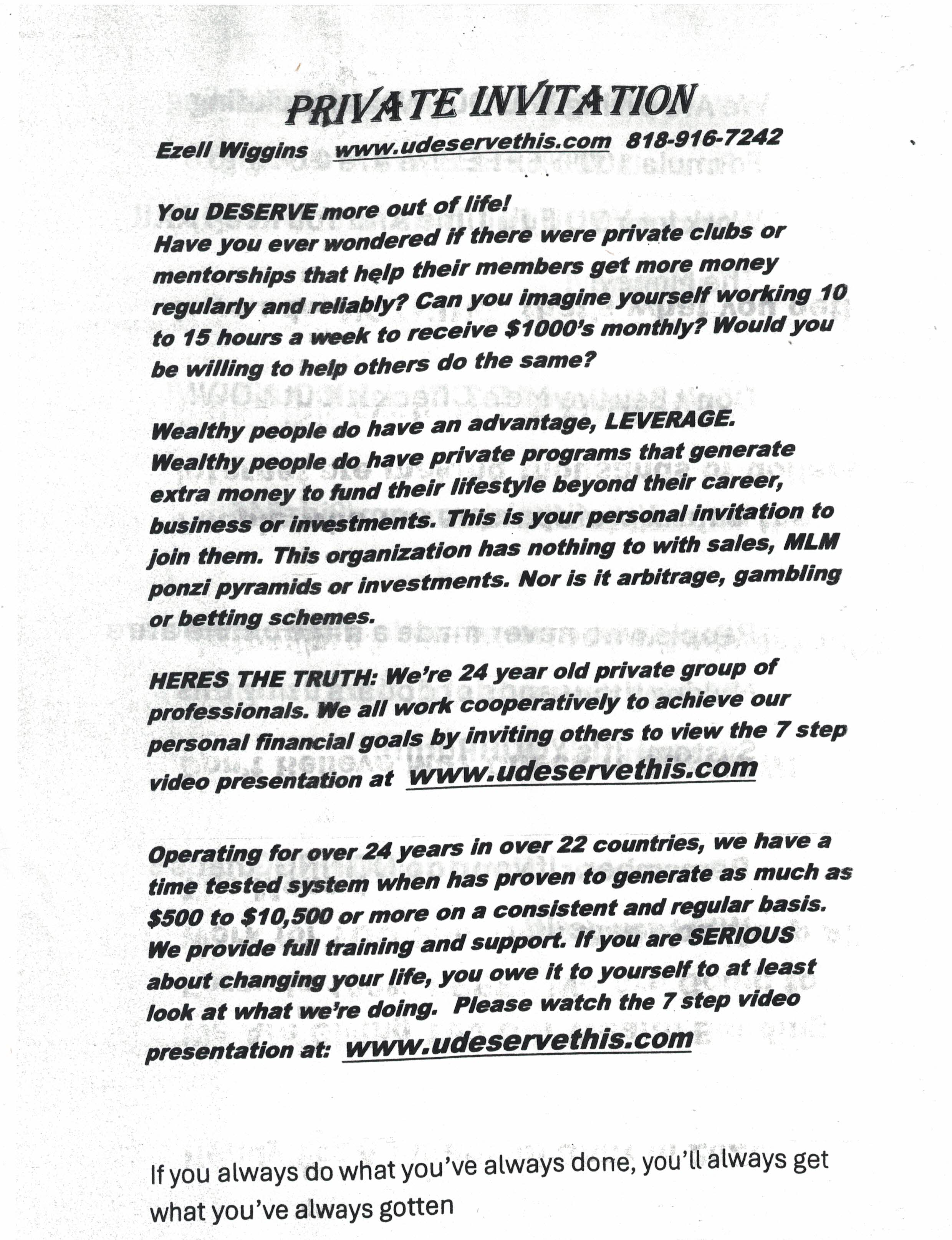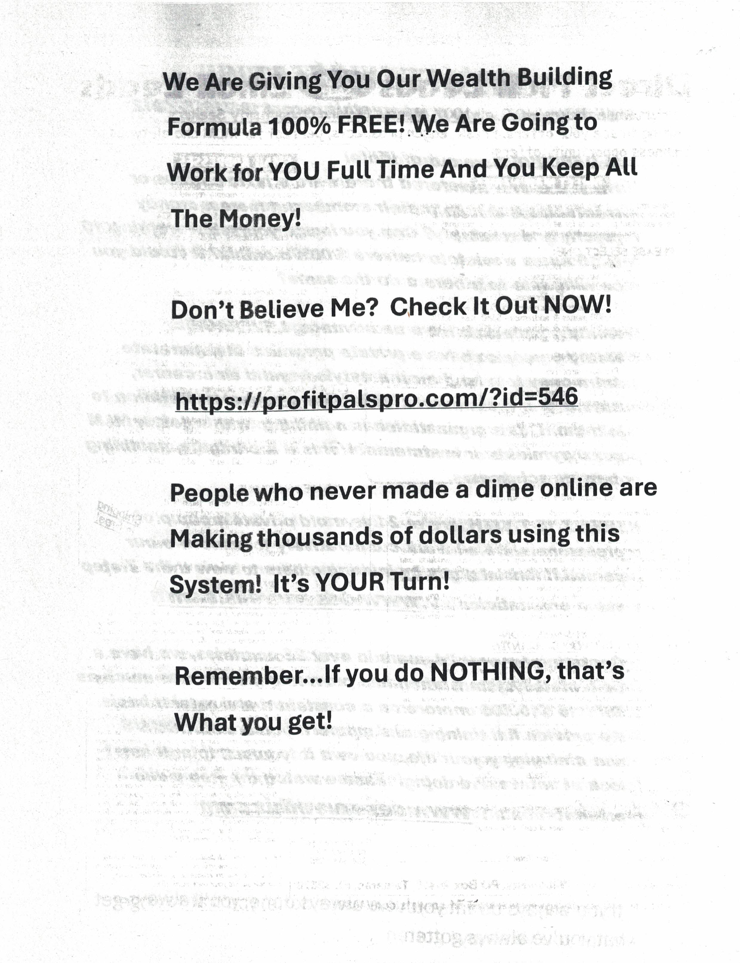 Join this great program that pays a whopping $50 on all people you recruit. Guarantees residual income and play the lotto too! One f/c stamp! Bill Maurer, 2801 Toledo Rd. Apt. 515, Elkhart IN 46516
