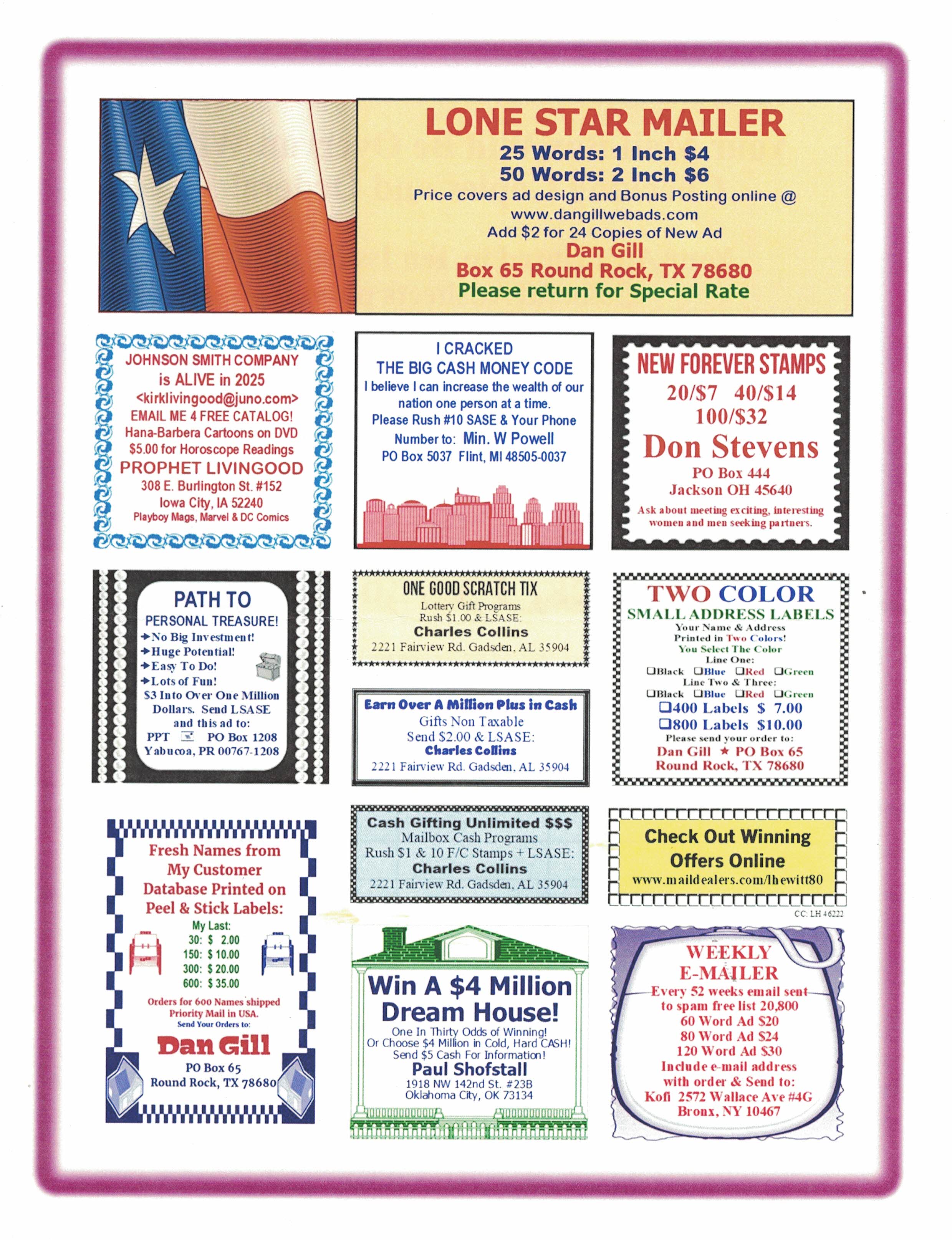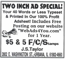 ![]() The Mail Train Ad Sheet. 500 circulation by first class mail plus unlimited online circulation at www.adsheets.net. $2 per camera-ready inch. Please include 1 forever stamp with order. Darin Forey, PO Box 530008, St. Pete FL 33747 The Fast 100 Ad Sheet. 100 circulation by first class mail plus unlimited online circulation at www.adsheets.net. $1 per camera-ready inch. Darin Forey, PO Box 530008, St. Pete FL 33747 Your listing here. Click for details ![]() Your listing here. Click for details ![]() 180 hot names on paper $8 or peel and stick labels $15. Darin Forey, PO Box 530008, Saint Pete FL 33747 Your listing here. Click for details | ![]() Your 8x11 circular or ad sheet (B&W) printed and mailed to 100 circulation. single-sided $12, double-sided $22. Darin Forey, PO Box 530008, St. Pete FL 33747 Your listing here. Click for details ![]() Your listing here. Click for details ![]() Your listing here. Click for details | ![]() Your 90 words or less typeset in to a 3" camera ready ad. You receive 9 copies of your new ad. $4 + 1 F/C stamp. Darin Forey, PO Box 530008, St. Pete FL 33747 Your 30 words or less typeset in to a 1" camera ready ad. You receive 9 copies of your new ad. $2 + 1 F/C stamp. Darin Forey, PO Box 530008, St. Pete FL 33747 Your 60 words or less typeset in to a 2" camera ready ad. You receive 9 copies of your new ad. $3 + 1 F/C stamp. Darin Forey, PO Box 530008, St. Pete FL 33747 Your listing here. Click for details ![]() Your listing here. Click for details |
