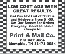 Your 60 words or less typeset in to a 2" camera ready ad. You receive 9 copies of your new ad. $3 + 1 F/C stamp. Darin Forey, PO Box 530008, St. Pete FL 33747
