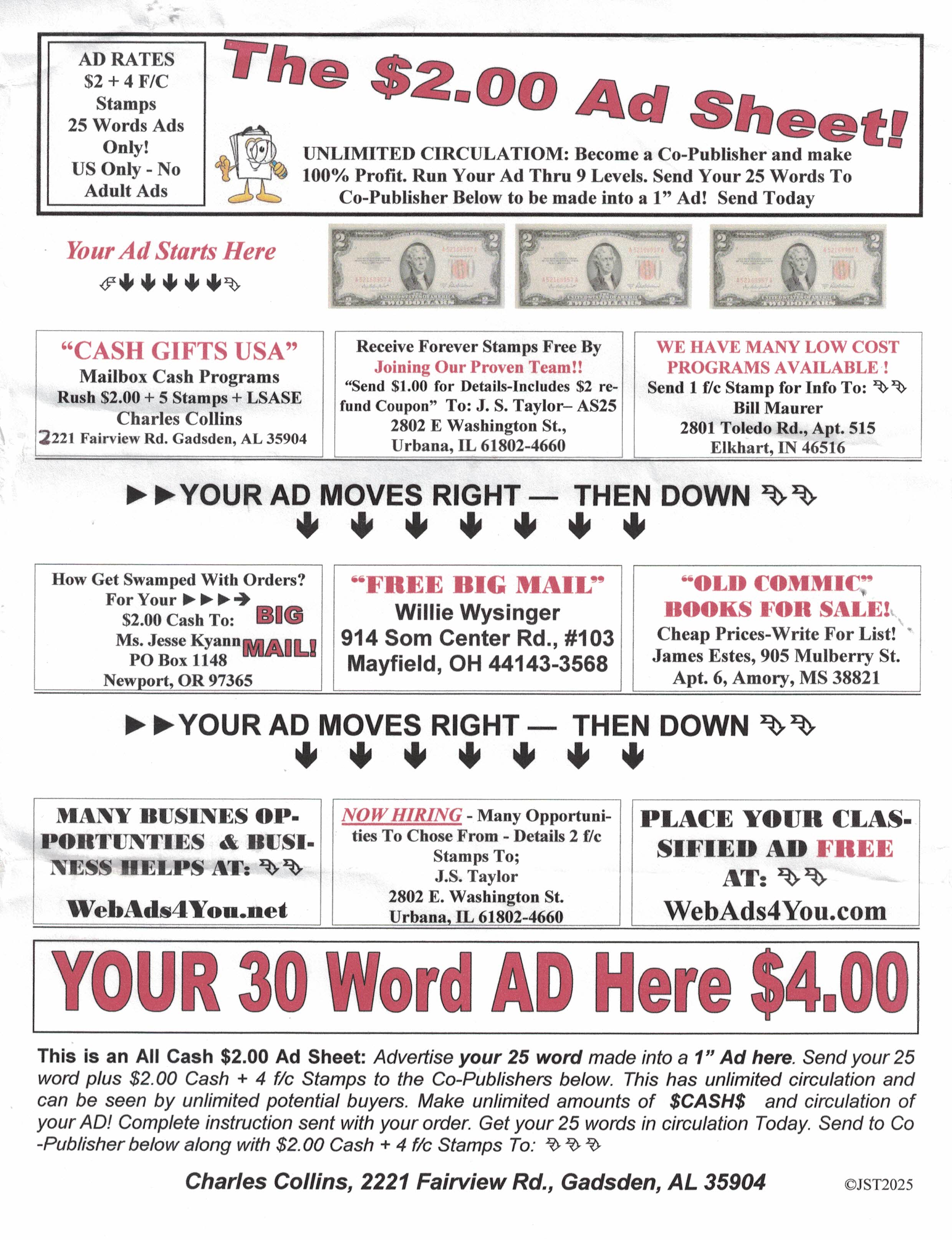 The Mail Train Ad Sheet. 500 circulation by first class mail plus unlimited online circulation at www.adsheets.net. $2 per camera-ready inch. Please include 1 forever stamp with order. Darin Forey, PO Box 530008, St. Pete FL 33747