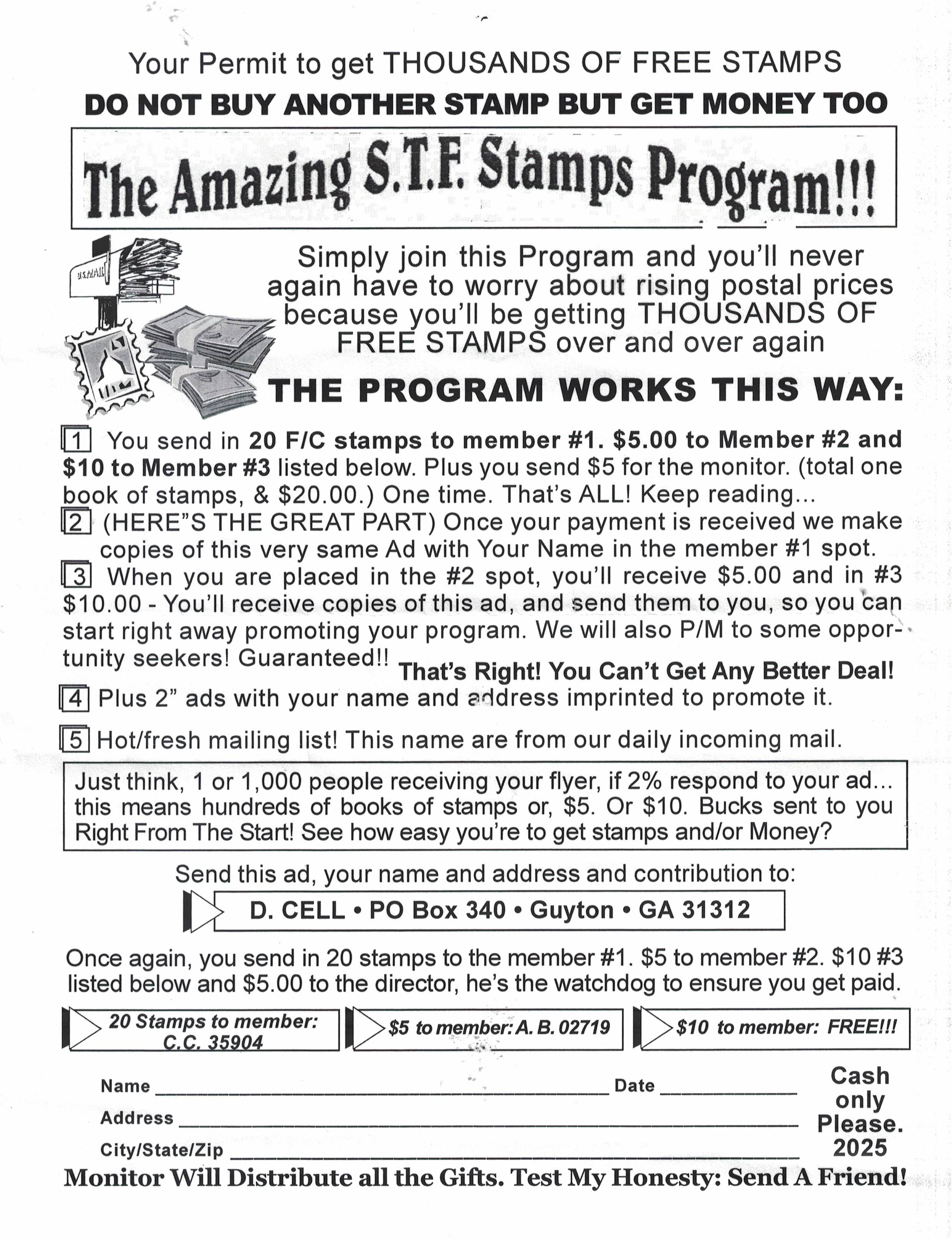 Never buy stamps again! We've got 20 hot money and stamp plans. Order them and start your cash and stamp flow. $5 + 5 stamps to: P&M, Box 3084, Memphis TN 38173