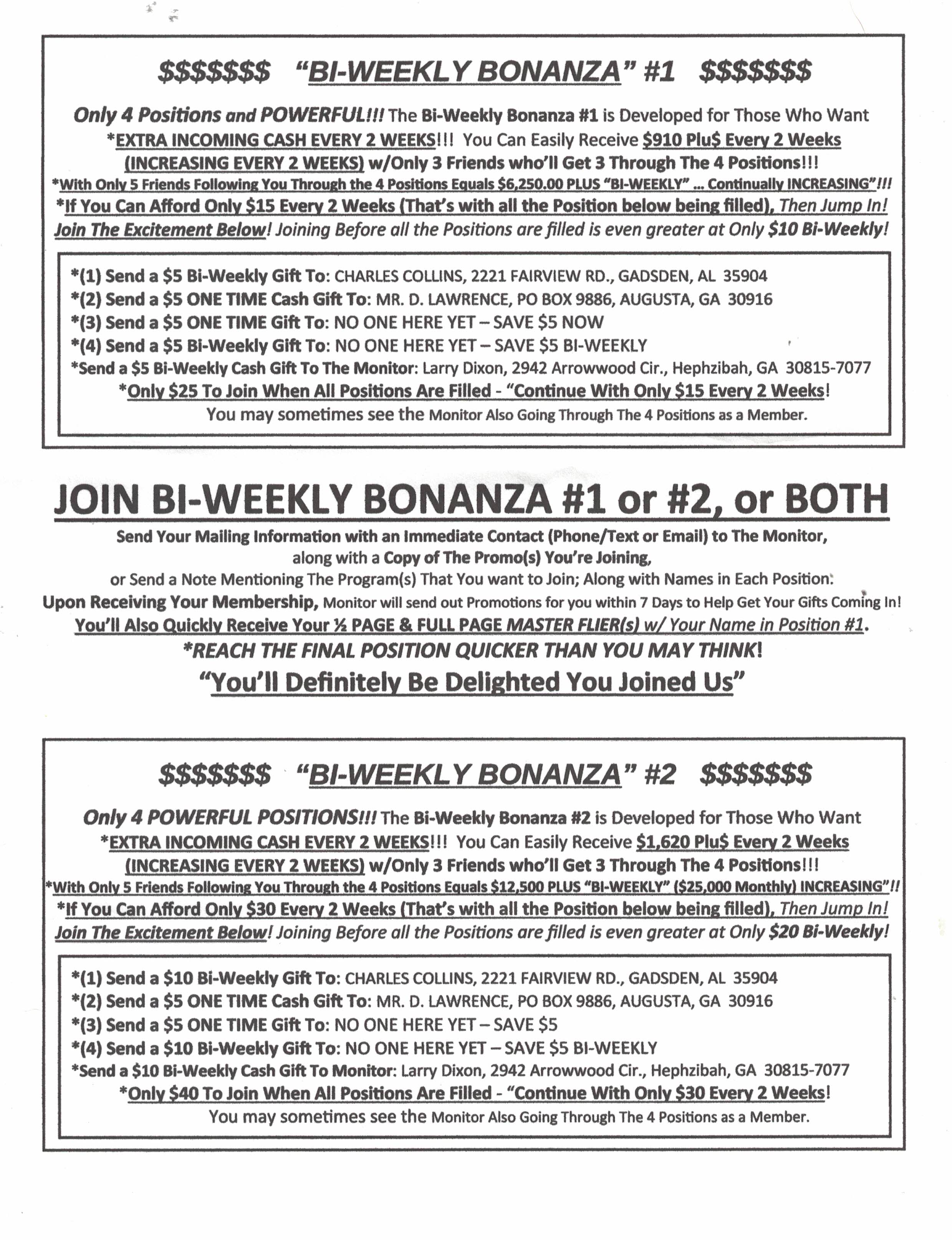 Need free money for debts, mortgage, education, business, fundraising & more? Send a LSASE to: Bruce McFayden, 670 Madison Ave, Daytona Beach FL 32114