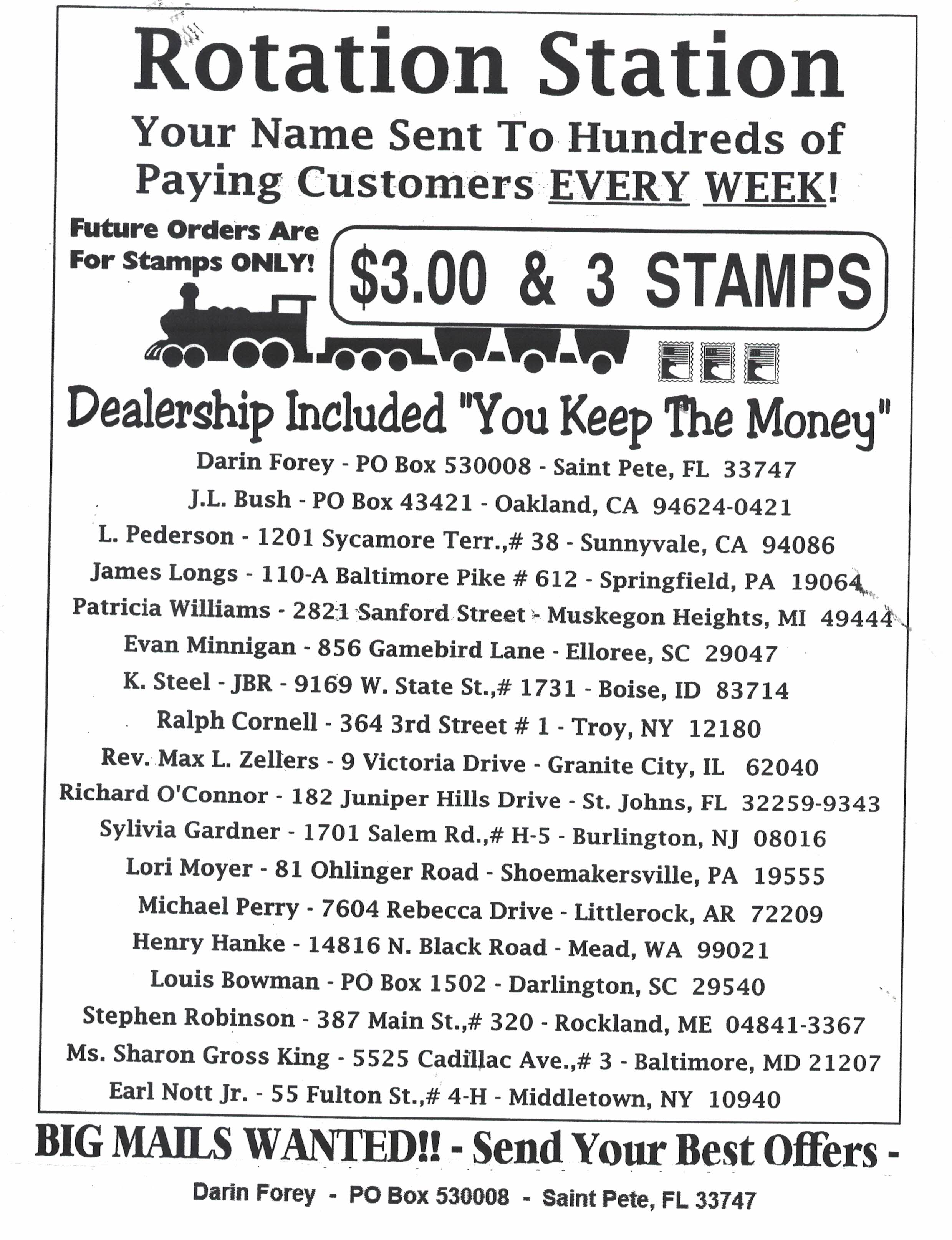 The Mail Train Ad Sheet. 500 circulation by first class mail plus unlimited online circulation at www.adsheets.net. $2 per camera-ready inch. Please include 1 forever stamp with order. Darin Forey, PO Box 530008, St. Pete FL 33747