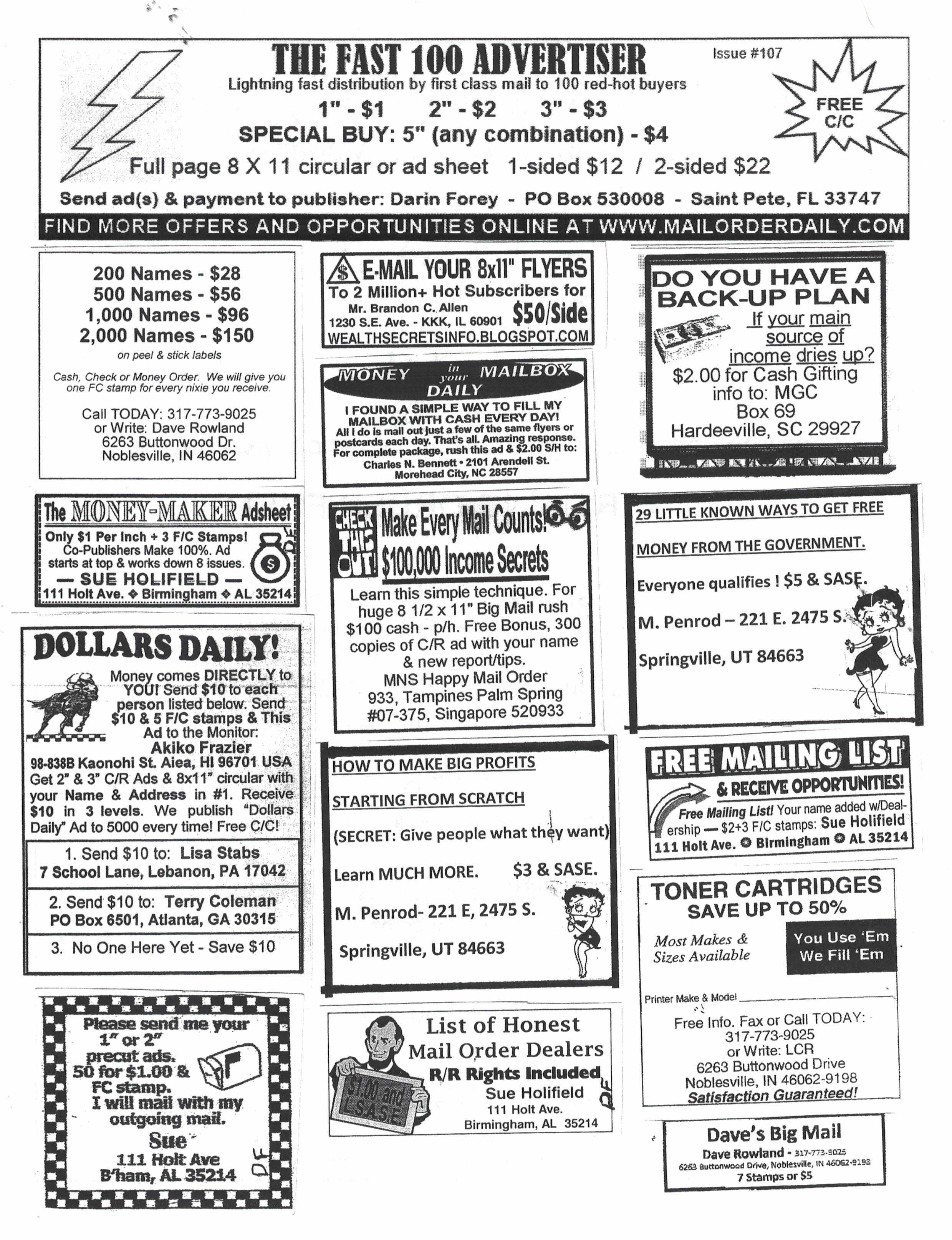 Your 8x11 circular or ad sheet (B&W) printed and mailed to 100 circulation. single-sided $12, double-sided $22. Darin Forey, PO Box 530008, St. Pete FL 33747