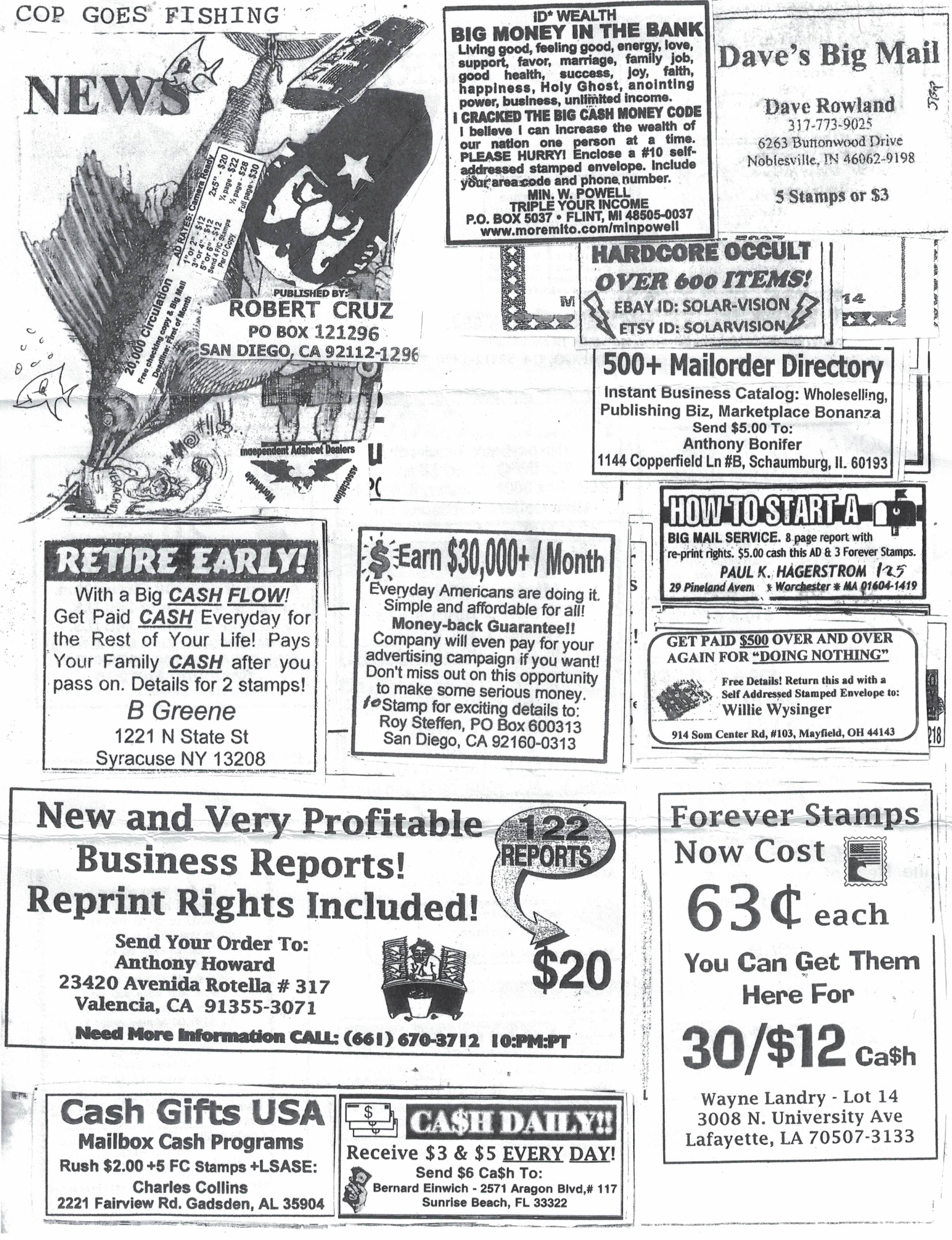 Your 90 words or less typeset in to a 3" camera ready ad. You receive 9 copies of your new ad. $4 + 1 F/C stamp. Darin Forey, PO Box 530008, St. Pete FL 33747