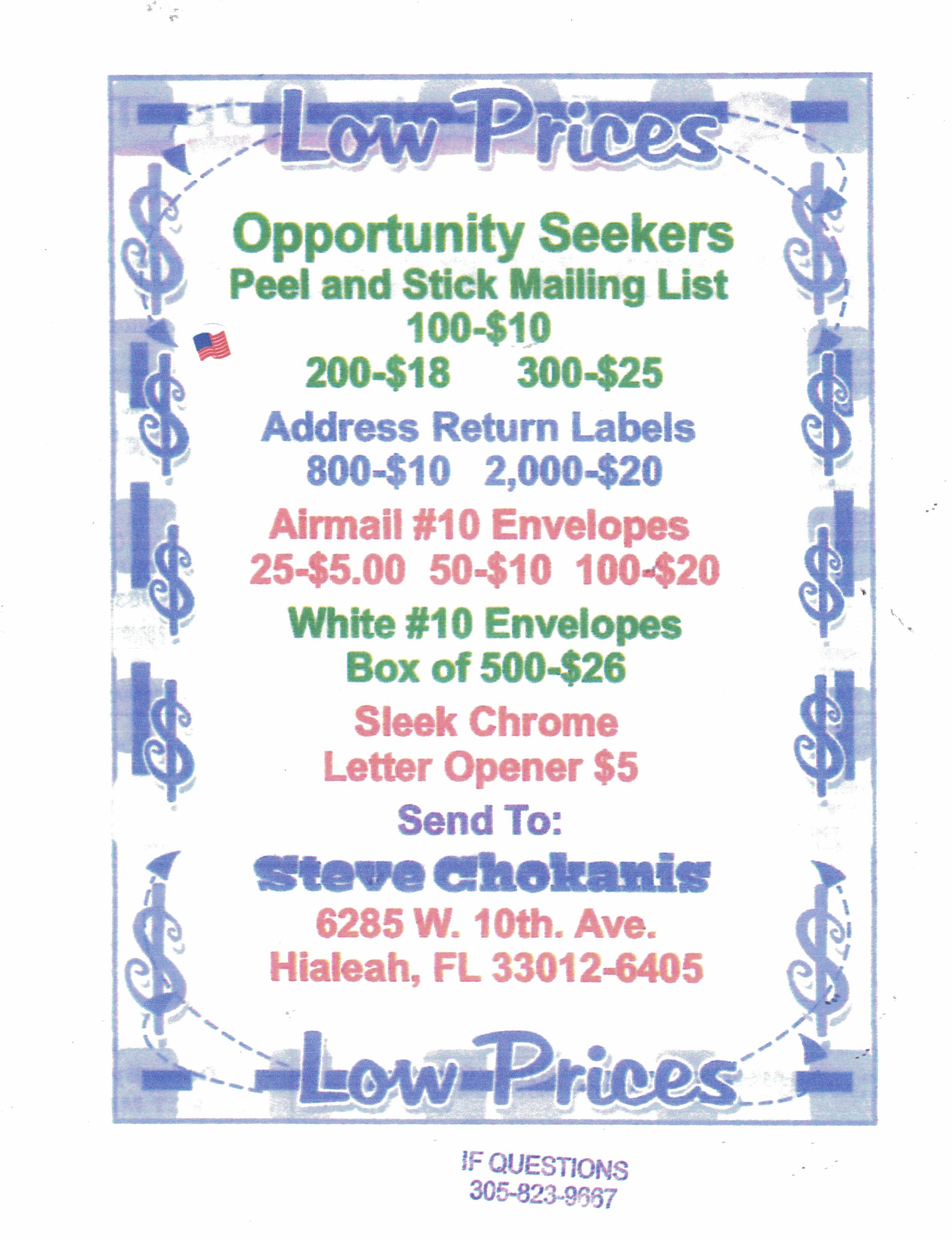 Your 8x11 circular or ad sheet (B&W) printed and mailed to 100 circulation. single-sided $12, double-sided $22. Darin Forey, PO Box 530008, St. Pete FL 33747