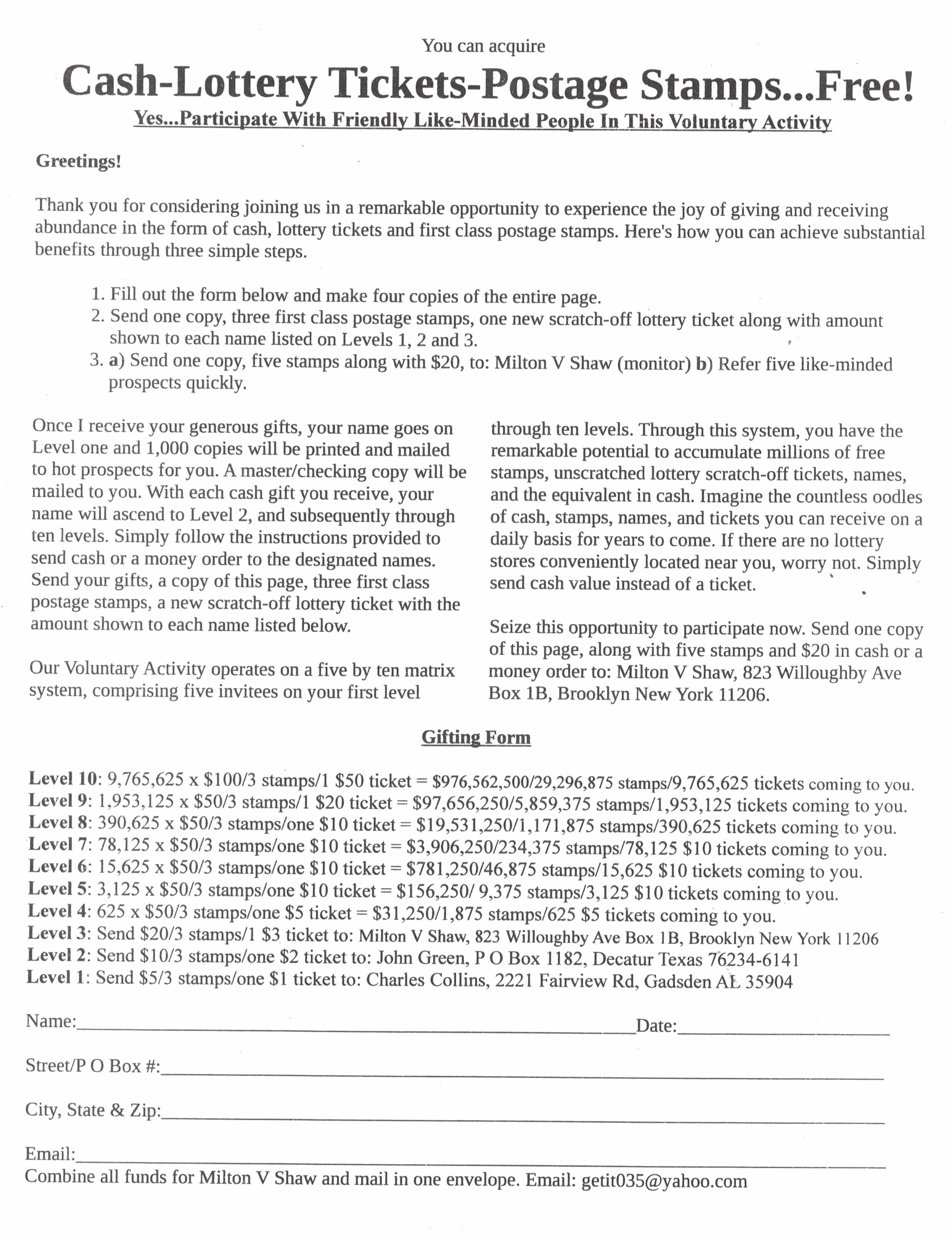 Need free money for debts, mortgage, education, business, fundraising & more? Send a LSASE to: Bruce McFayden, 670 Madison Ave, Daytona Beach FL 32114