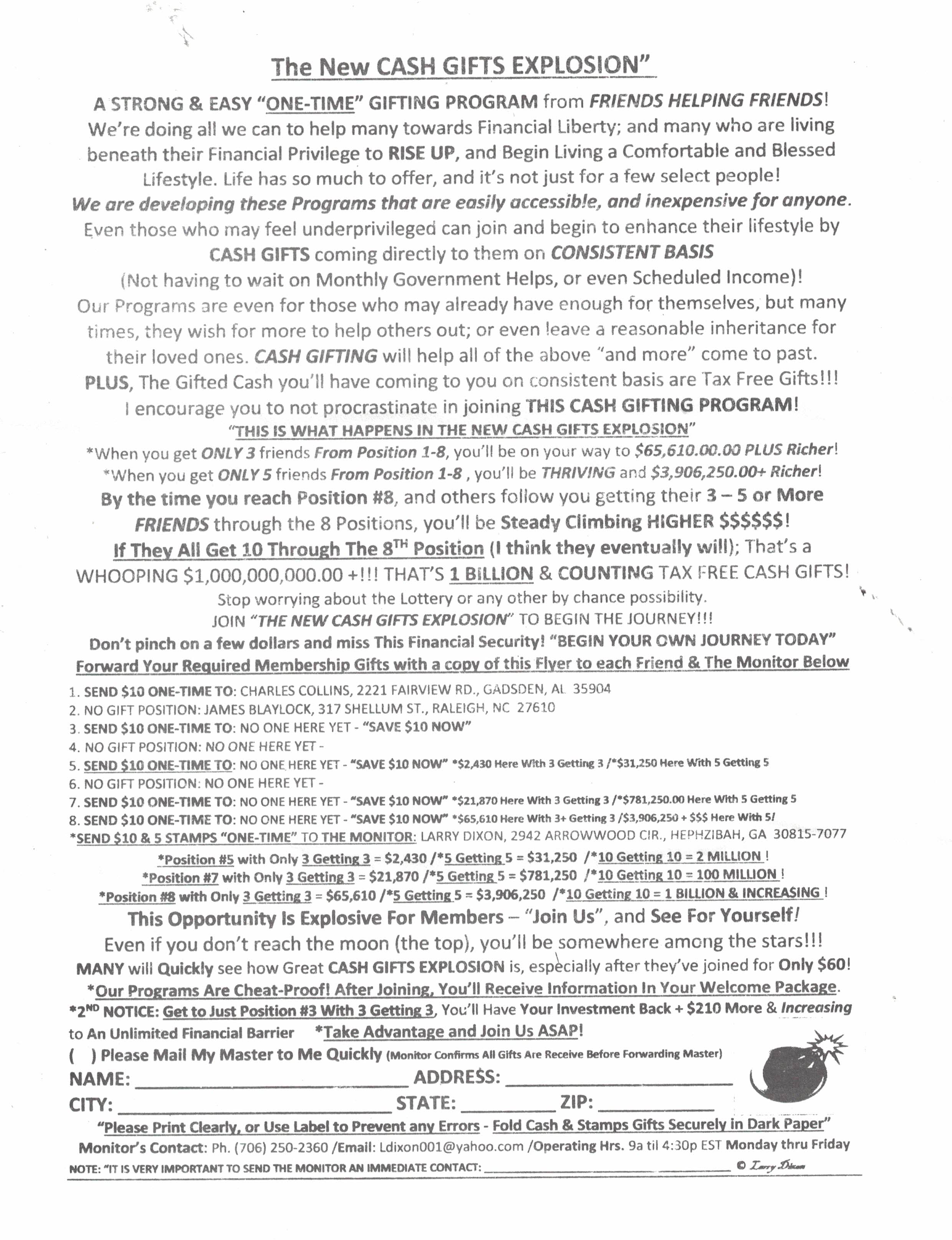 Need free money for debts, mortgage, education, business, fundraising & more? Send a LSASE to: Bruce McFayden, 670 Madison Ave, Daytona Beach FL 32114