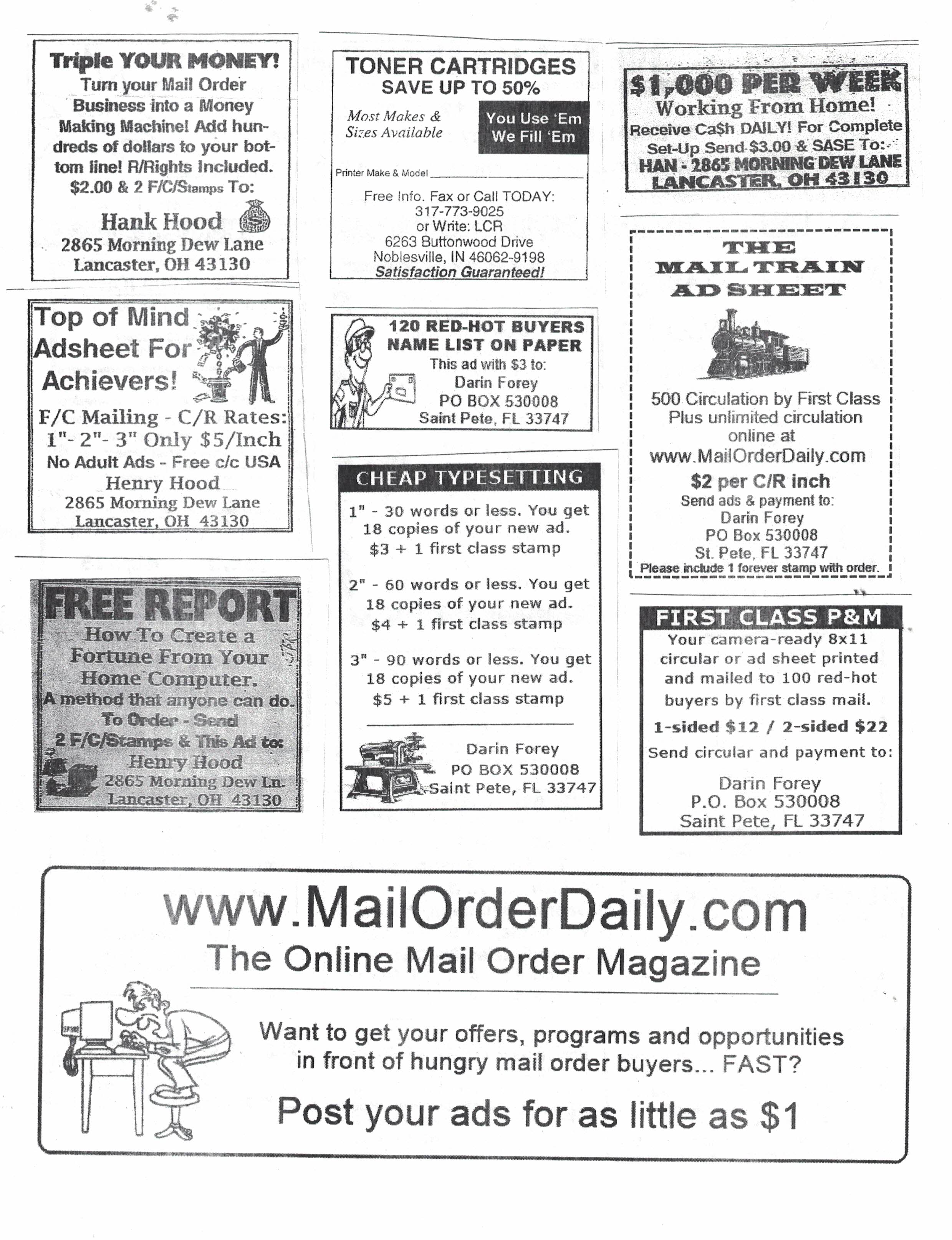 The Mail Train Ad Sheet. 500 circulation by first class mail plus unlimited online circulation at www.adsheets.net. $2 per camera-ready inch. Please include 1 forever stamp with order. Darin Forey, PO Box 530008, St. Pete FL 33747