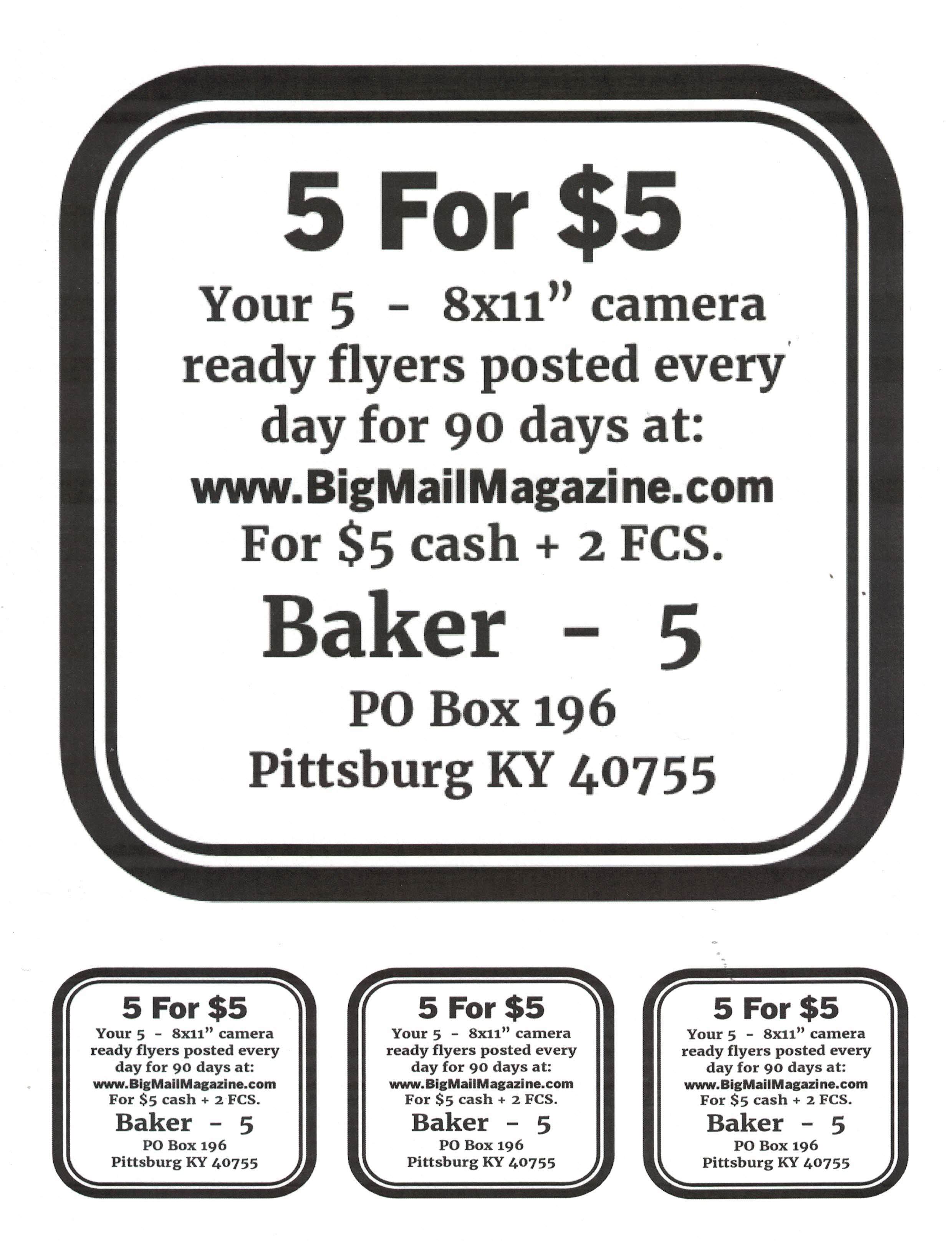 ![]() The Fast 100 Ad Sheet. 100 circulation by first class mail plus unlimited online circulation at www.adsheets.net. $1 per camera-ready inch. Darin Forey, PO Box 530008, St. Pete FL 33747 The Ad Blaster. 6500+ guaranteed circulation. Published in Shore To Shore, Liberty Press, JBR Home Mailer and online at www.MailOrderDaily.com. $7 per camera-ready inch. Publisher: Darin Forey, PO Box 530008, St. Pete FL 33747 Your listing here. Click for details ![]() Your listing here. Click for details ![]() 180 hot names on paper $8 or peel and stick labels $15. Darin Forey, PO Box 530008, Saint Pete FL 33747 Your listing here. Click for details | ![]() Your 8x11 circular or ad sheet (B&W) printed and mailed to 100 circulation. single-sided $12, double-sided $22. Darin Forey, PO Box 530008, St. Pete FL 33747 Your listing here. Click for details ![]() Your listing here. Click for details ![]() Your listing here. Click for details | ![]() Your 90 words or less typeset in to a 3" camera ready ad. You receive 9 copies of your new ad. $4 + 1 F/C stamp. Darin Forey, PO Box 530008, St. Pete FL 33747 Your 60 words or less typeset in to a 2" camera ready ad. You receive 9 copies of your new ad. $3 + 1 F/C stamp. Darin Forey, PO Box 530008, St. Pete FL 33747 Your 30 words or less typeset in to a 1" camera ready ad. You receive 9 copies of your new ad. $2 + 1 F/C stamp. Darin Forey, PO Box 530008, St. Pete FL 33747 Your listing here. Click for details ![]() Your listing here. Click for details |