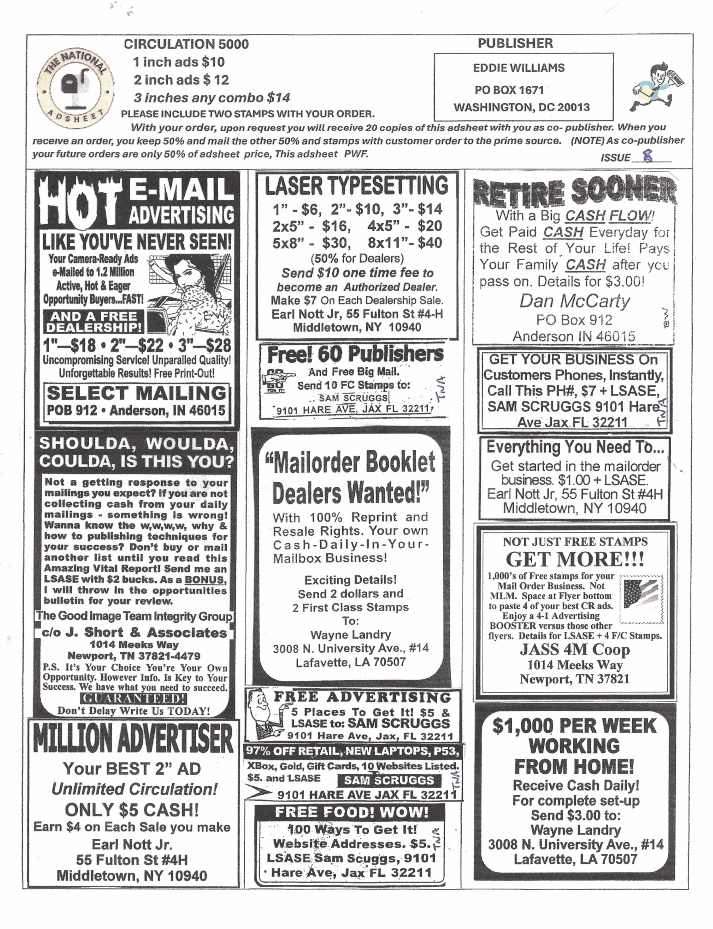 ![]() The Mail Train Ad Sheet. 500 circulation by first class mail plus unlimited online circulation at www.adsheets.net. $2 per camera-ready inch. Please include 1 forever stamp with order. Darin Forey, PO Box 530008, St. Pete FL 33747 The Fast 100 Ad Sheet. 100 circulation by first class mail plus unlimited online circulation at www.adsheets.net. $1 per camera-ready inch. Darin Forey, PO Box 530008, St. Pete FL 33747 Your listing here. Click for details ![]() Your listing here. Click for details ![]() 180 hot names on paper $8 or peel and stick labels $15. Darin Forey, PO Box 530008, Saint Pete FL 33747 Your listing here. Click for details | ![]() Your 8x11 circular or ad sheet (B&W) printed and mailed to 100 circulation. single-sided $12, double-sided $22. Darin Forey, PO Box 530008, St. Pete FL 33747 Your listing here. Click for details ![]() Your listing here. Click for details ![]() Your listing here. Click for details | ![]() Your 90 words or less typeset in to a 3" camera ready ad. You receive 9 copies of your new ad. $4 + 1 F/C stamp. Darin Forey, PO Box 530008, St. Pete FL 33747 Your 60 words or less typeset in to a 2" camera ready ad. You receive 9 copies of your new ad. $3 + 1 F/C stamp. Darin Forey, PO Box 530008, St. Pete FL 33747 Your 30 words or less typeset in to a 1" camera ready ad. You receive 9 copies of your new ad. $2 + 1 F/C stamp. Darin Forey, PO Box 530008, St. Pete FL 33747 Your listing here. Click for details ![]() Your listing here. Click for details |
