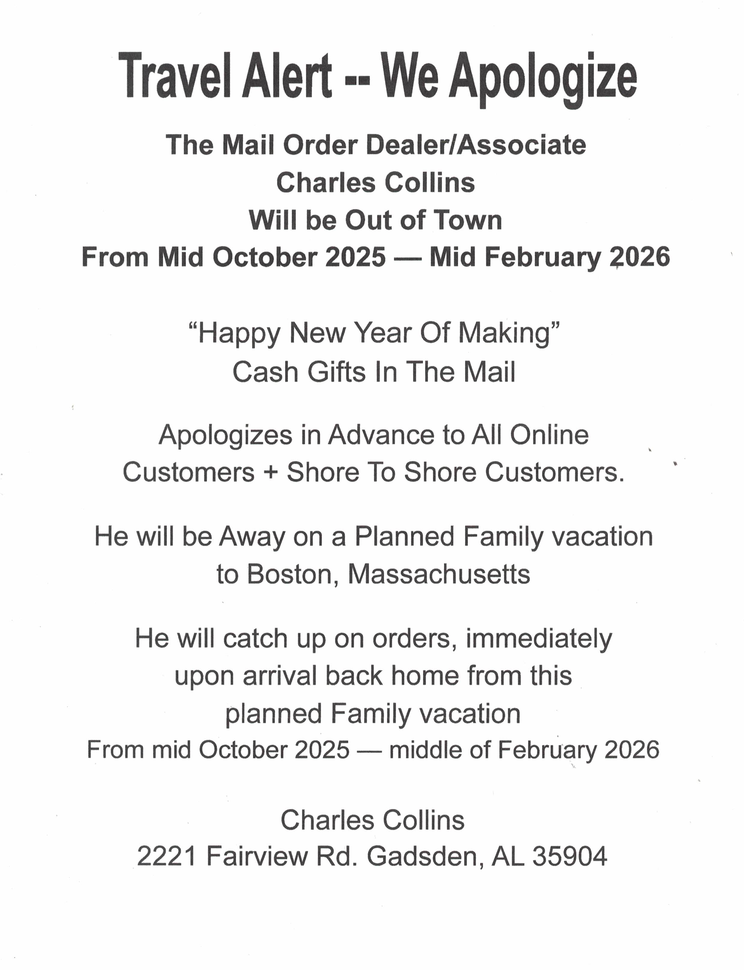 9/10/25 - Travel Alert - Mail order dealer Charles Collins of Gadsden, AL will be on vacation from mid October 2025 through mid February 2026. No orders will be filled until he returns.