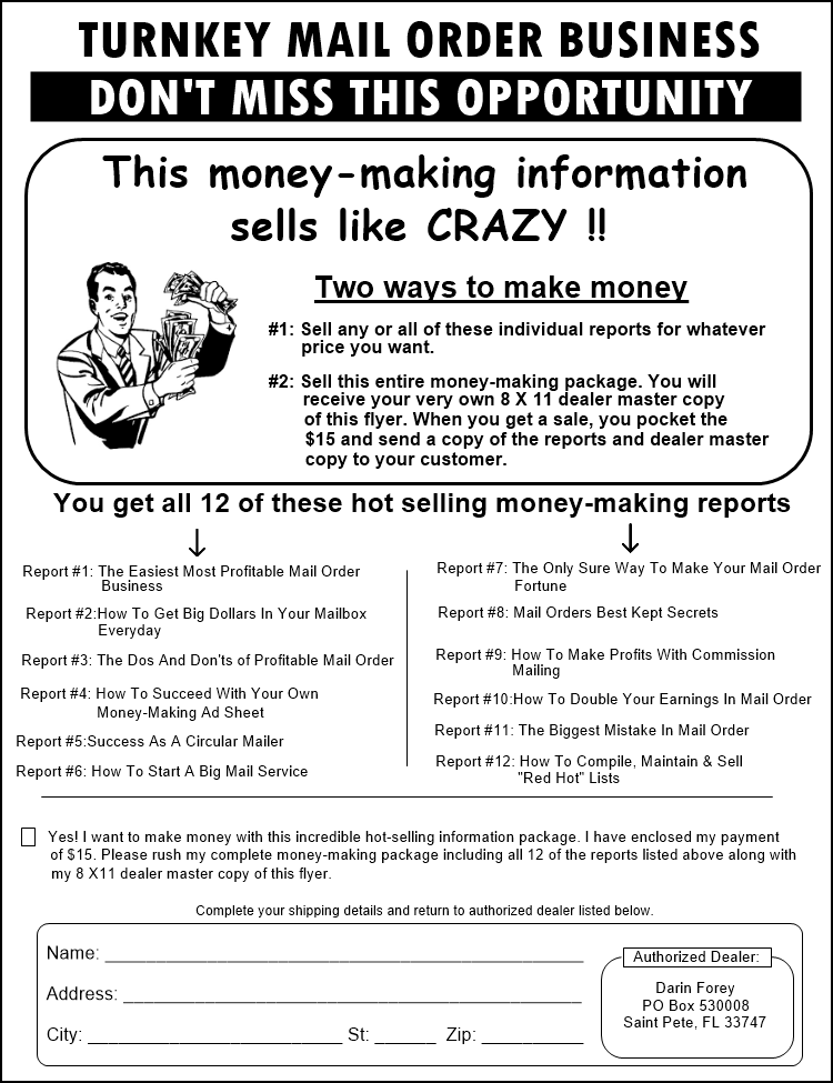 ![]() The Fast 100 Ad Sheet. 100 circulation by first class mail plus unlimited online circulation at www.adsheets.net. $1 per camera-ready inch. Darin Forey, PO Box 530008, St. Pete FL 33747 The Ad Blaster. 6500+ guaranteed circulation. Published in Shore To Shore, Liberty Press, JBR Home Mailer and online at www.MailOrderDaily.com. $7 per camera-ready inch. Publisher: Darin Forey, PO Box 530008, St. Pete FL 33747 Your listing here. Click for details ![]() Your listing here. Click for details ![]() 180 hot names on paper $8 or peel and stick labels $15. Darin Forey, PO Box 530008, Saint Pete FL 33747 Your listing here. Click for details | ![]() Your 8x11 circular or ad sheet (B&W) printed and mailed to 100 circulation. single-sided $12, double-sided $22. Darin Forey, PO Box 530008, St. Pete FL 33747 Your listing here. Click for details ![]() Your listing here. Click for details ![]() Your listing here. Click for details | ![]() Your 60 words or less typeset in to a 2" camera ready ad. You receive 9 copies of your new ad. $3 + 1 F/C stamp. Darin Forey, PO Box 530008, St. Pete FL 33747 Your 30 words or less typeset in to a 1" camera ready ad. You receive 9 copies of your new ad. $2 + 1 F/C stamp. Darin Forey, PO Box 530008, St. Pete FL 33747 Your 90 words or less typeset in to a 3" camera ready ad. You receive 9 copies of your new ad. $4 + 1 F/C stamp. Darin Forey, PO Box 530008, St. Pete FL 33747 Your listing here. Click for details ![]() Your listing here. Click for details |