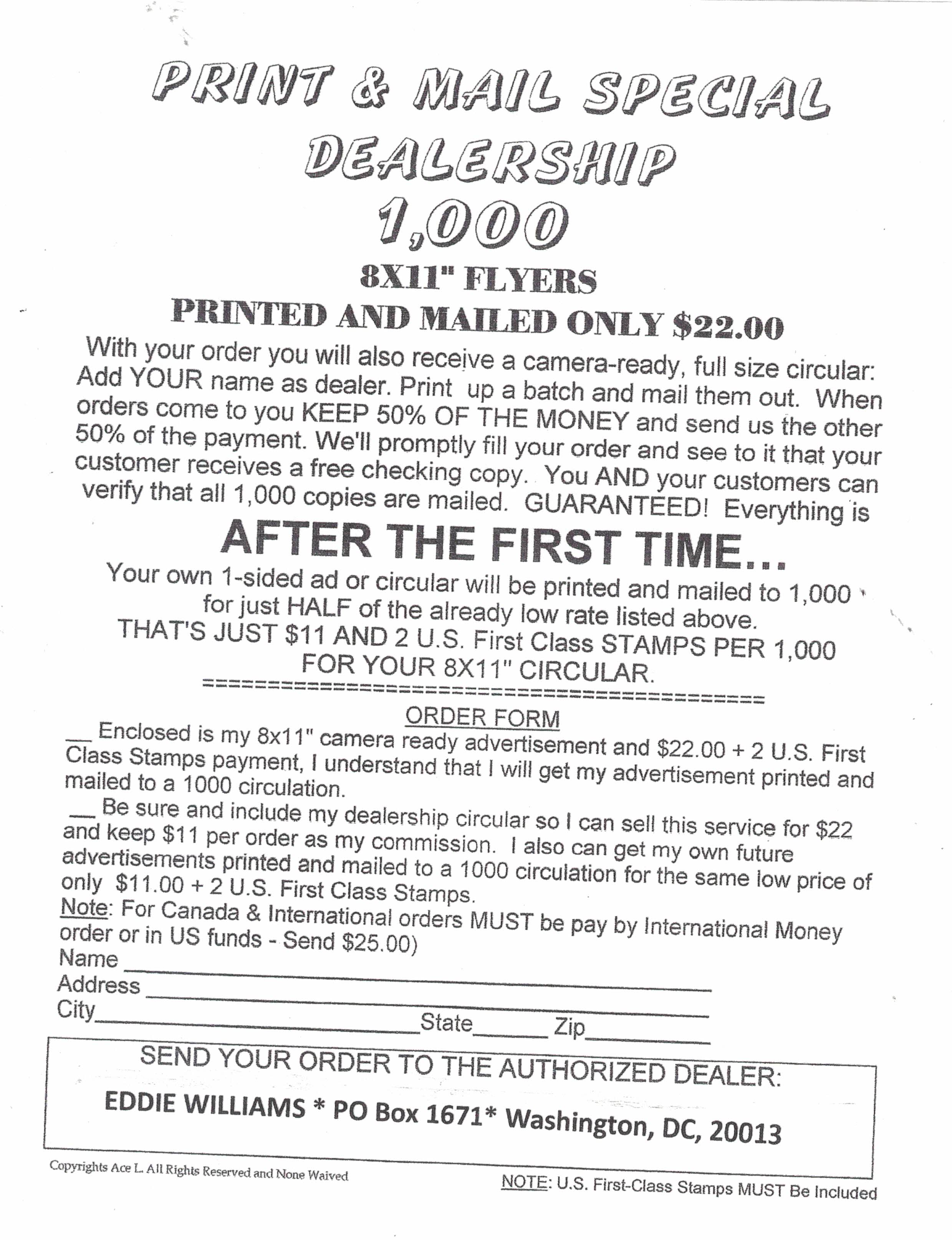 Your 8x11 circular or ad sheet (B&W) printed and mailed to 100 circulation. single-sided $12, double-sided $22. Darin Forey, PO Box 530008, St. Pete FL 33747