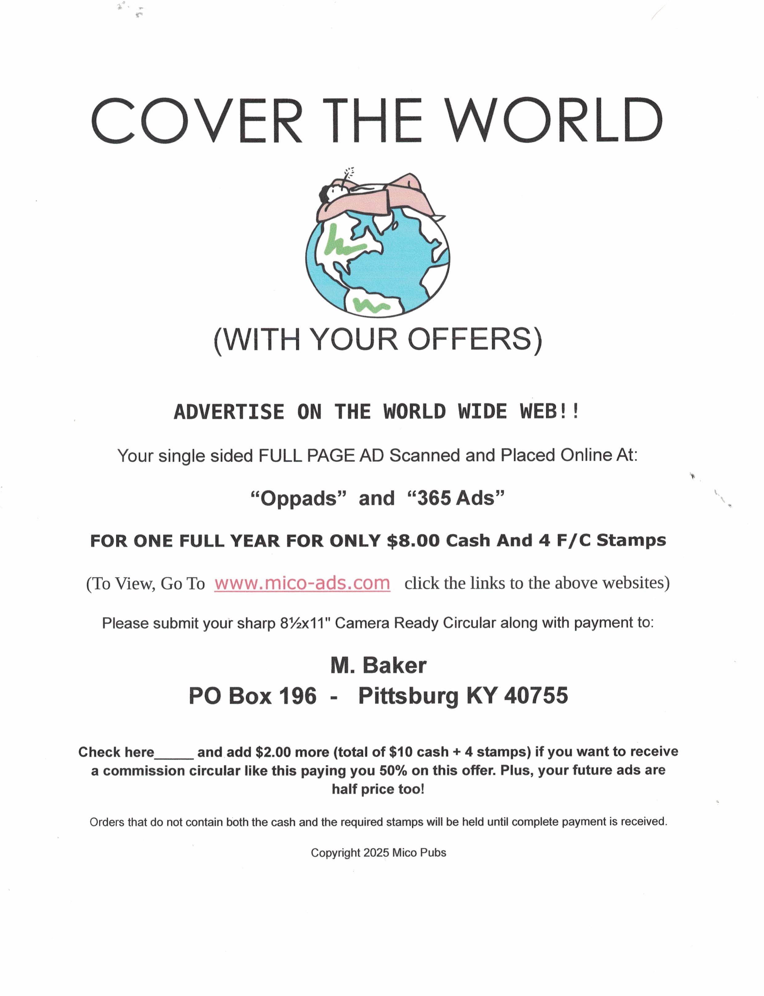 Your 90 words or less typeset in to a 3" camera ready ad. You receive 9 copies of your new ad. $4 + 1 F/C stamp. Darin Forey, PO Box 530008, St. Pete FL 33747