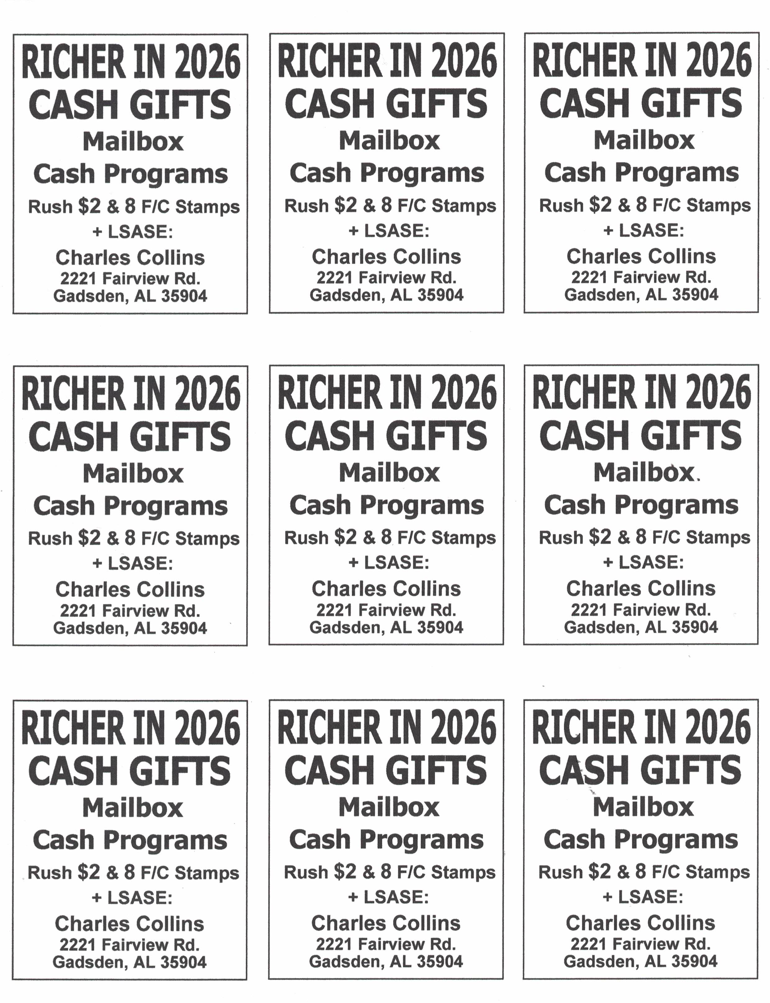 11/22/25 - NEW ADSHEET LAUNCHED. The Ad Blaster. 6500+ guaranteed circulation. Shore To Shore (5000), Liberty Press (1000), JBR Home Mailer (500), MailOrderDaily.com (unlimited). All 4 publications for only $7 per C/R inch. Send ads and payment to: Darin Forey, PO Box 530008, Saint Pete FL 33747 11/3/25 - TRAVEL ALERT: I have been informed by mail order dealer Charles Collins of Gadsden, AL that he will be out of town from mid October 2025 until mid February 2026. No orders will be filled until his return. 10/4/25 - The BRAND NEW mail order services directory is now live. You can check it out near the bottom of the page or Click here for more details. 9/13/25 - Want your very own mail dealer webpage? Get your name added to the mail dealer directory. Visit MailDealers.com |
