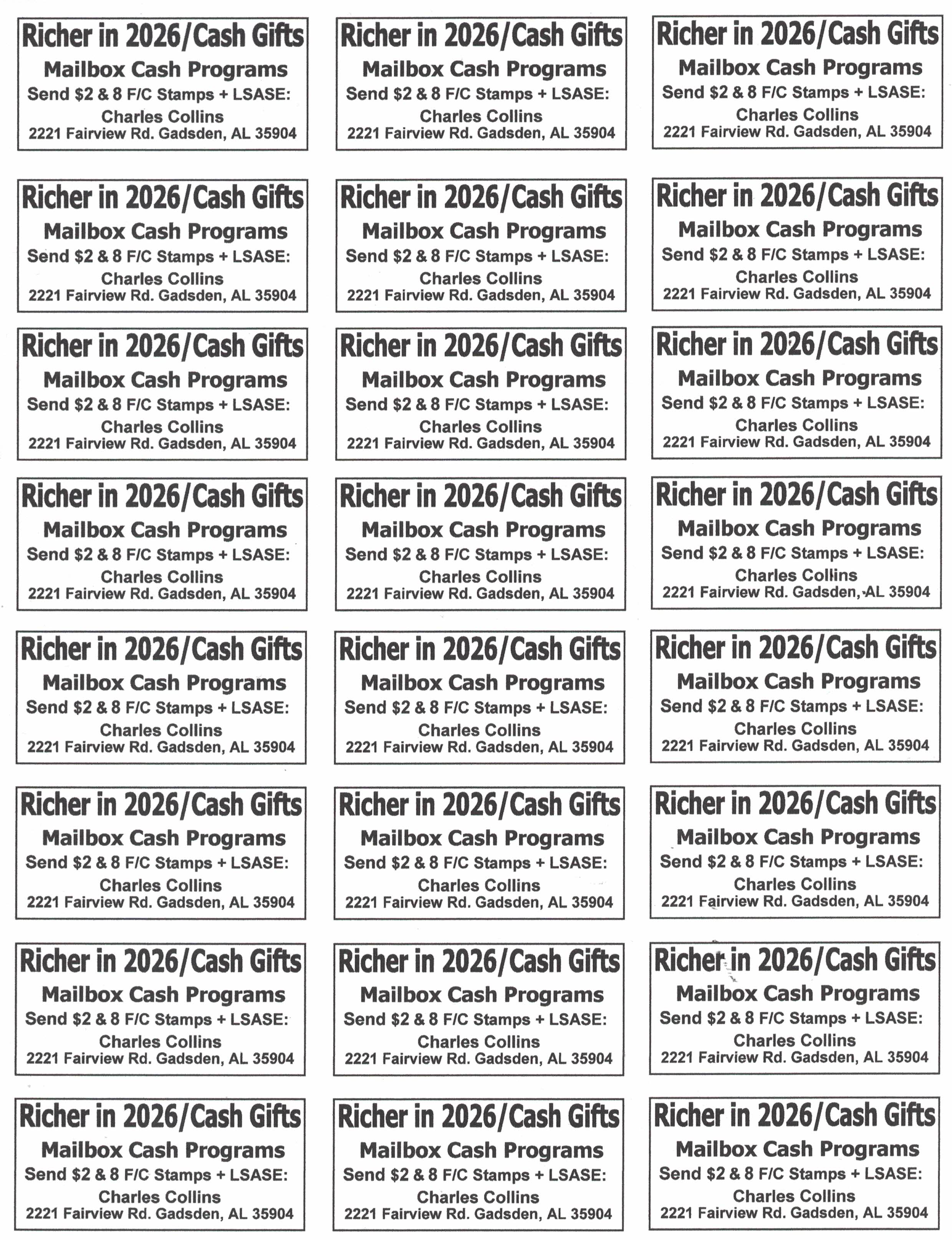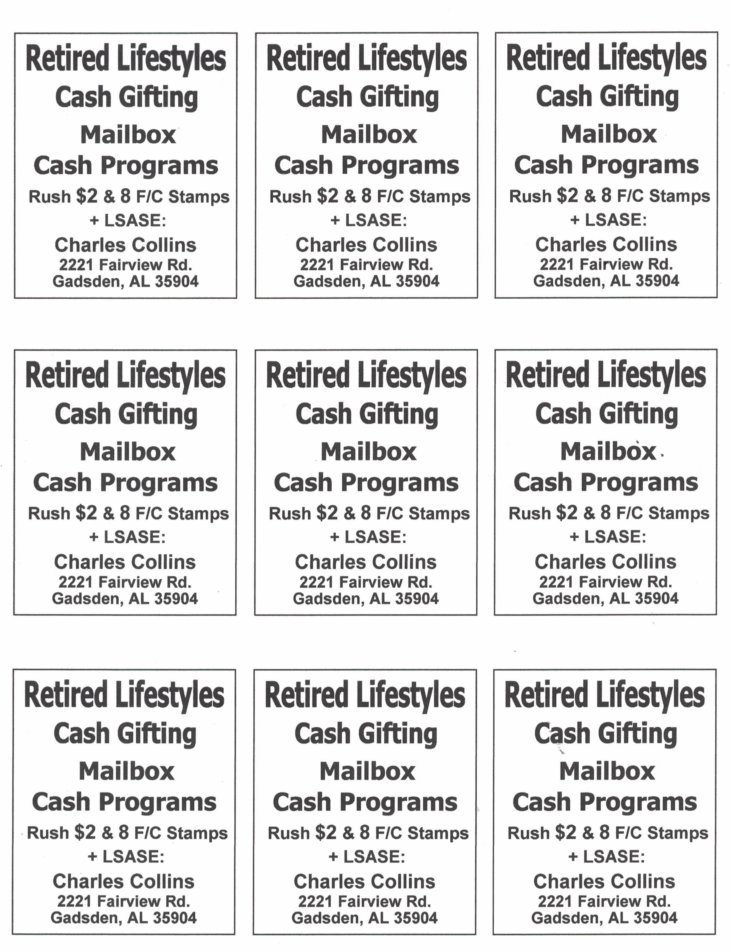 ![]() The Ad Blaster. 6500+ guaranteed circulation. Published in Shore To Shore, Liberty Press, JBR Home Mailer and online at www.MailOrderDaily.com. $7 per camera-ready inch. Publisher: Darin Forey, PO Box 530008, St. Pete FL 33747 The Fast 100 Ad Sheet. 100 circulation by first class mail plus unlimited online circulation at www.adsheets.net. $1 per camera-ready inch. Darin Forey, PO Box 530008, St. Pete FL 33747 Your listing here. Click for details ![]() Your listing here. Click for details ![]() 180 hot names on paper $8 or peel and stick labels $15. Darin Forey, PO Box 530008, Saint Pete FL 33747 Your listing here. Click for details | ![]() Your 8x11 circular or ad sheet (B&W) printed and mailed to 100 circulation. single-sided $12, double-sided $22. Darin Forey, PO Box 530008, St. Pete FL 33747 Your listing here. Click for details ![]() Your listing here. Click for details ![]() Your listing here. Click for details | ![]() Your 60 words or less typeset in to a 2" camera ready ad. You receive 9 copies of your new ad. $3 + 1 F/C stamp. Darin Forey, PO Box 530008, St. Pete FL 33747 Your 30 words or less typeset in to a 1" camera ready ad. You receive 9 copies of your new ad. $2 + 1 F/C stamp. Darin Forey, PO Box 530008, St. Pete FL 33747 Your 90 words or less typeset in to a 3" camera ready ad. You receive 9 copies of your new ad. $4 + 1 F/C stamp. Darin Forey, PO Box 530008, St. Pete FL 33747 Your listing here. Click for details ![]() Your listing here. Click for details |