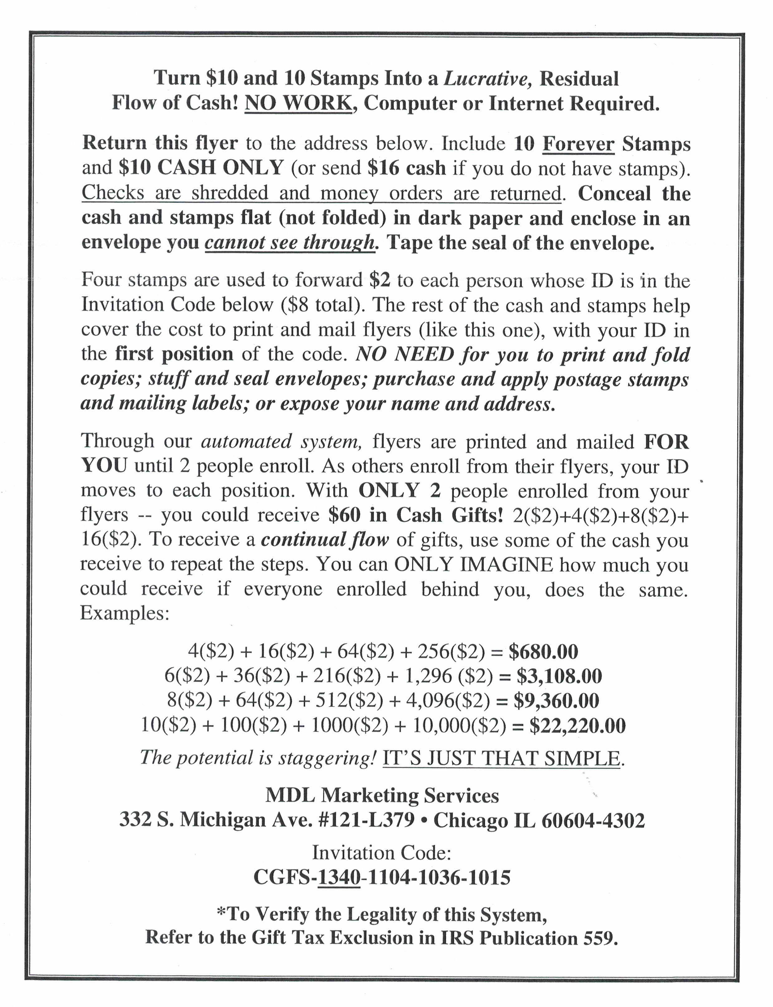 Your 8x11 circular or ad sheet (B&W) printed and mailed to 100 circulation. single-sided $12, double-sided $22. Darin Forey, PO Box 530008, St. Pete FL 33747
