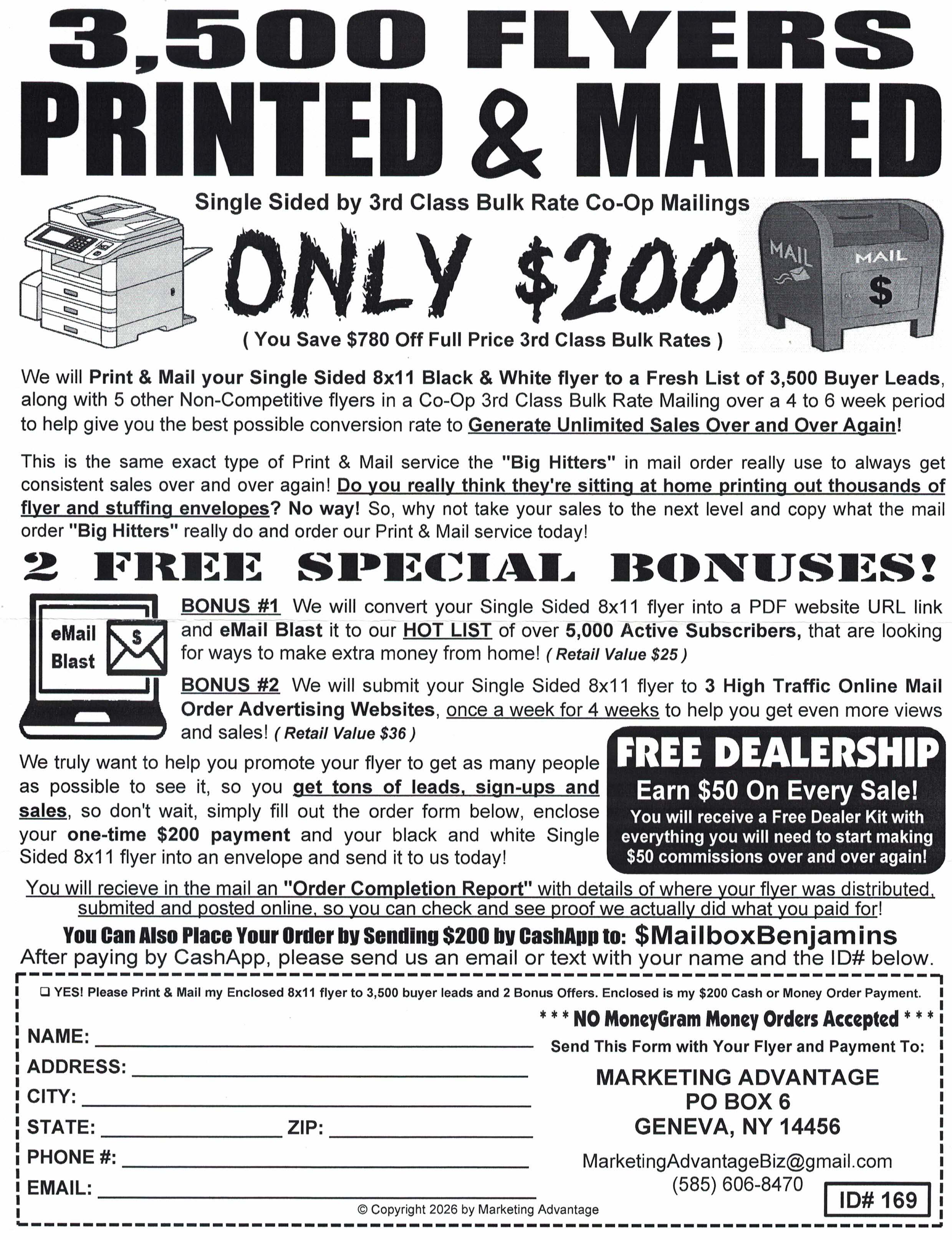 Your 8x11 circular or ad sheet (B&W) printed and mailed to 100 circulation. single-sided $12, double-sided $22. Darin Forey, PO Box 530008, St. Pete FL 33747