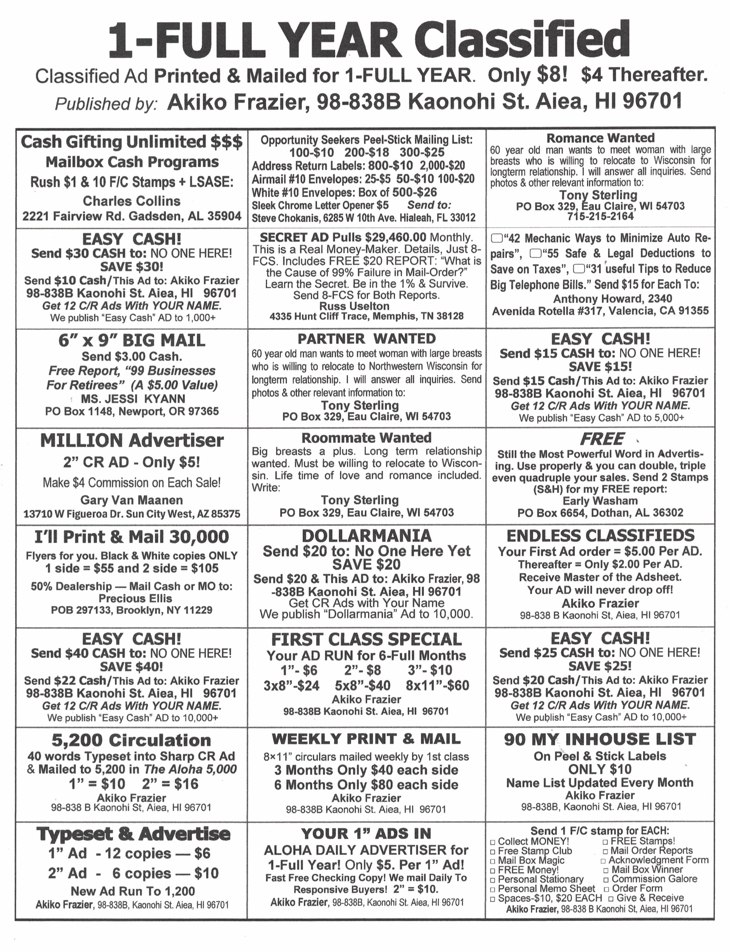 Your 60 words or less typeset in to a 2" camera ready ad. You receive 9 copies of your new ad. $3 + 1 F/C stamp. Darin Forey, PO Box 530008, St. Pete FL 33747