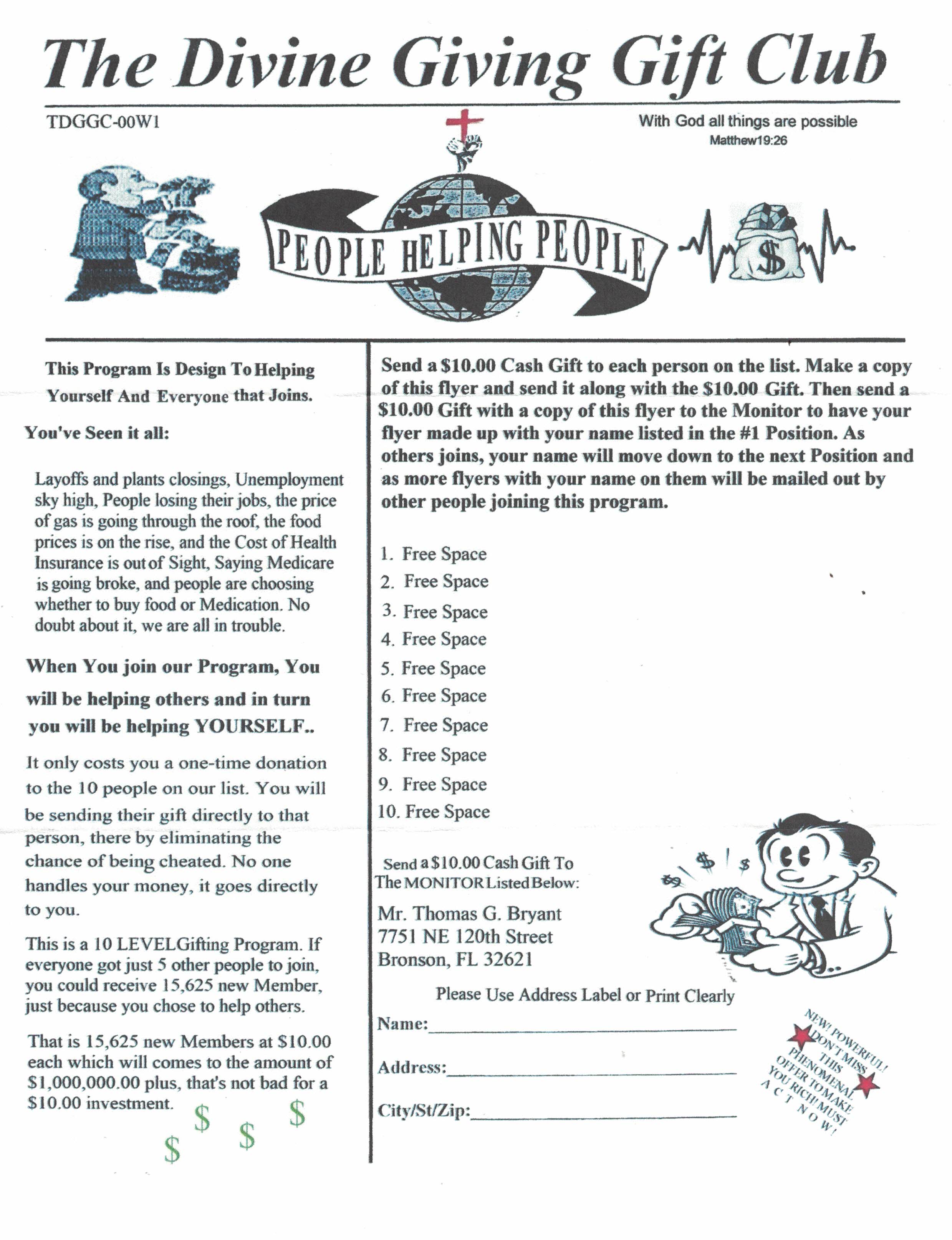 Join this great program that pays a whopping $50 on all people you recruit. Guarantees residual income and play the lotto too! One f/c stamp! Bill Maurer, 2801 Toledo Rd. Apt. 515, Elkhart IN 46516