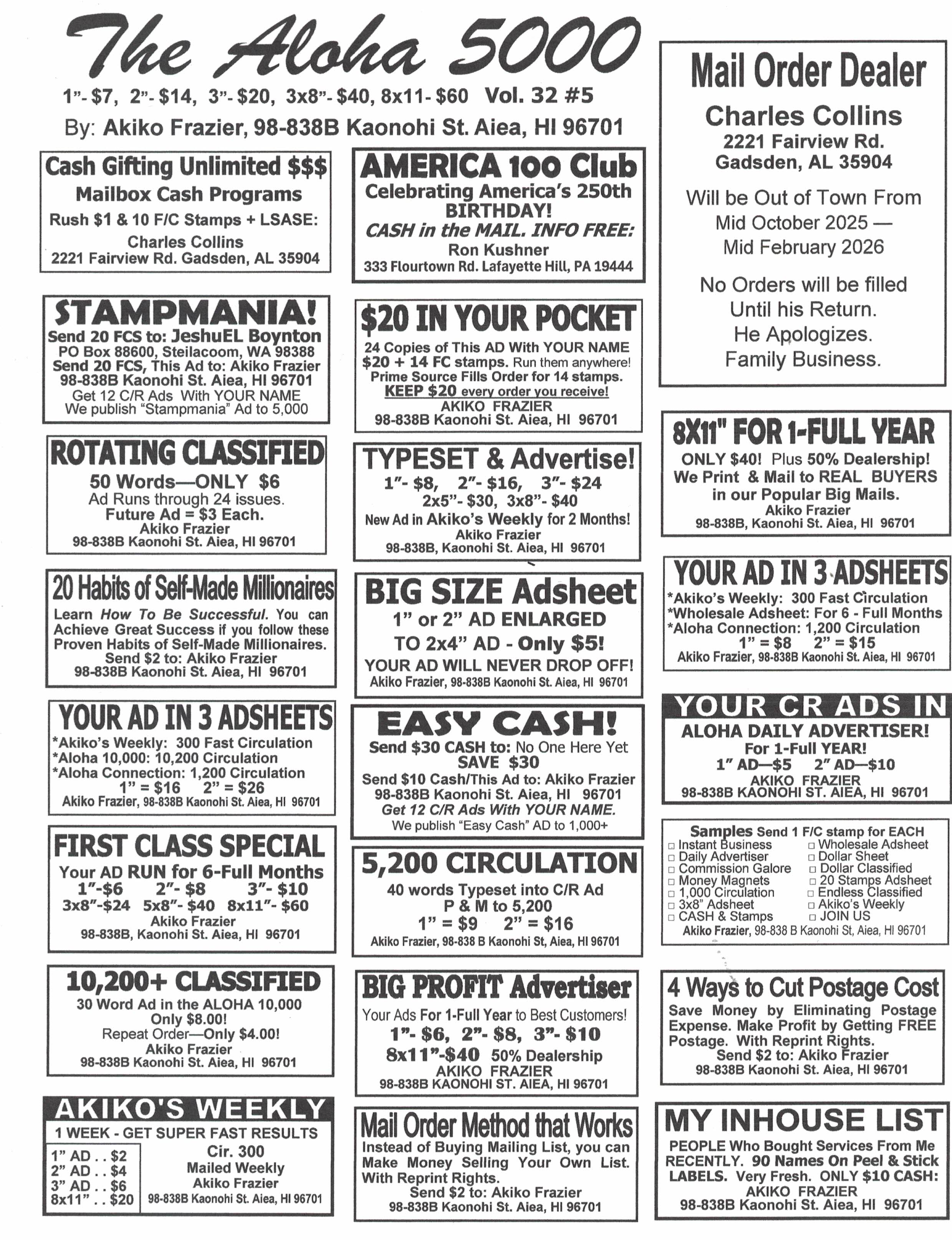 ![]() The Fast 100 Ad Sheet. 100 circulation by first class mail plus unlimited online circulation at www.adsheets.net. $1 per camera-ready inch. Darin Forey, PO Box 530008, St. Pete FL 33747 The Mail Train Ad Sheet. 500 circulation by first class mail plus unlimited online circulation at www.adsheets.net. $2 per camera-ready inch. Please include 1 forever stamp with order. Darin Forey, PO Box 530008, St. Pete FL 33747 Your listing here. Click for details ![]() Your listing here. Click for details ![]() 180 hot names on paper $8 or peel and stick labels $15. Darin Forey, PO Box 530008, Saint Pete FL 33747 Your listing here. Click for details | ![]() Your 8x11 circular or ad sheet (B&W) printed and mailed to 100 circulation. single-sided $12, double-sided $22. Darin Forey, PO Box 530008, St. Pete FL 33747 Your listing here. Click for details ![]() Your listing here. Click for details ![]() Your listing here. Click for details | ![]() Your 90 words or less typeset in to a 3" camera ready ad. You receive 9 copies of your new ad. $4 + 1 F/C stamp. Darin Forey, PO Box 530008, St. Pete FL 33747 Your 30 words or less typeset in to a 1" camera ready ad. You receive 9 copies of your new ad. $2 + 1 F/C stamp. Darin Forey, PO Box 530008, St. Pete FL 33747 Your 60 words or less typeset in to a 2" camera ready ad. You receive 9 copies of your new ad. $3 + 1 F/C stamp. Darin Forey, PO Box 530008, St. Pete FL 33747 Your listing here. Click for details ![]() Your listing here. Click for details |