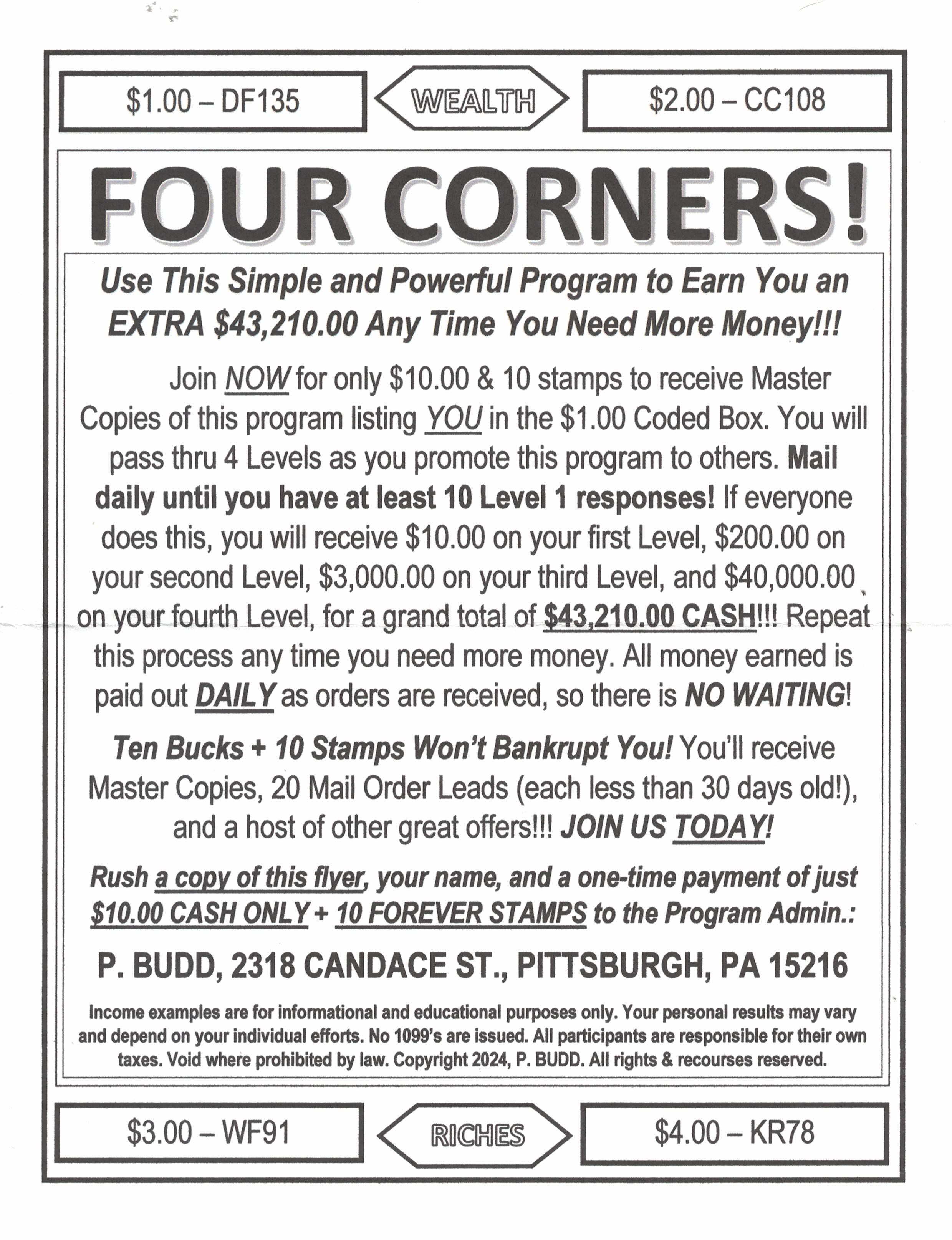 Your 8x11 circular or ad sheet (B&W) printed and mailed to 100 circulation. single-sided $12, double-sided $22. Darin Forey, PO Box 530008, St. Pete FL 33747