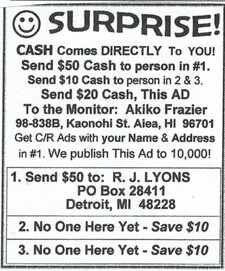 ![]() The Ad Blaster. 6500+ guaranteed circulation. Published in Shore To Shore, Liberty Press, JBR Home Mailer and online at www.MailOrderDaily.com. $7 per camera-ready inch. Publisher: Darin Forey, PO Box 530008, St. Pete FL 33747 The Fast 100 Ad Sheet. 100 circulation by first class mail plus unlimited online circulation at www.adsheets.net. $1 per camera-ready inch. Darin Forey, PO Box 530008, St. Pete FL 33747 Your listing here. Click for details ![]() Your listing here. Click for details ![]() 180 hot names on paper $8 or peel and stick labels $15. Darin Forey, PO Box 530008, Saint Pete FL 33747 Your listing here. Click for details | ![]() Your 8x11 circular or ad sheet (B&W) printed and mailed to 100 circulation. single-sided $12, double-sided $22. Darin Forey, PO Box 530008, St. Pete FL 33747 Your listing here. Click for details ![]() Your listing here. Click for details ![]() Your listing here. Click for details | ![]() Your 30 words or less typeset in to a 1" camera ready ad. You receive 9 copies of your new ad. $2 + 1 F/C stamp. Darin Forey, PO Box 530008, St. Pete FL 33747 Your 60 words or less typeset in to a 2" camera ready ad. You receive 9 copies of your new ad. $3 + 1 F/C stamp. Darin Forey, PO Box 530008, St. Pete FL 33747 Your 90 words or less typeset in to a 3" camera ready ad. You receive 9 copies of your new ad. $4 + 1 F/C stamp. Darin Forey, PO Box 530008, St. Pete FL 33747 Your listing here. Click for details ![]() Your listing here. Click for details |