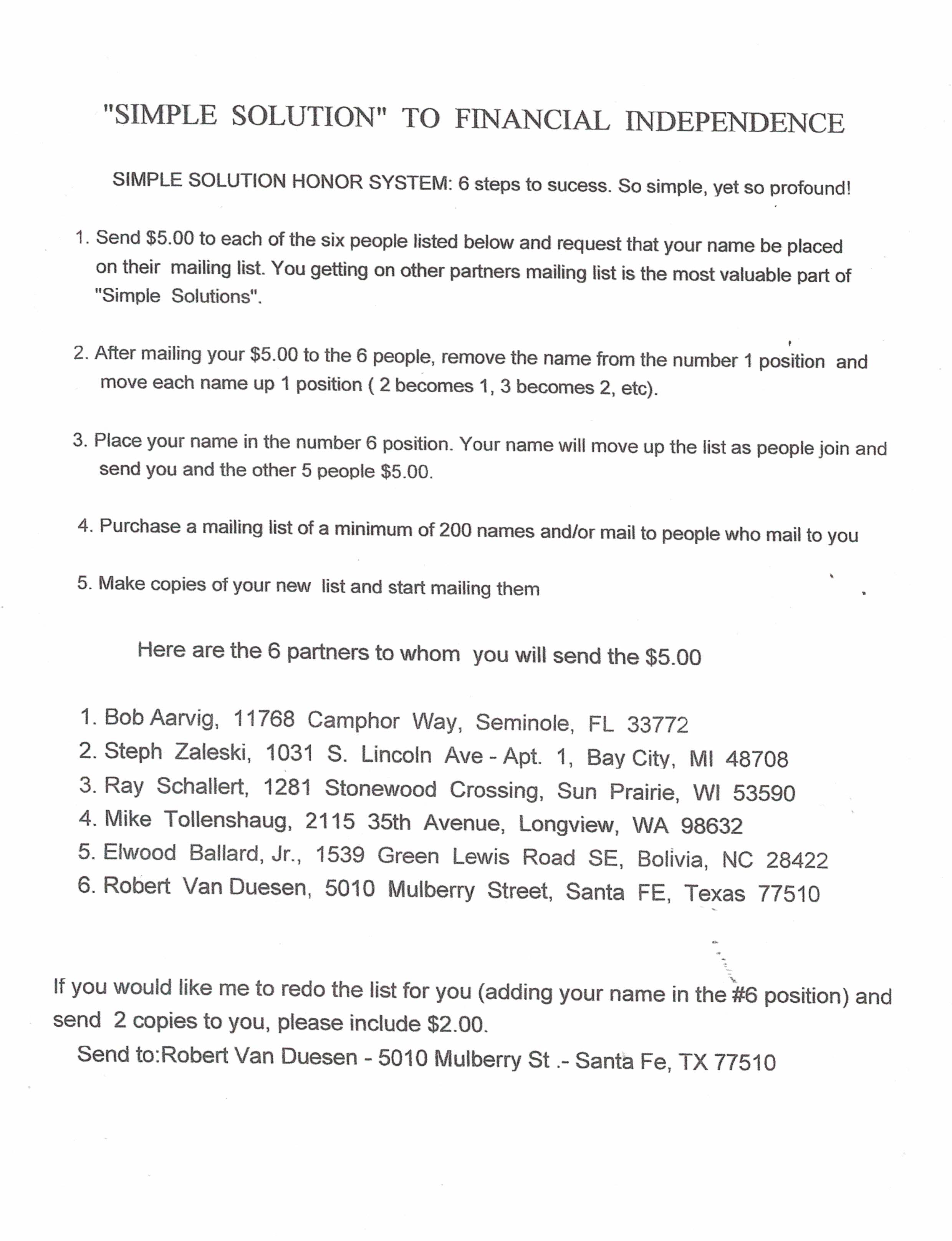 Join this great program that pays a whopping $50 on all people you recruit. Guarantees residual income and play the lotto too! One f/c stamp! Bill Maurer, 2801 Toledo Rd. Apt. 515, Elkhart IN 46516
