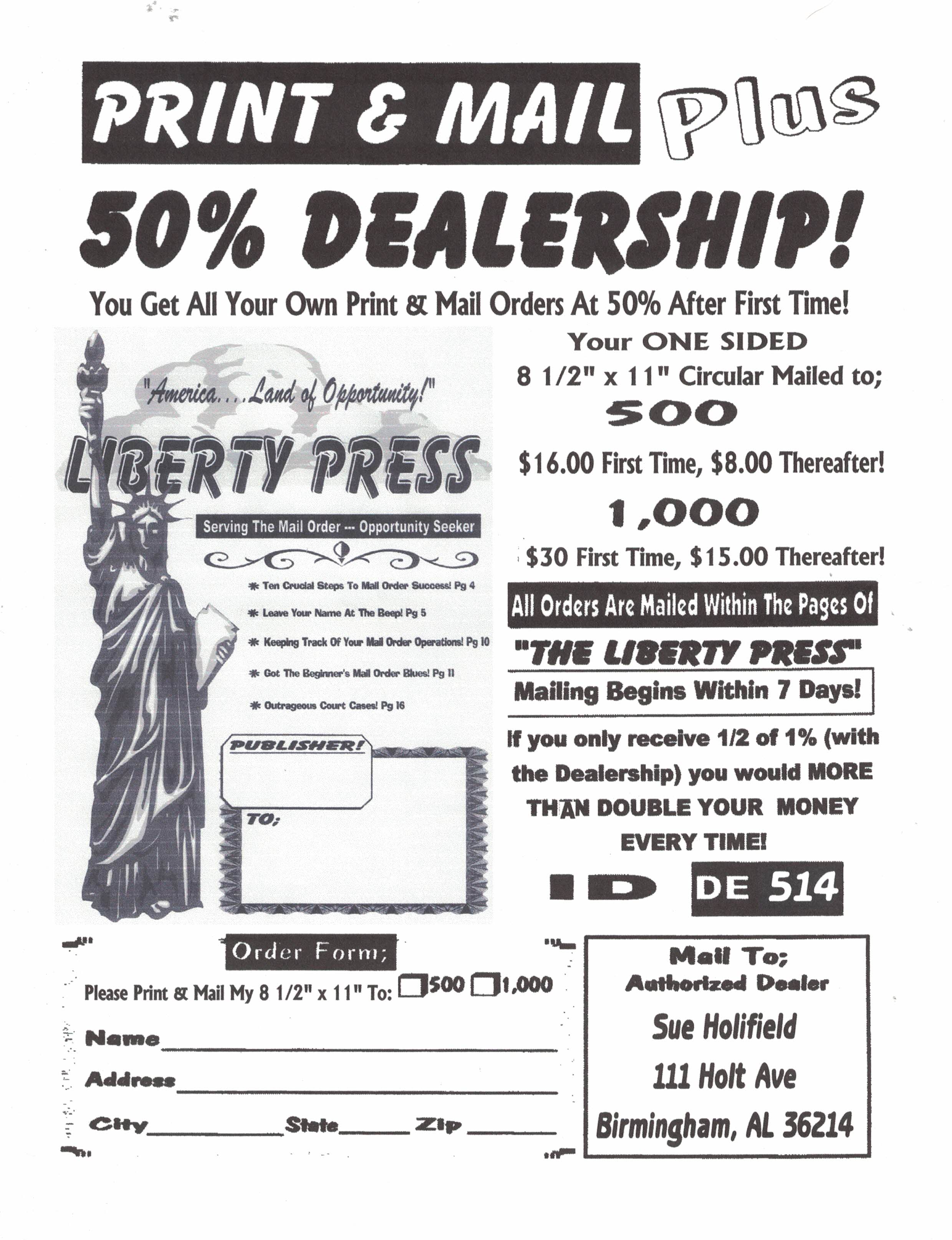 Your 8x11 circular or ad sheet (B&W) printed and mailed to 100 circulation. single-sided $12, double-sided $22. Darin Forey, PO Box 530008, St. Pete FL 33747