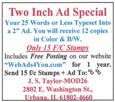 Why wait weeks or months to have your ads in circulation? Your 1" to 3" ads in 50 different ad sheets. 1,000,000 circulation only $60.00 + 6 F/C stamps to: Richard Lanier, 306 East 171 Street Apt. 2-F, Bronx NY 10457. Send cash or money order only.