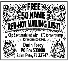 Your 60 words or less typeset in to a 2" camera ready ad. You receive 9 copies of your new ad. $3 + 1 F/C stamp. Darin Forey, PO Box 530008, St. Pete FL 33747
