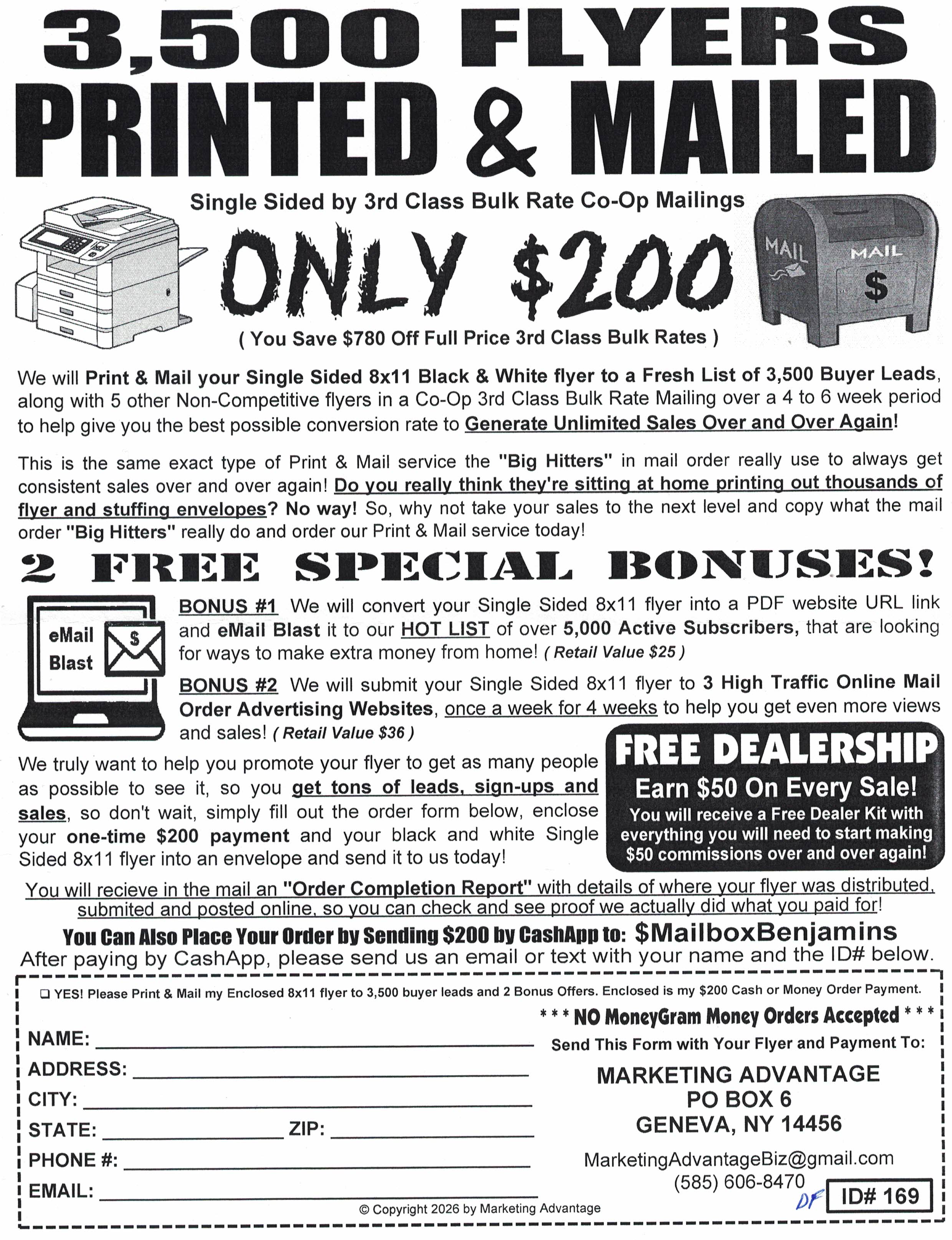 Your 8x11 circular or ad sheet (B&W) printed and mailed to 100 circulation. single-sided $12, double-sided $22. Darin Forey, PO Box 530008, St. Pete FL 33747