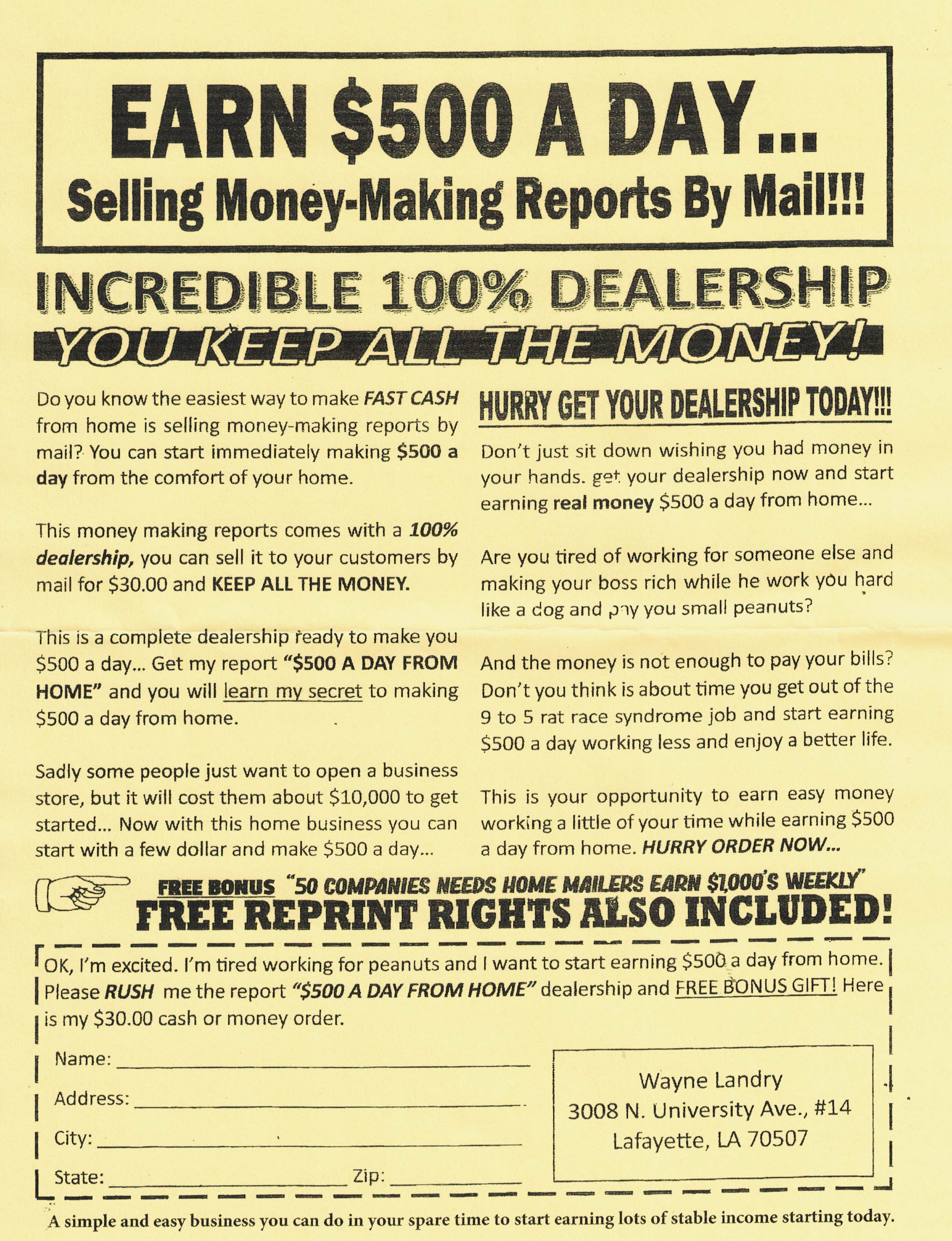 ![]() Big D's Mail Order Advertiser. 100 circulation by first class mail + online 1 full year at www.BigDsAds.com. 1"-$2, 2"-$3, 3"-$4, 8x11(1-sided)-$12. Send ads and payment to: Darin Forey, PO Box 530008, St. Pete FL 33747 Your listing here. Click for details ![]() Your listing here. Click for details ![]() 180 hot names on paper $8 or peel and stick labels $15. Darin Forey, PO Box 530008, Saint Pete FL 33747 Your listing here. Click for details | ![]() Your 8x11 circular or ad sheet (B&W) printed and mailed to 100 circulation. single-sided $12, double-sided $22. Darin Forey, PO Box 530008, St. Pete FL 33747 Your listing here. Click for details ![]() Your listing here. Click for details ![]() Your listing here. Click for details | ![]() Your 30 words or less typeset in to a 1" camera ready ad. You receive 9 copies of your new ad. $2 + 1 F/C stamp. Darin Forey, PO Box 530008, St. Pete FL 33747 Your 90 words or less typeset in to a 3" camera ready ad. You receive 9 copies of your new ad. $4 + 1 F/C stamp. Darin Forey, PO Box 530008, St. Pete FL 33747 Your 60 words or less typeset in to a 2" camera ready ad. You receive 9 copies of your new ad. $3 + 1 F/C stamp. Darin Forey, PO Box 530008, St. Pete FL 33747 Your listing here. Click for details ![]() Your listing here. Click for details |
