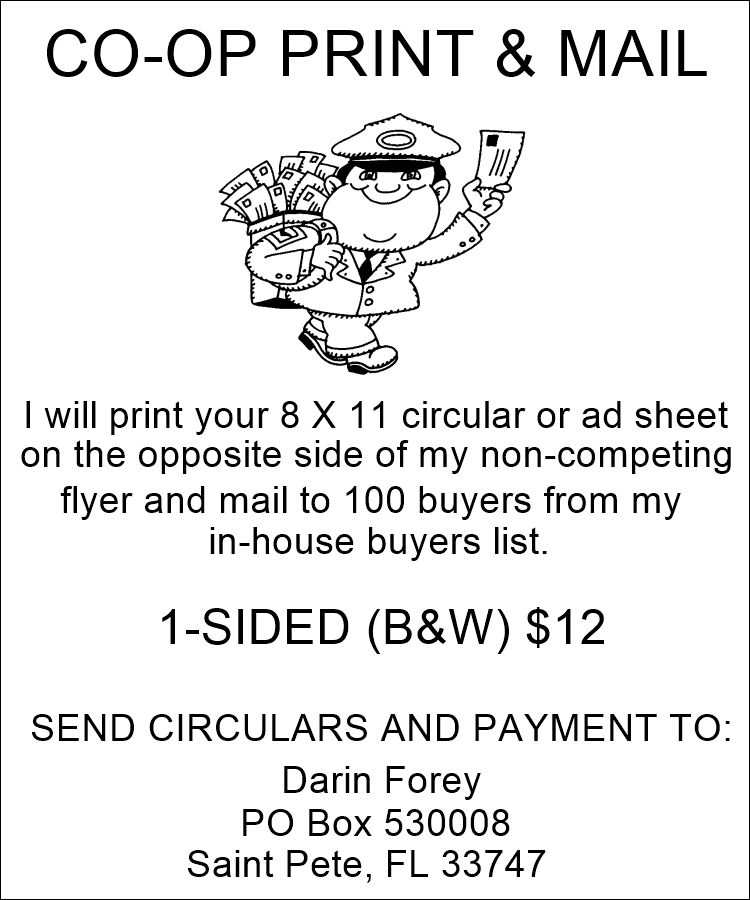 | Double-sided 8 X 11 circular or ad sheet .................................................... $5 for 6 months | Mail Order Services Directory Listing ........................... $1.50 - $3 per month (see pricing) |