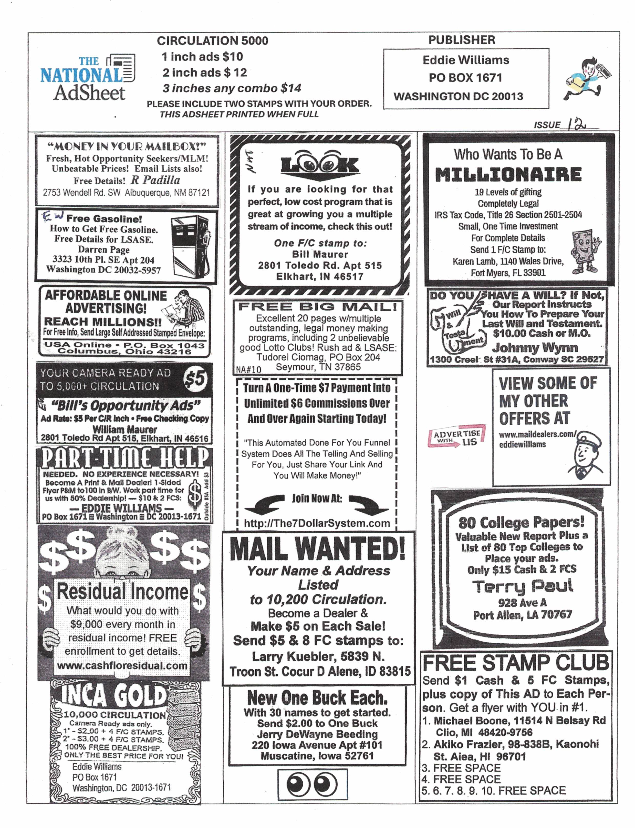 Why wait weeks or months to have your ads in circulation? Your 1" to 3" ads in 50 different ad sheets. 1,000,000 circulation only $60.00 + 6 F/C stamps to: Richard Lanier, 306 East 171 Street Apt. 2-F, Bronx NY 10457. Send cash or money order only.