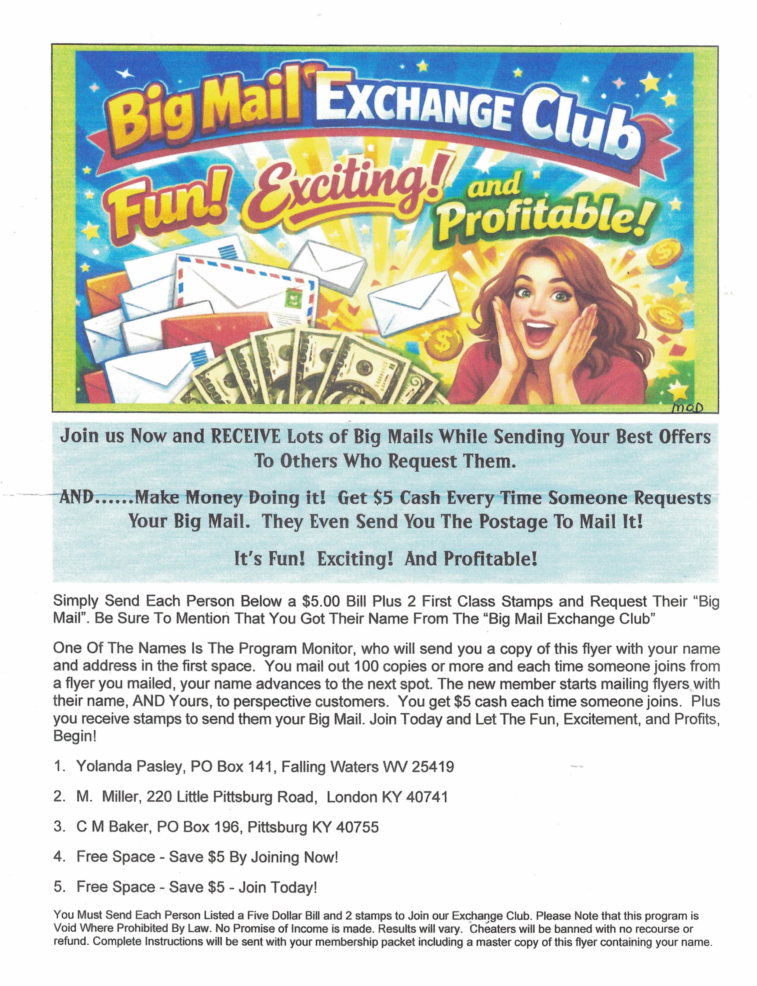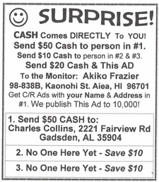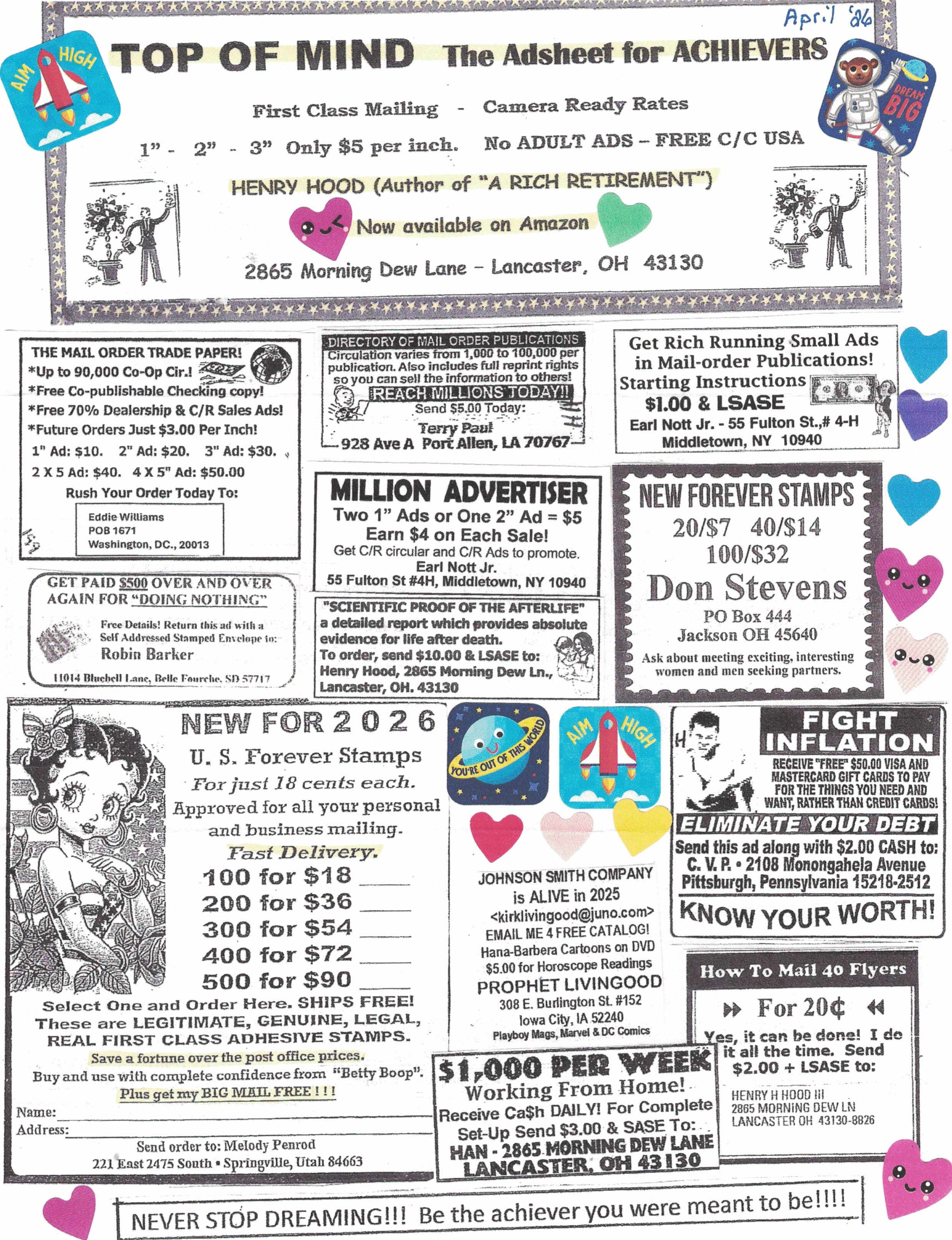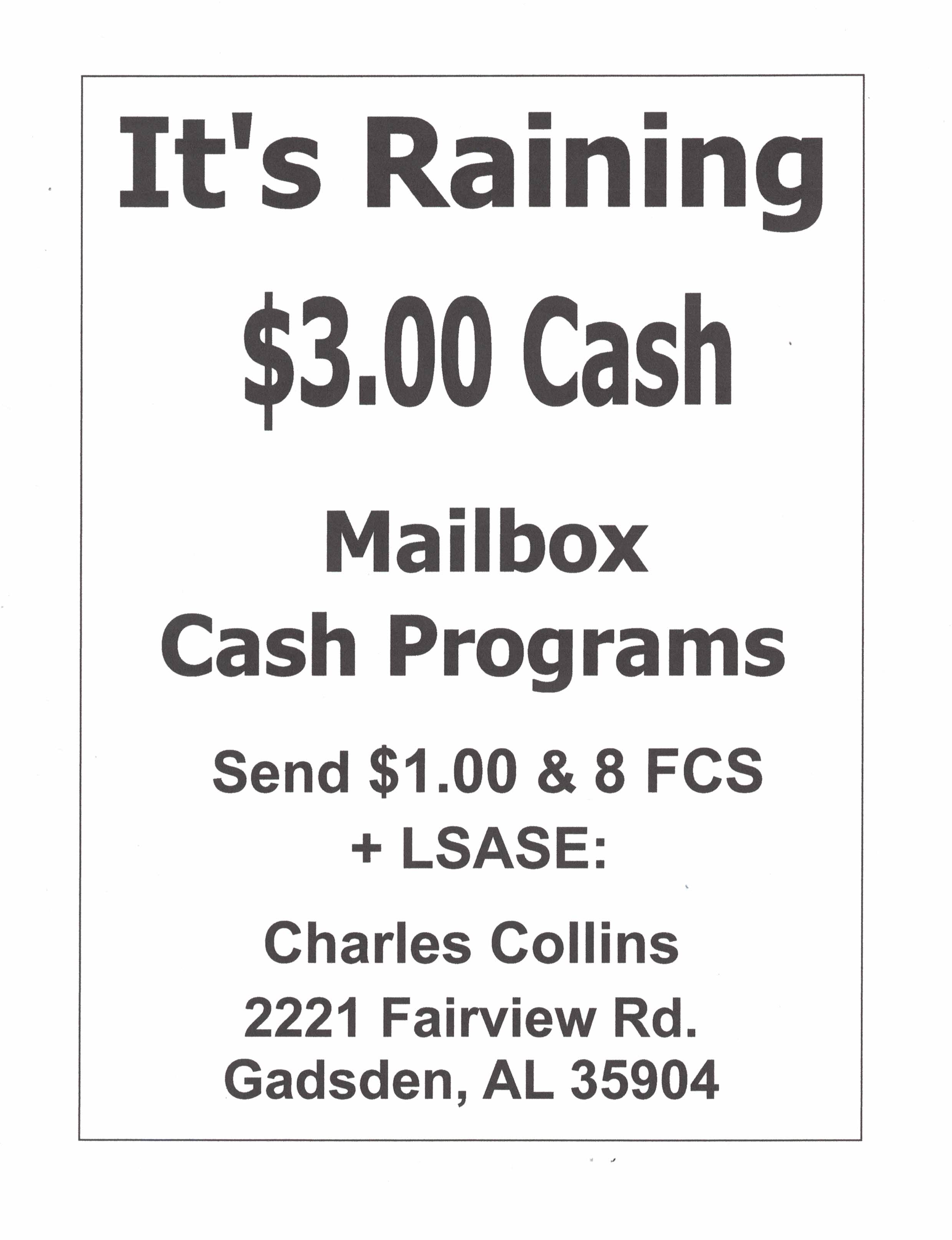 4/7/26 - Big D's Mail Order Advertiser Issue #0426 has been published. You can view it online by clicking here. 3/16/26 - Mail dealer Charles Collins of Gadsden, AL has returned from vacation and open for cash gifting across the country. 3/7/26 - NEW! Need to contact the publisher? Save a stamp and click the link above with your questions or comments. I will respond by email. |