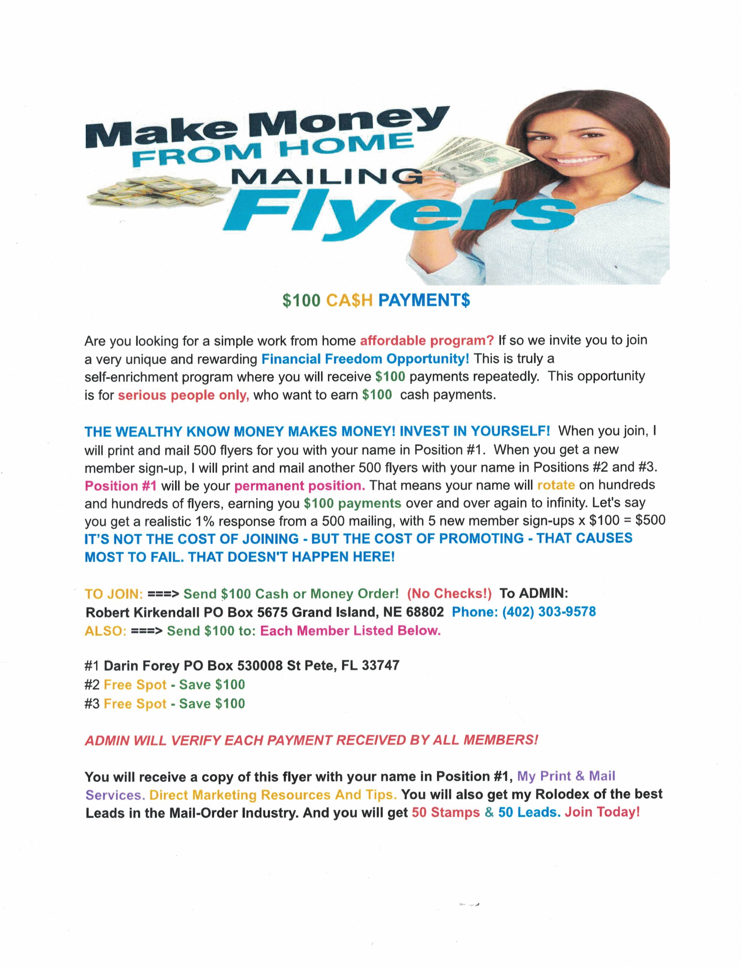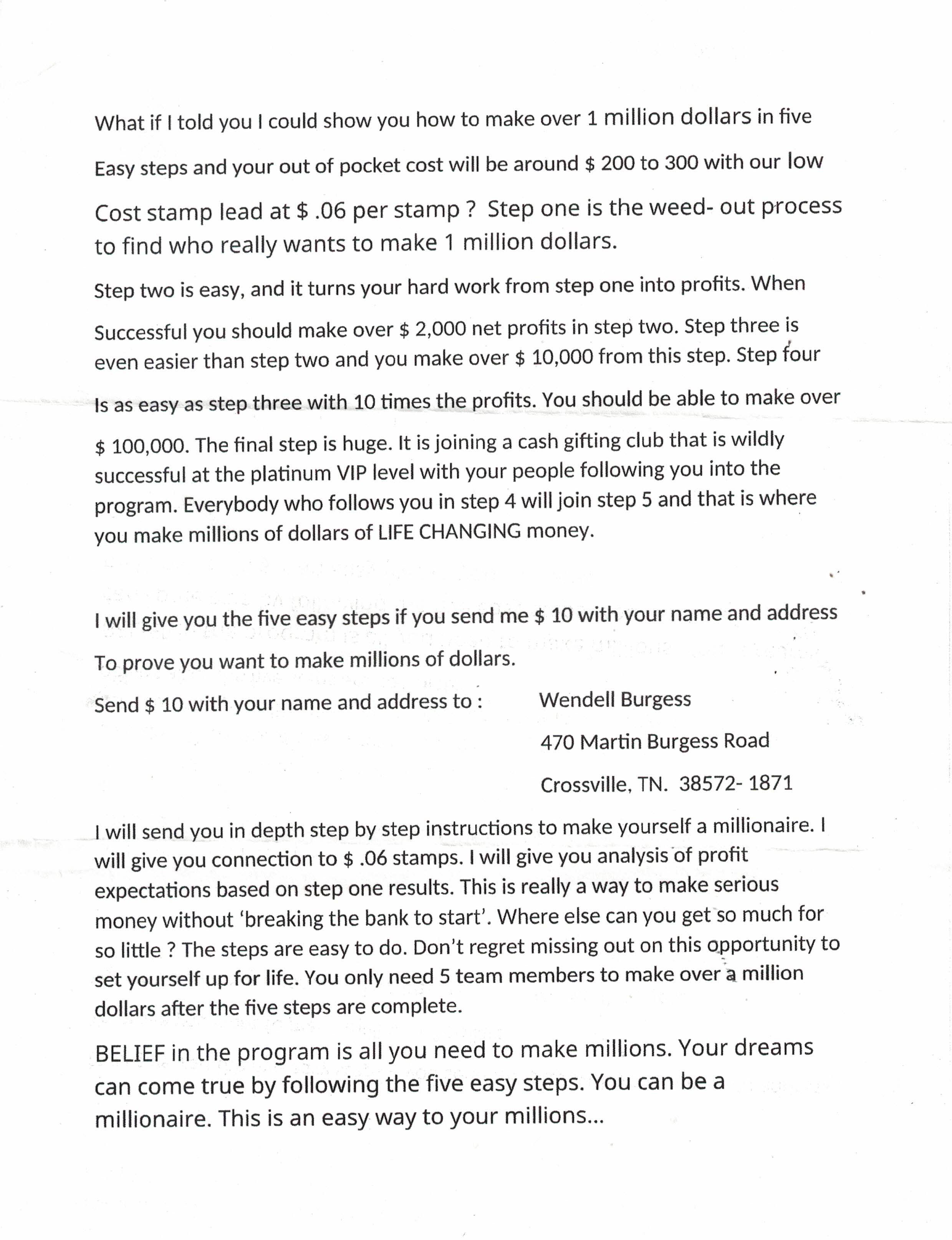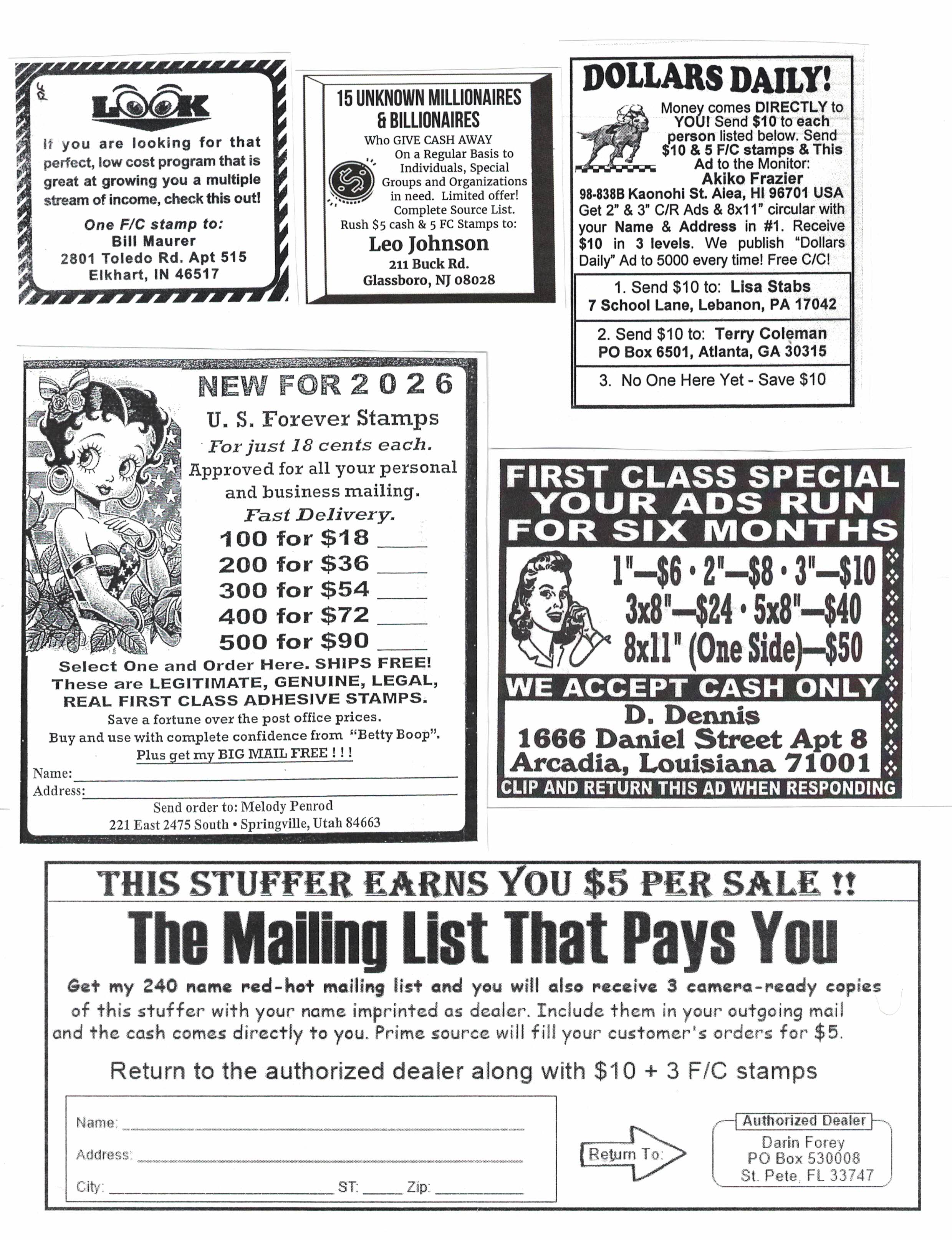 Never be broke again. Join these 20 millionaire programs. Cash will flood your mailbox. Mail $5 + 5 stamps to: Millionaire, PO Box 3084, Memphis TN 38173