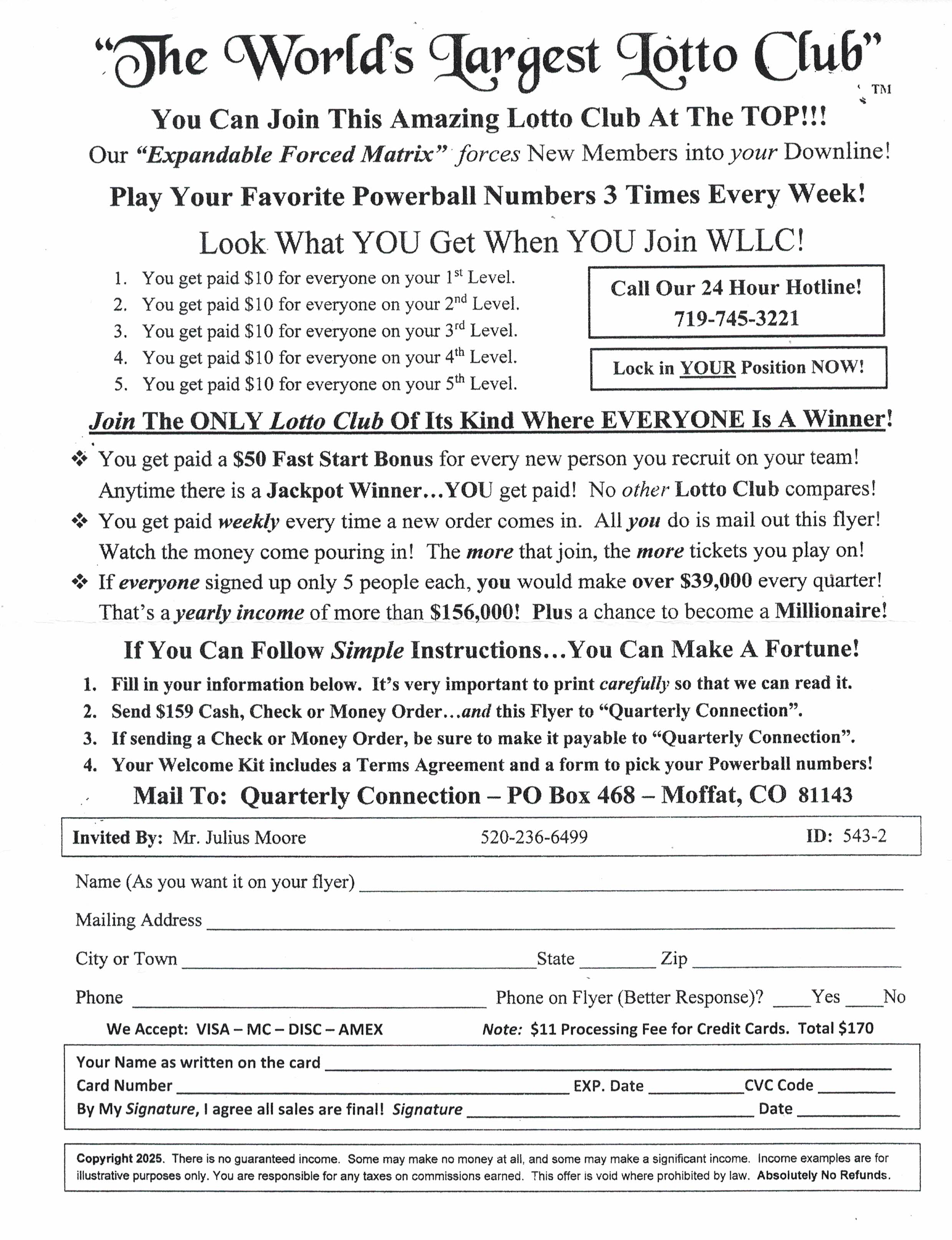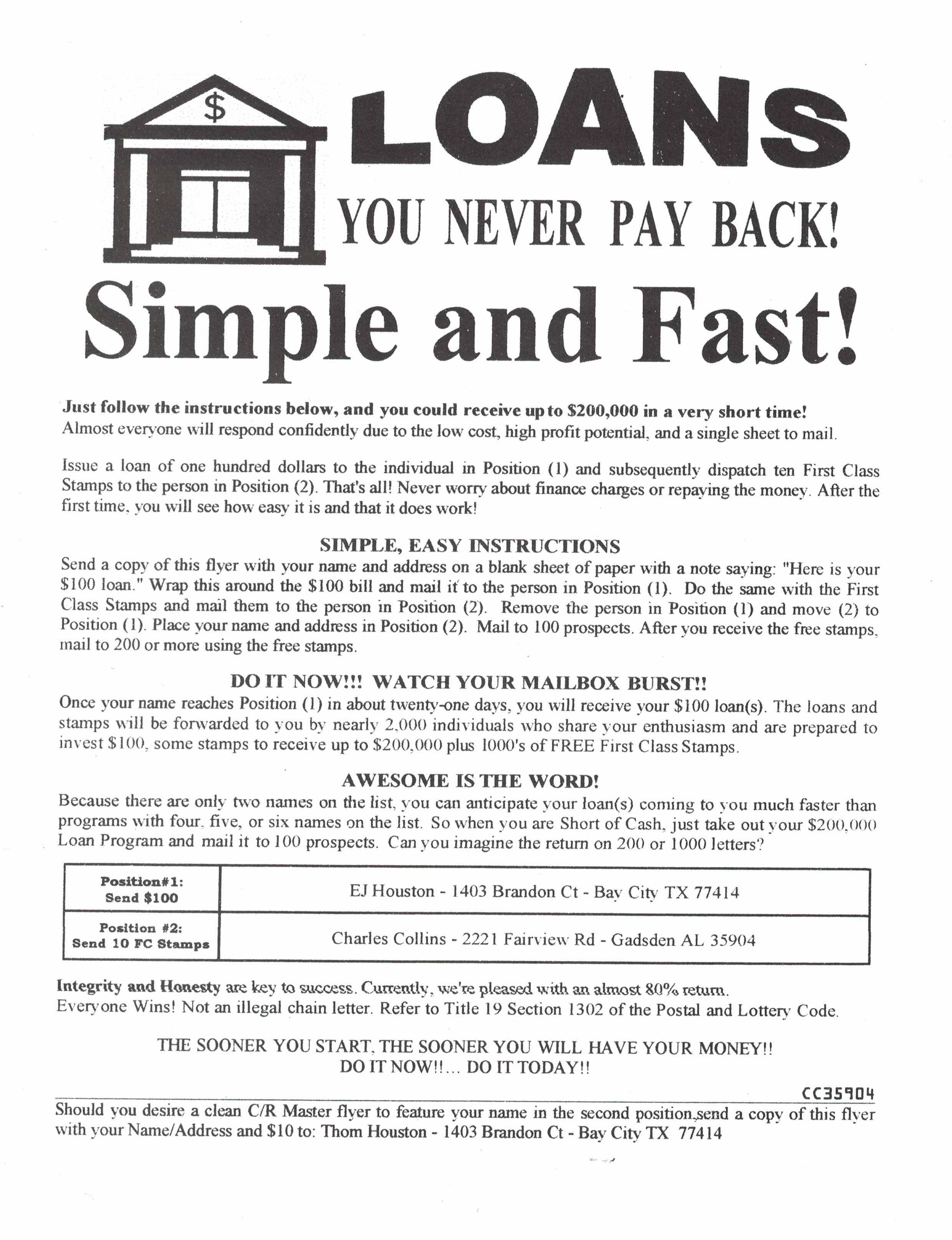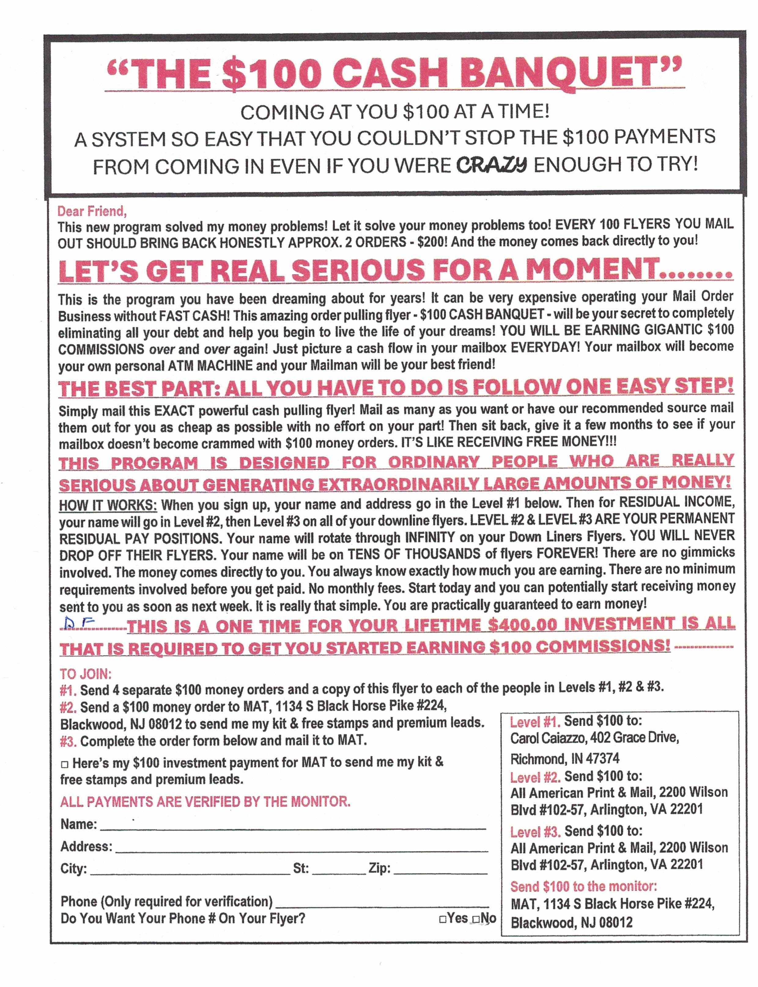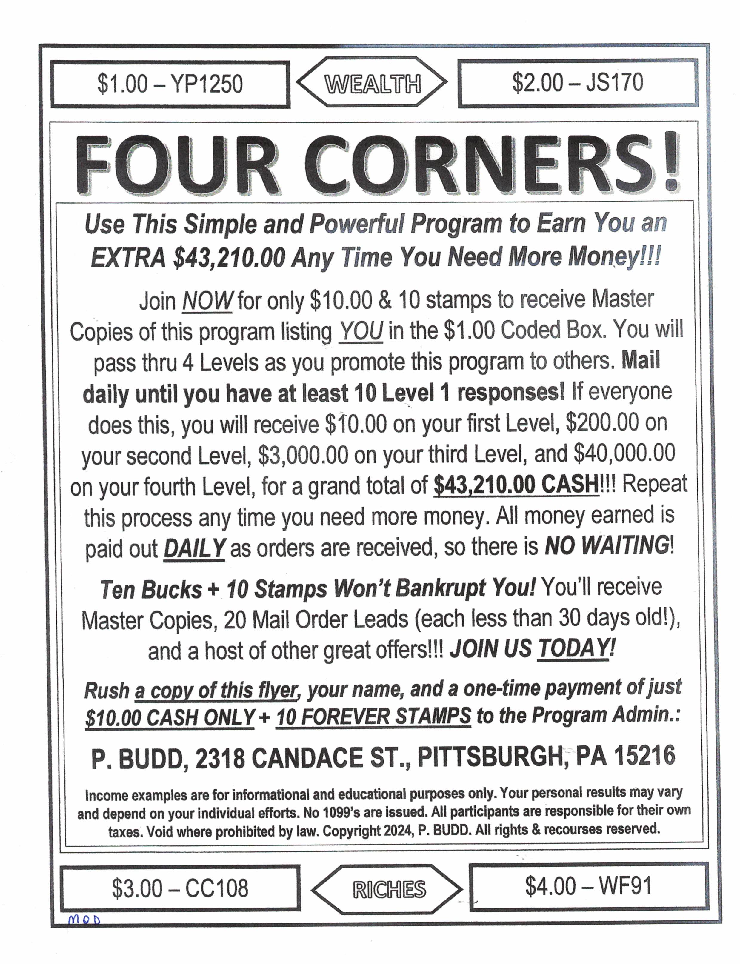 Never be broke again. Join these 20 millionaire programs. Cash will flood your mailbox. Mail $5 + 5 stamps to: Millionaire, PO Box 3084, Memphis TN 38173