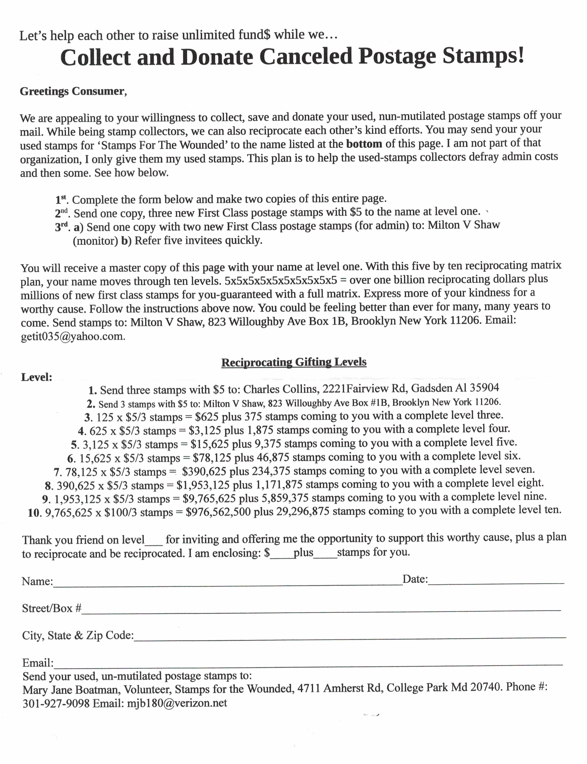 3/16/26 - Mail dealer Charles Collins of Gadsden, AL has returned from vacation and open for cash gifting across the country.