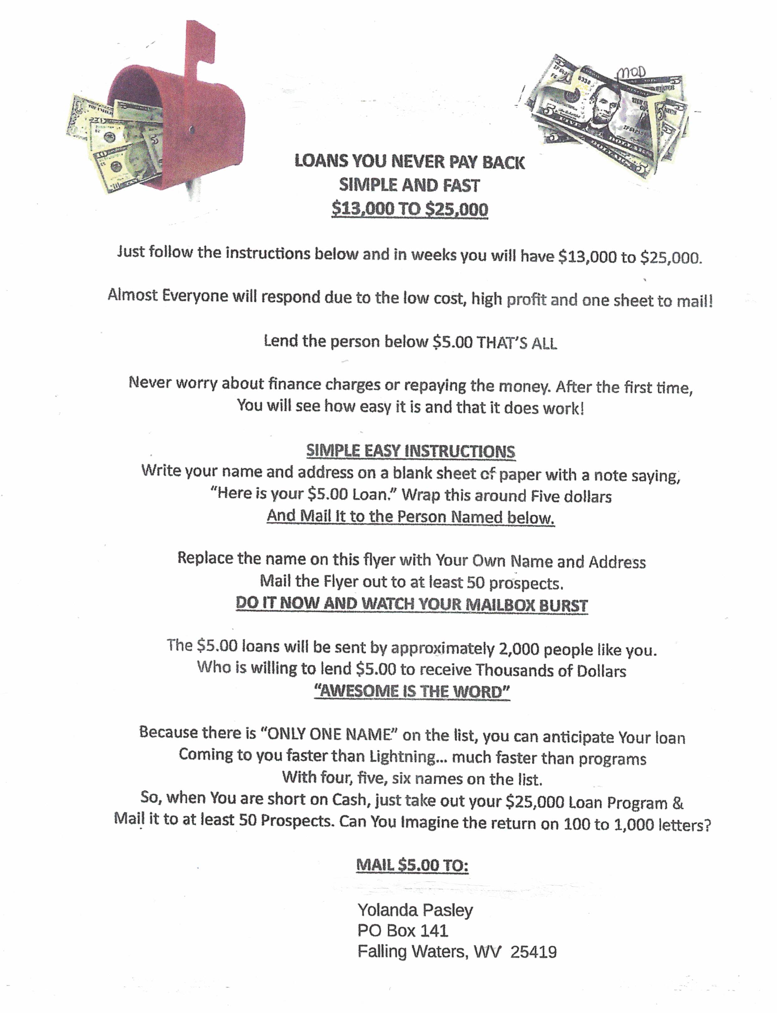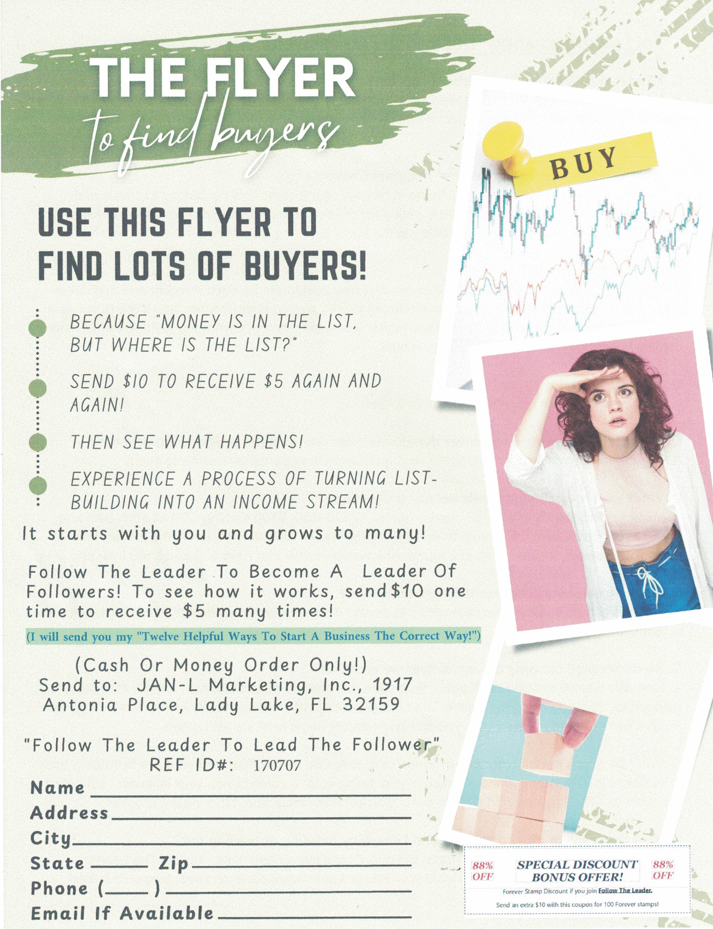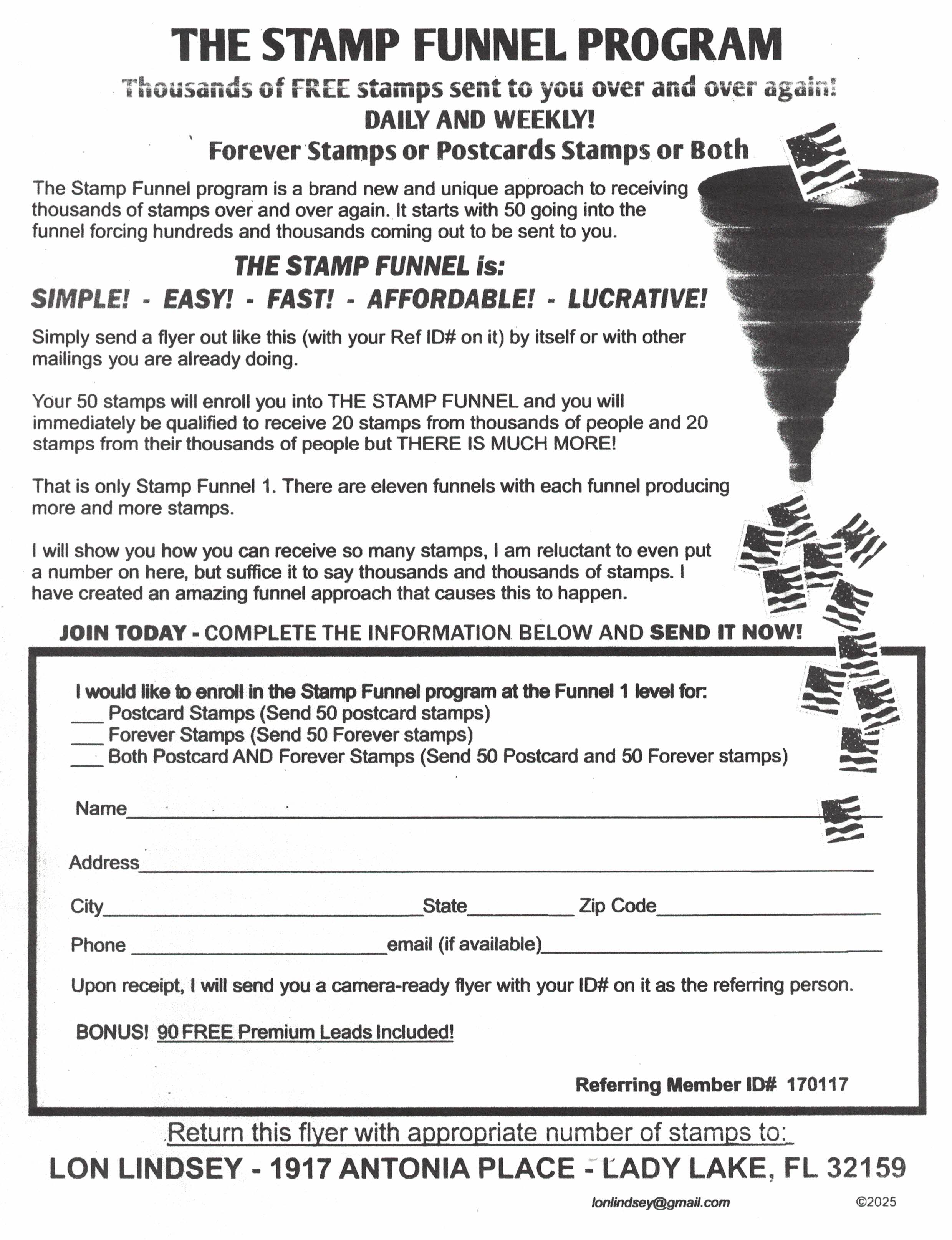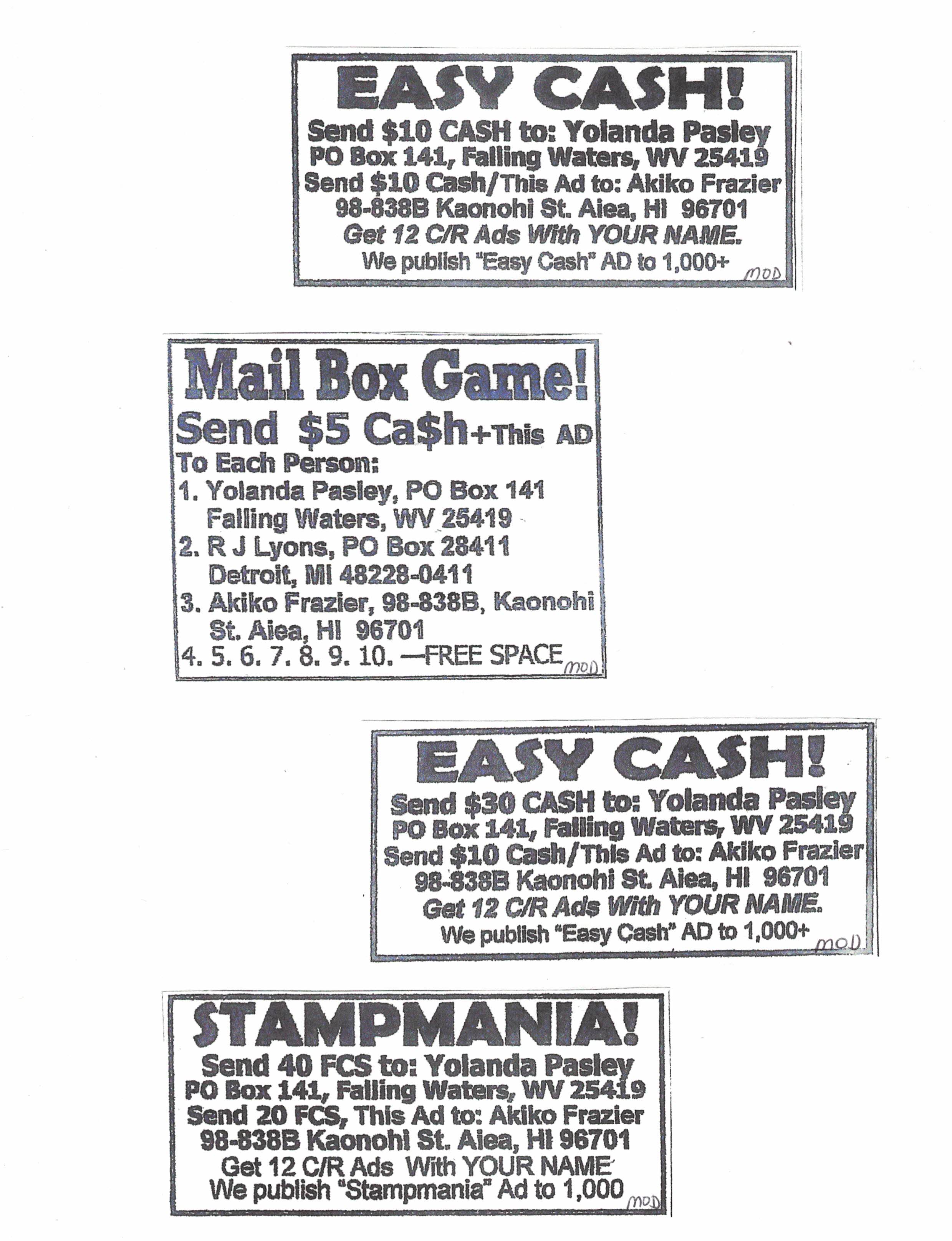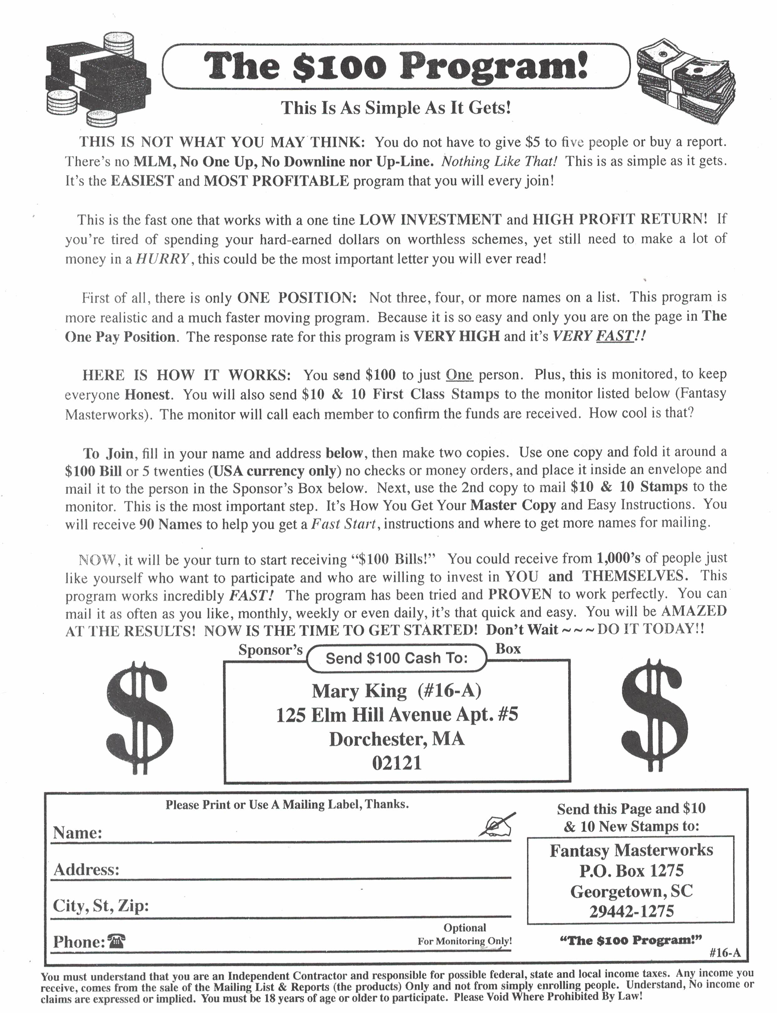 Join this great program that pays a whopping $50 on all people you recruit. Guarantees residual income and play the lotto too! One f/c stamp! Bill Maurer, 2801 Toledo Rd. Apt. 515, Elkhart IN 46516