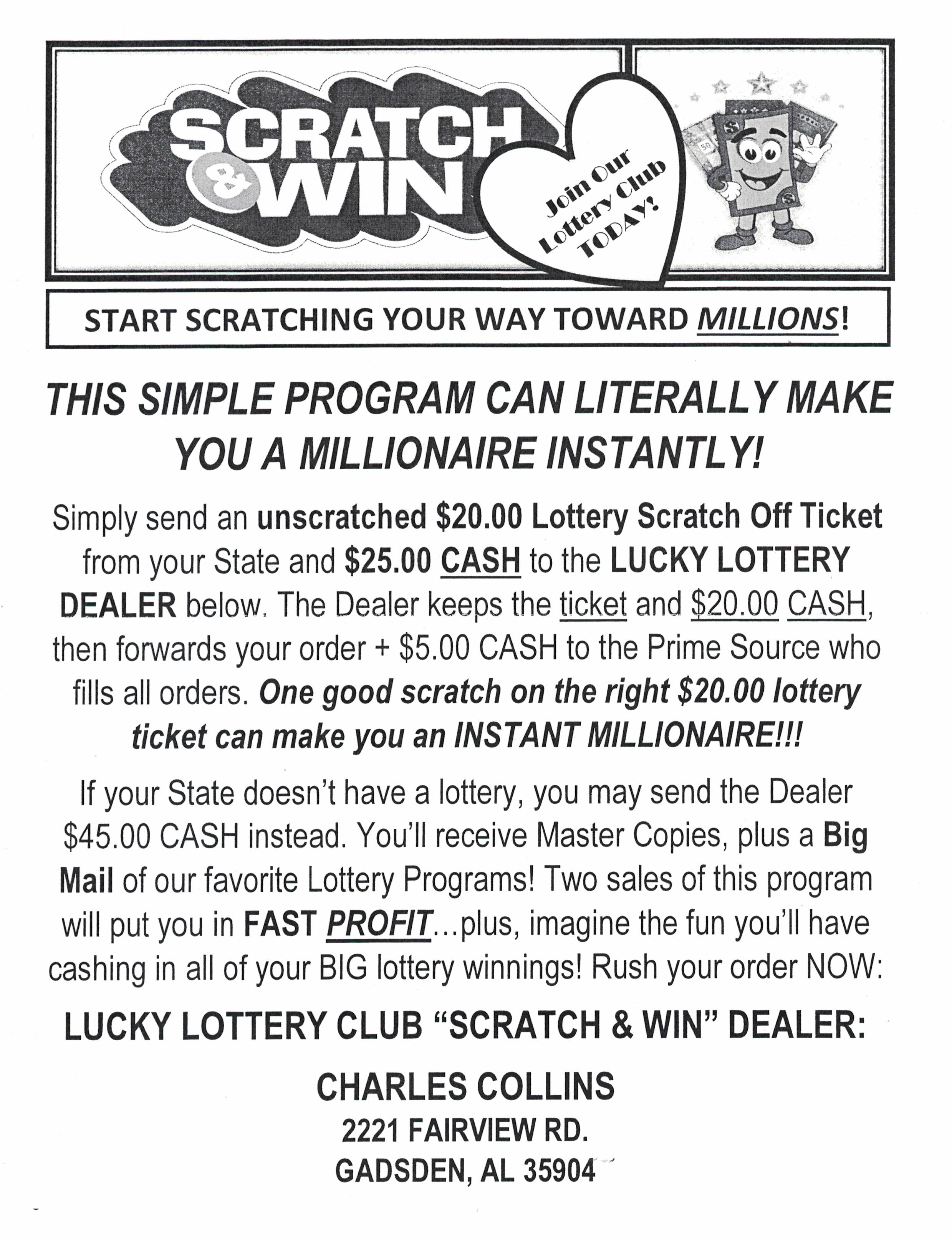 Smartz Lotto Club. Lifetime membership $19. 100% money & ticket winnings. Send SASE for information. Kitty Regis, 12091 McCandliss Dr., Gulfport MS 30503-2641