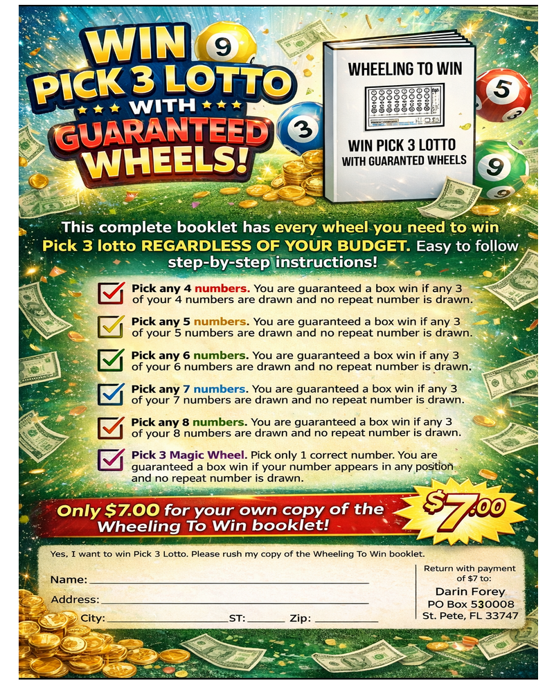 Your 8x11 circular or ad sheet (B&W) printed and mailed to 100 circulation. single-sided $12, double-sided $22. Darin Forey, PO Box 530008, St. Pete FL 33747