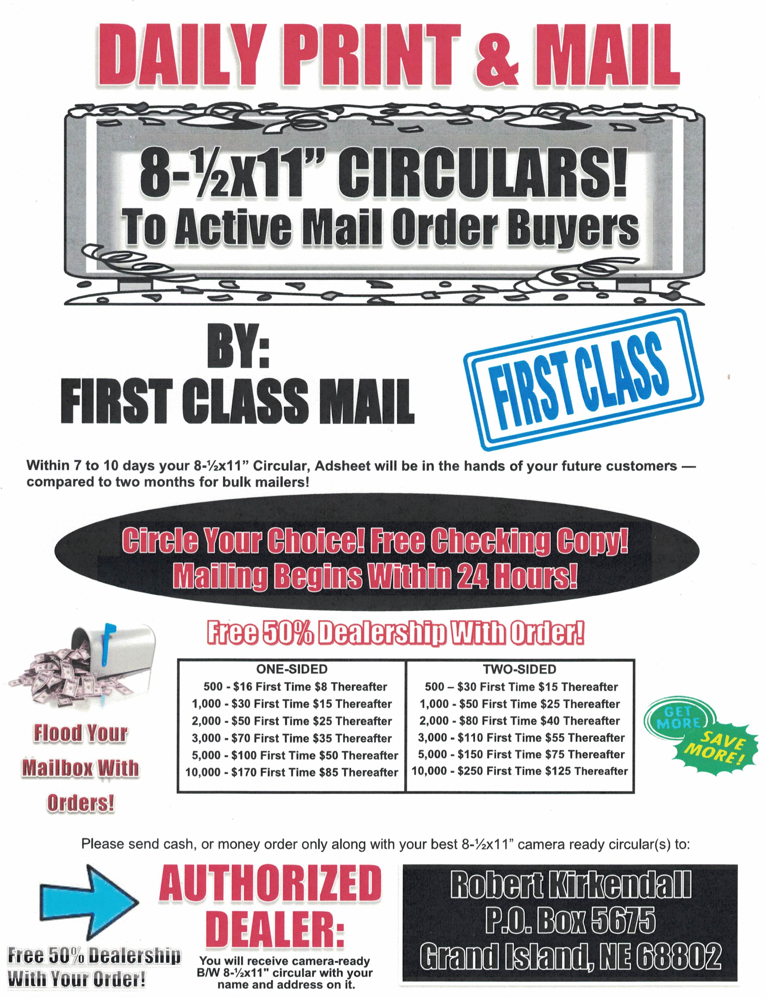 Double-sided 8 X 11 circular or ad sheet .................................................... $5 for 6 months