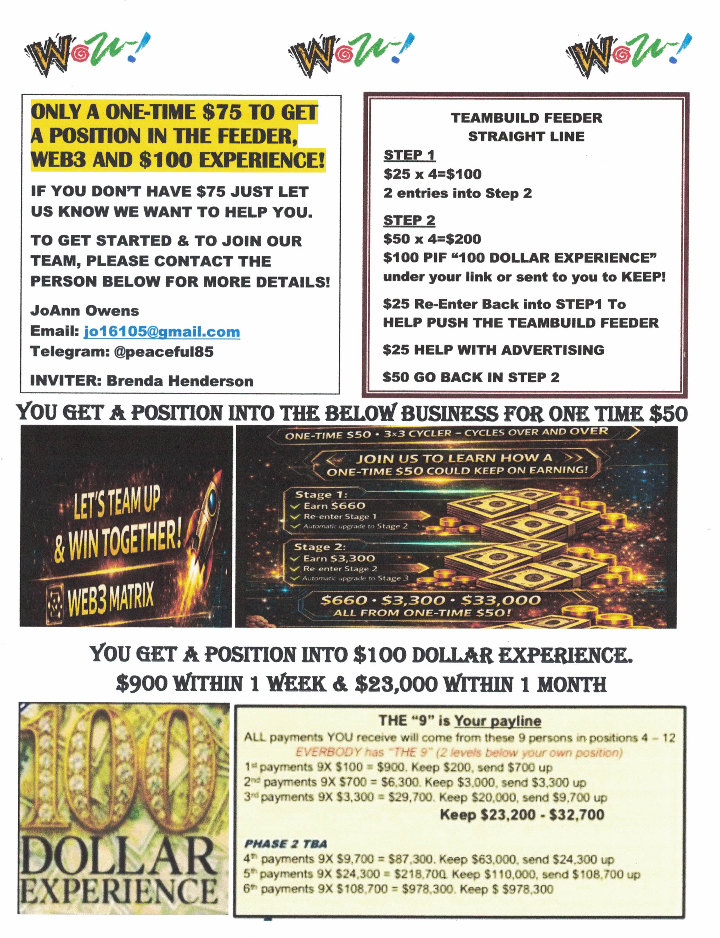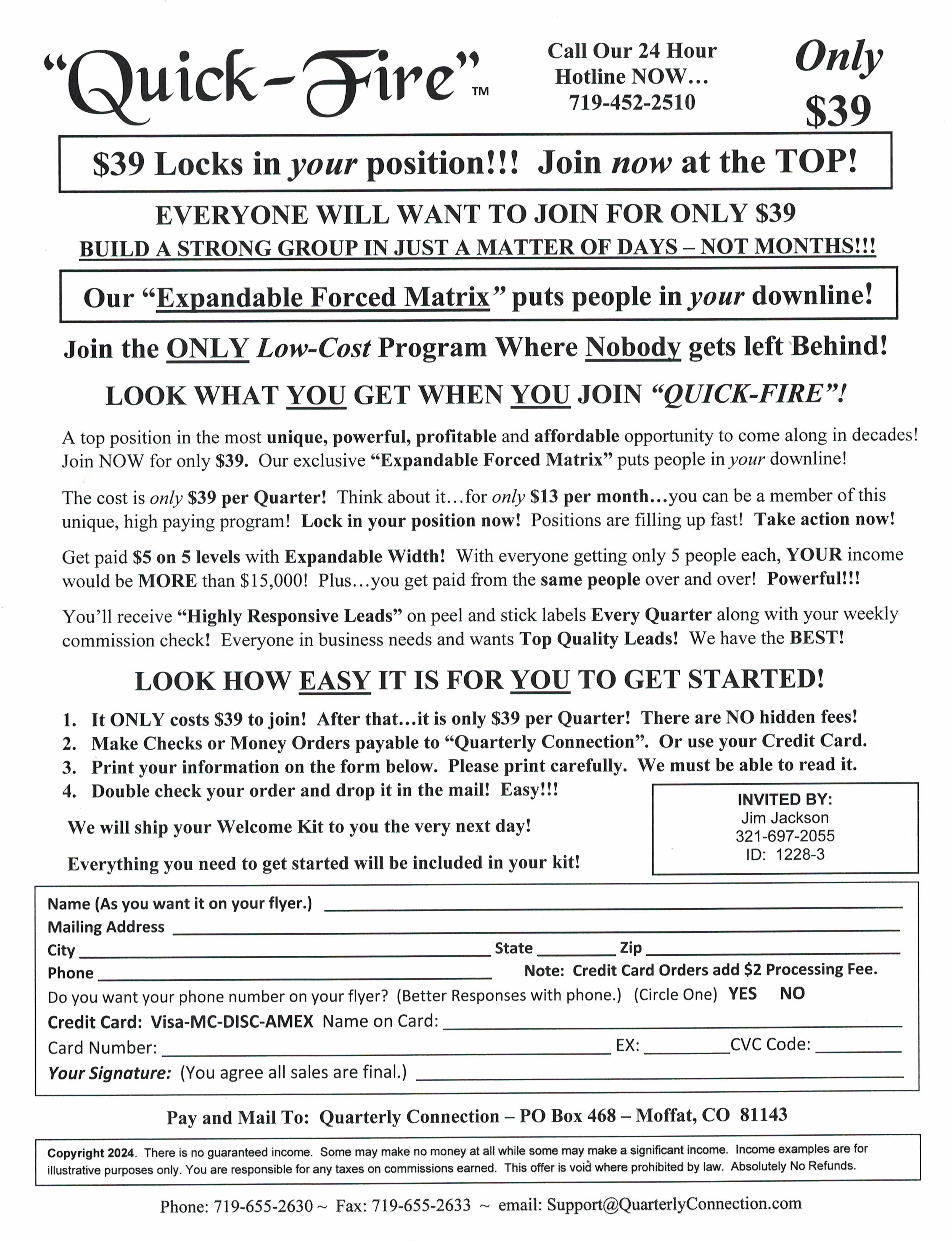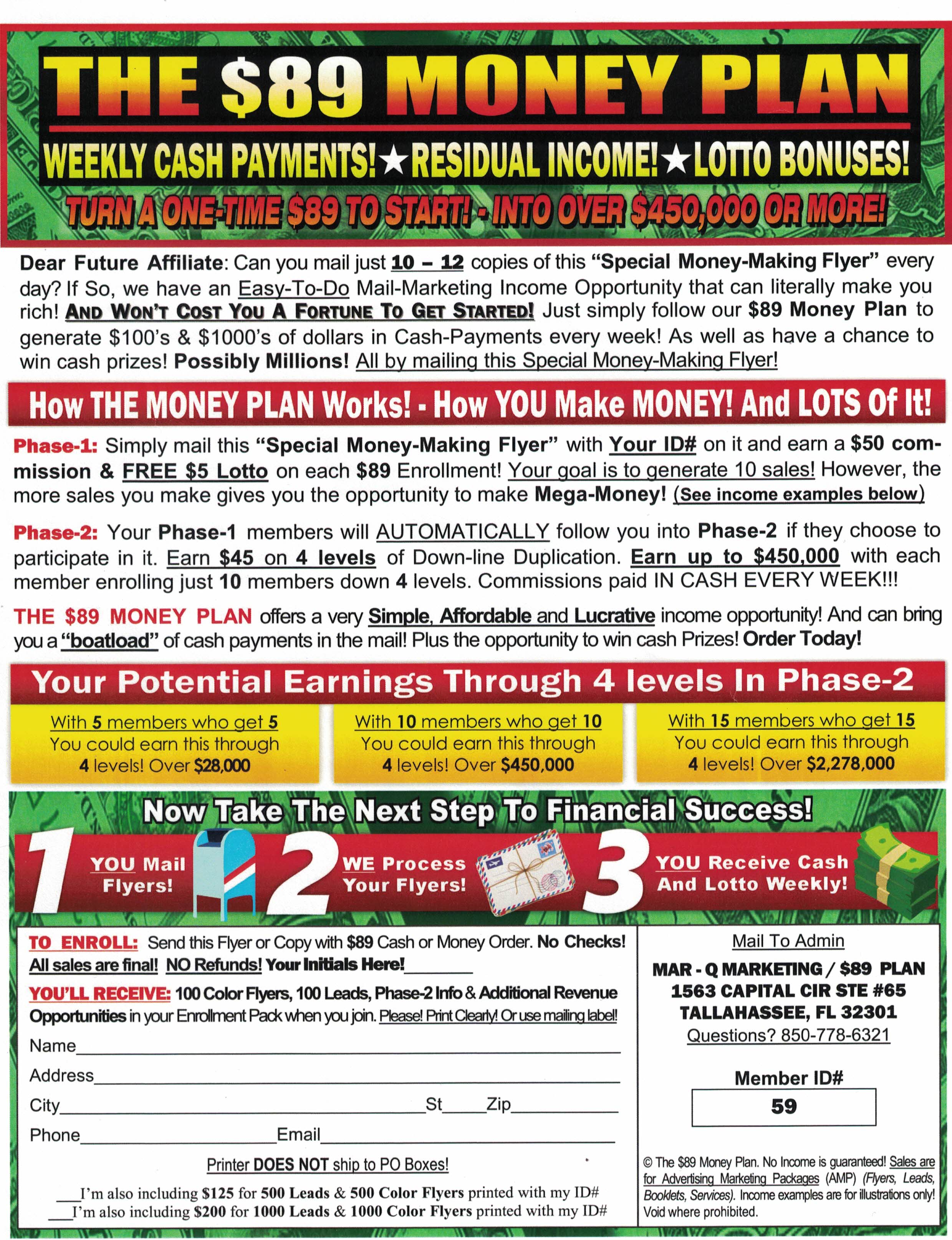 Join this great program that pays a whopping $50 on all people you recruit. Guarantees residual income and play the lotto too! One f/c stamp! Bill Maurer, 2801 Toledo Rd. Apt. 515, Elkhart IN 46516