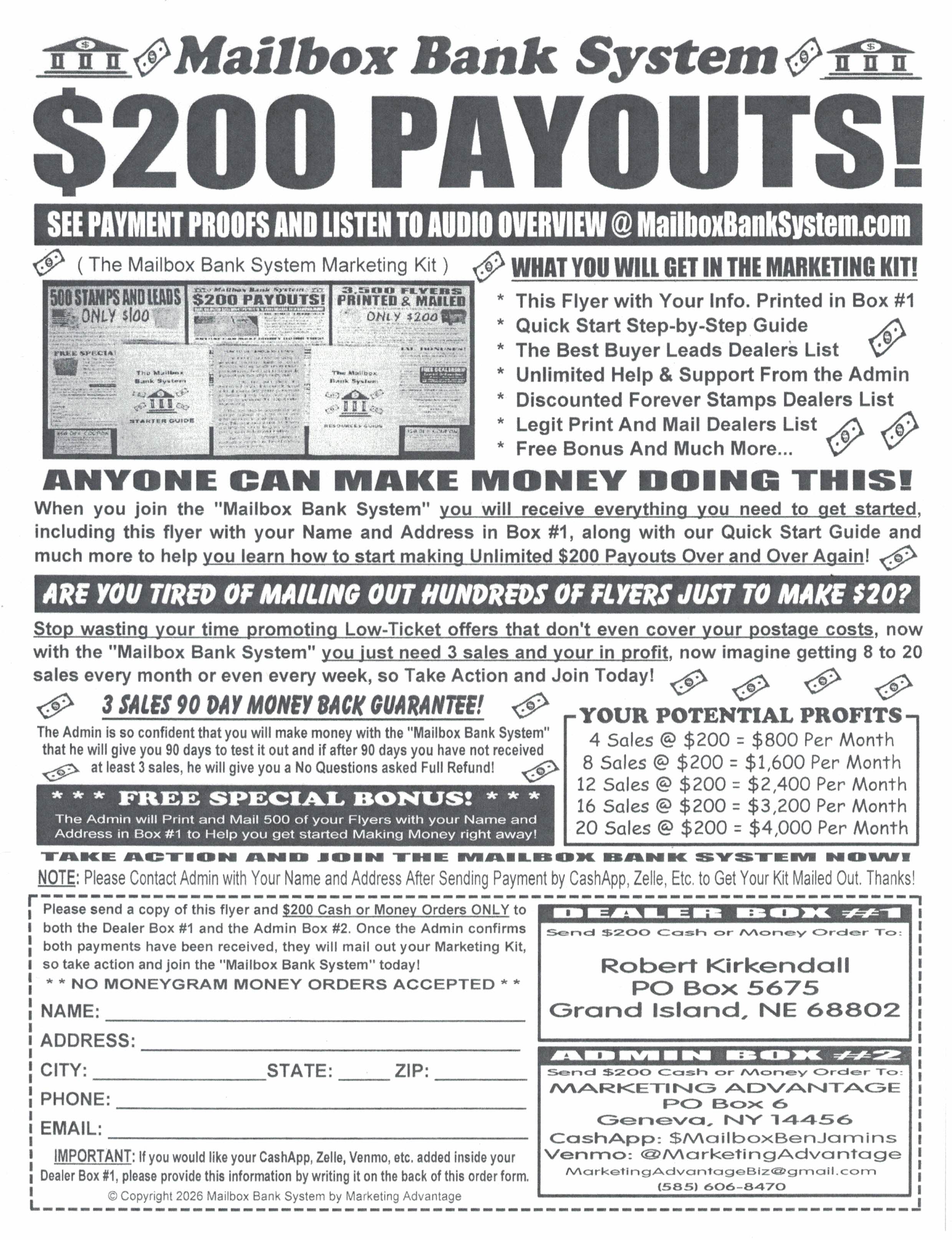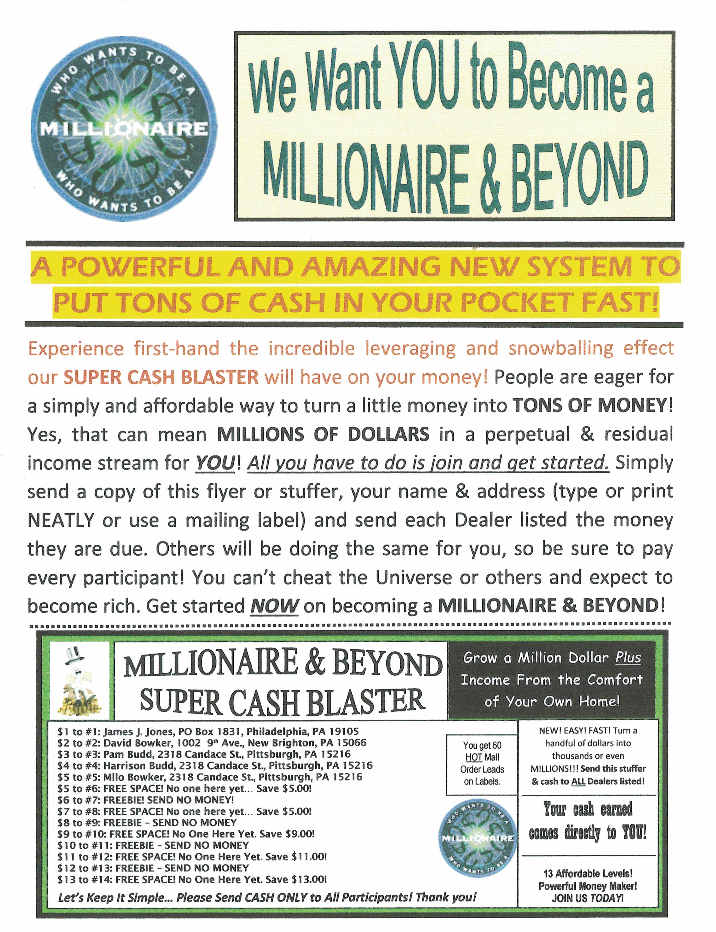 Never be broke again. Join these 20 millionaire programs. Cash will flood your mailbox. Mail $5 + 5 stamps to: Millionaire, PO Box 3084, Memphis TN 38173