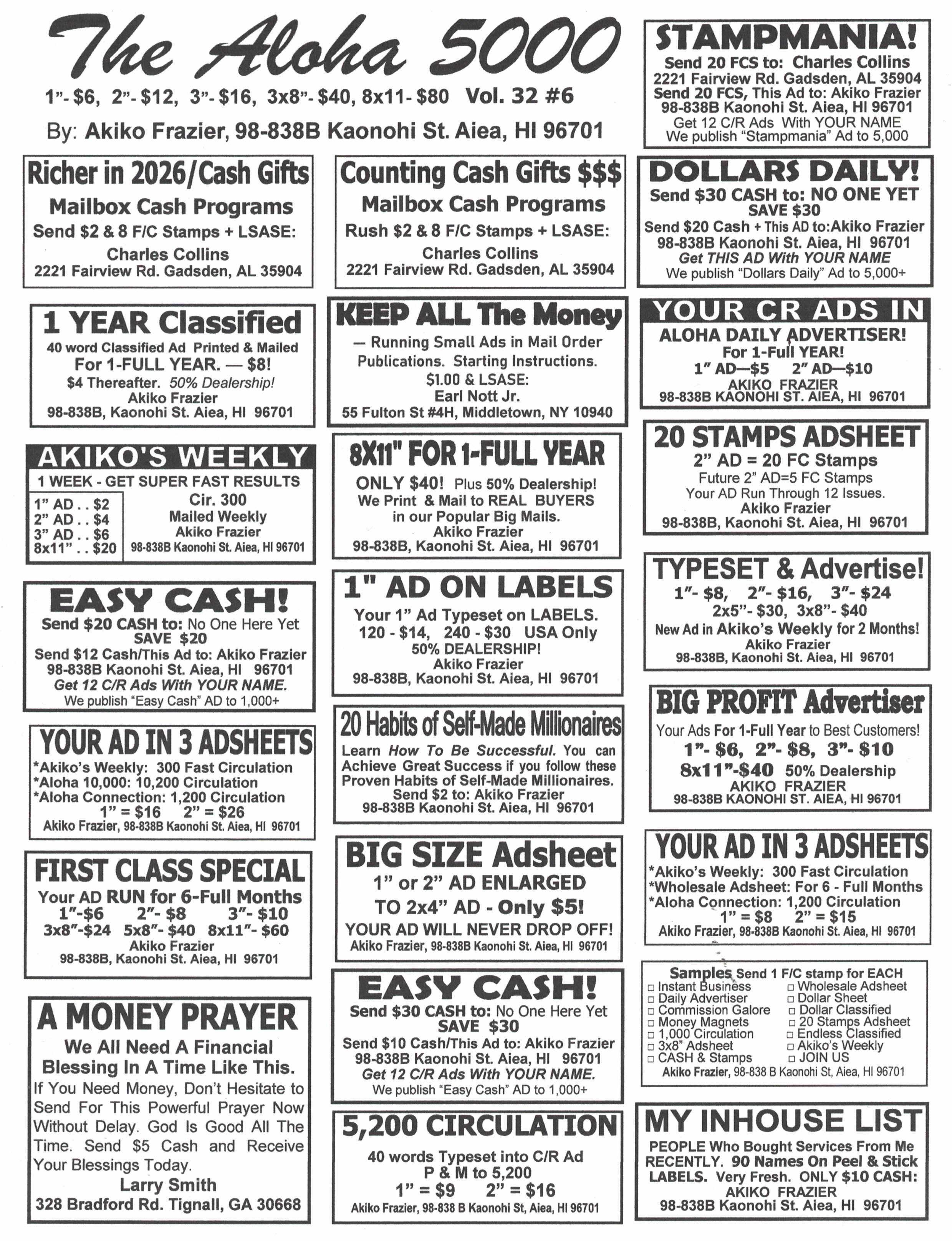 ![]() Big D's Mail Order Advertiser. 100 circulation by first class mail + online 1 full year at www.BigDsAds.com. 1"-$2, 2"-$3, 3"-$4, 8x11(1-sided)-$12. Send ads and payment to: Darin Forey, PO Box 530008, St. Pete FL 33747 Your listing here. Click for details ![]() Your listing here. Click for details ![]() 180 hot names on paper $8 or peel and stick labels $15. Darin Forey, PO Box 530008, Saint Pete FL 33747 Your listing here. Click for details | ![]() Your 8x11 circular or ad sheet (B&W) printed and mailed to 100 circulation. single-sided $12, double-sided $22. Darin Forey, PO Box 530008, St. Pete FL 33747 Your listing here. Click for details ![]() Your listing here. Click for details ![]() Your listing here. Click for details | ![]() Your 30 words or less typeset in to a 1" camera ready ad. You receive 9 copies of your new ad. $2 + 1 F/C stamp. Darin Forey, PO Box 530008, St. Pete FL 33747 Your 90 words or less typeset in to a 3" camera ready ad. You receive 9 copies of your new ad. $4 + 1 F/C stamp. Darin Forey, PO Box 530008, St. Pete FL 33747 Your 60 words or less typeset in to a 2" camera ready ad. You receive 9 copies of your new ad. $3 + 1 F/C stamp. Darin Forey, PO Box 530008, St. Pete FL 33747 Your listing here. Click for details ![]() Your listing here. Click for details |