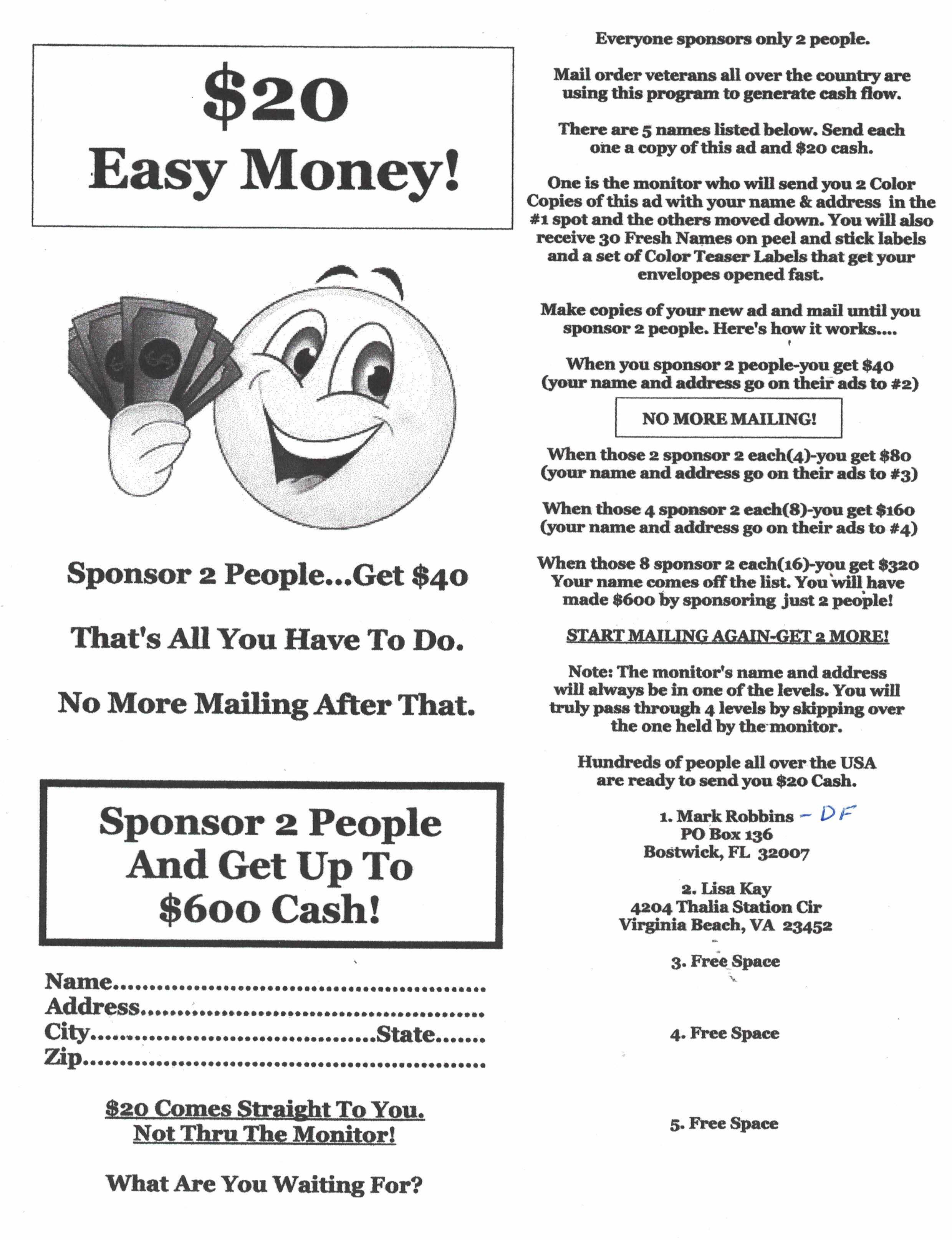 Never be broke again. Join these 20 millionaire programs. Cash will flood your mailbox. Mail $5 + 5 stamps to: Millionaire, PO Box 3084, Memphis TN 38173